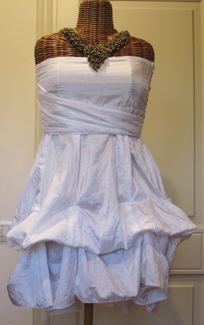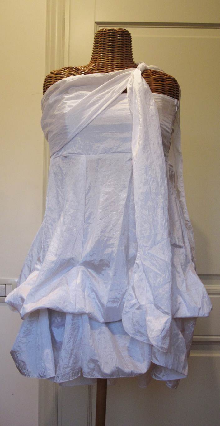 Nella parte interna della gonna sono presenti alcuni laccetti che, se annodati a due a due, possono formare un palloncino, se lasciati sciolti danno la possibilità di lasciare l’abito in forma lunga.