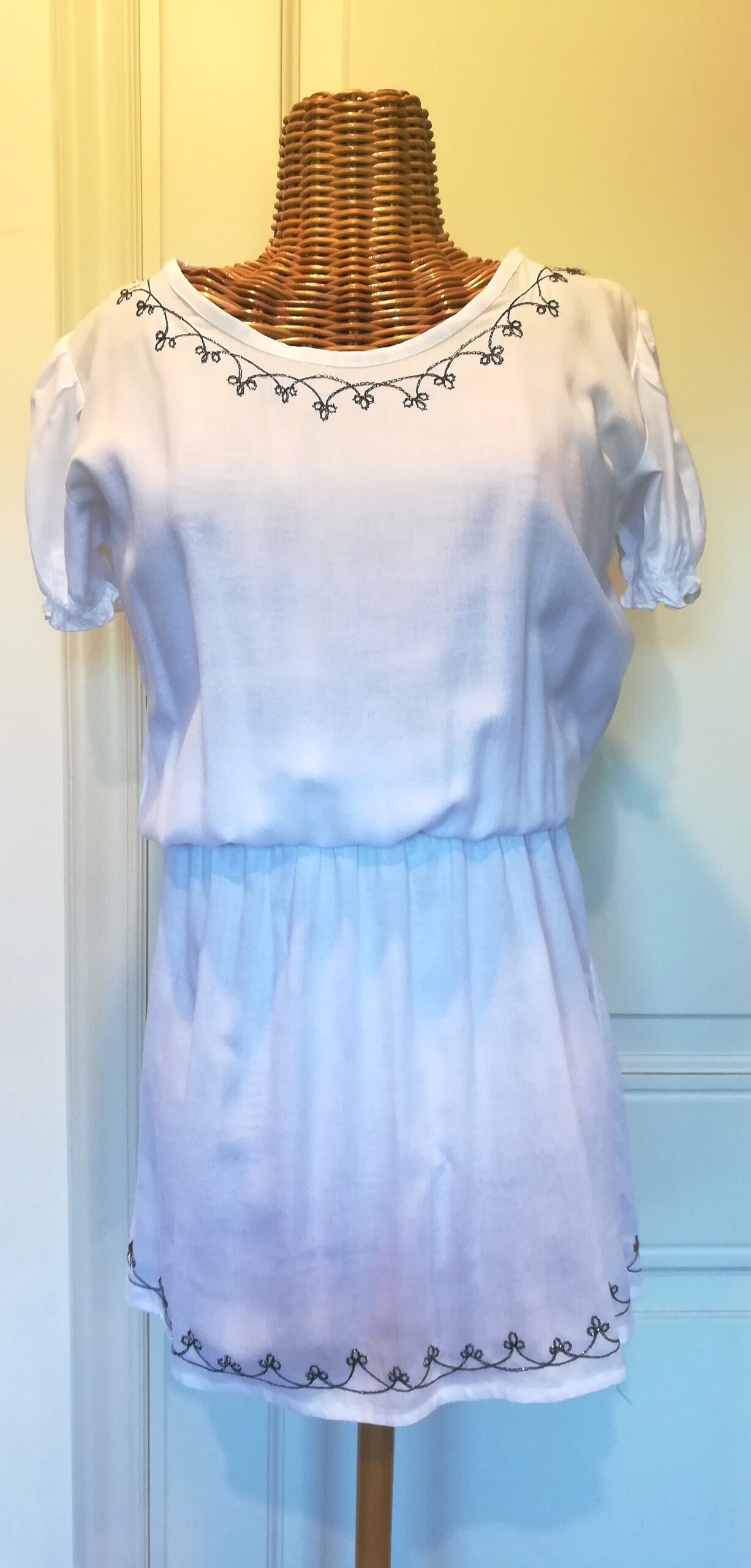 Abito indonesiano in cotone 100% di color bianco con ricami tipicamente orientali , con fascia elastica in vita . Taglia unica