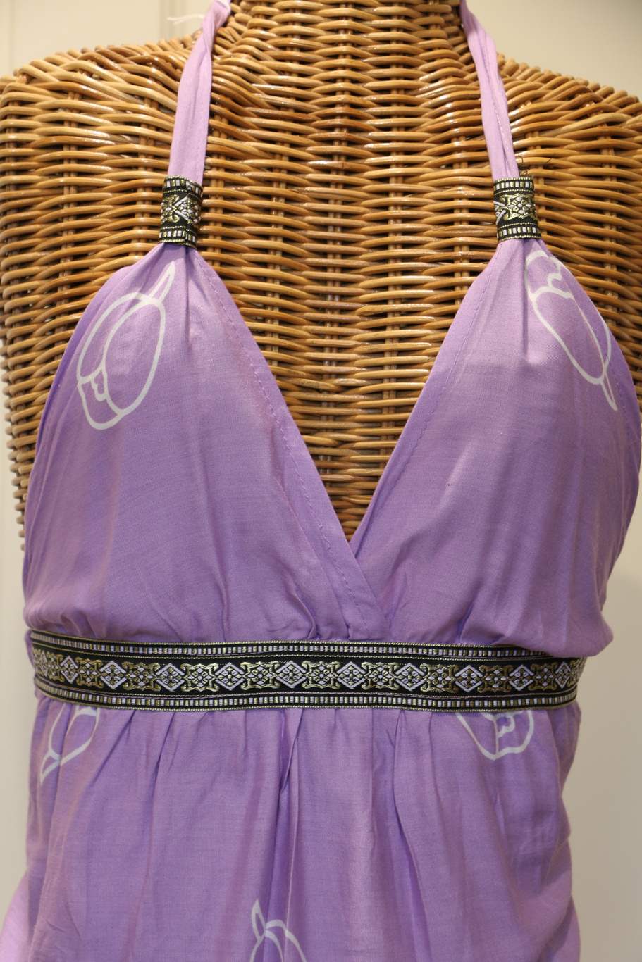 Abito lungo indonesiano senza maniche color lilla con fantasia a fiori, fascia sotto al seno e nido d’ape nella parte posteriore. Taglia unica.