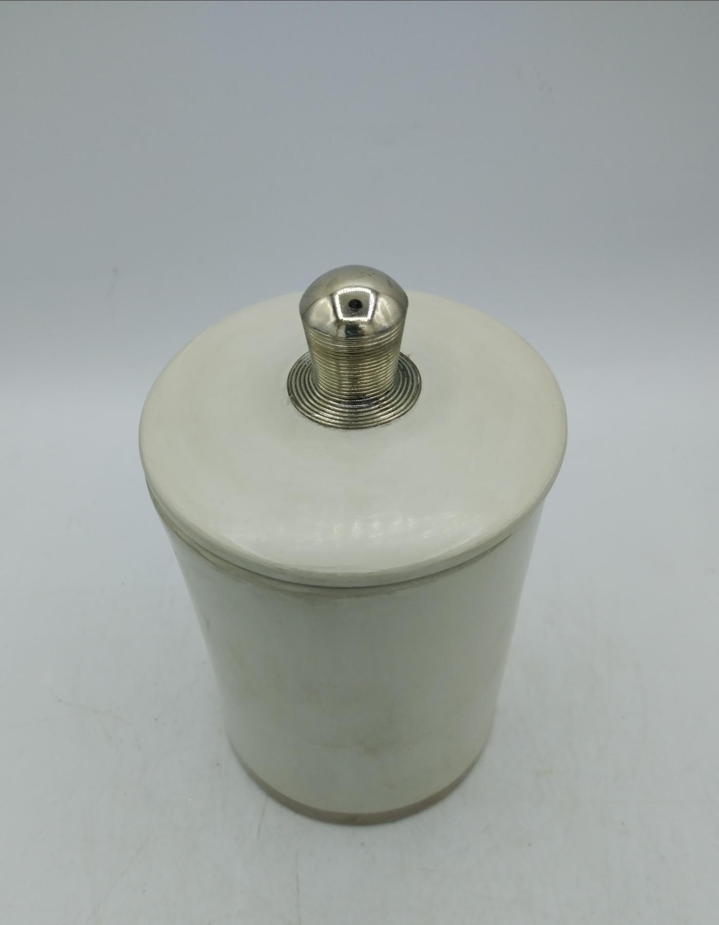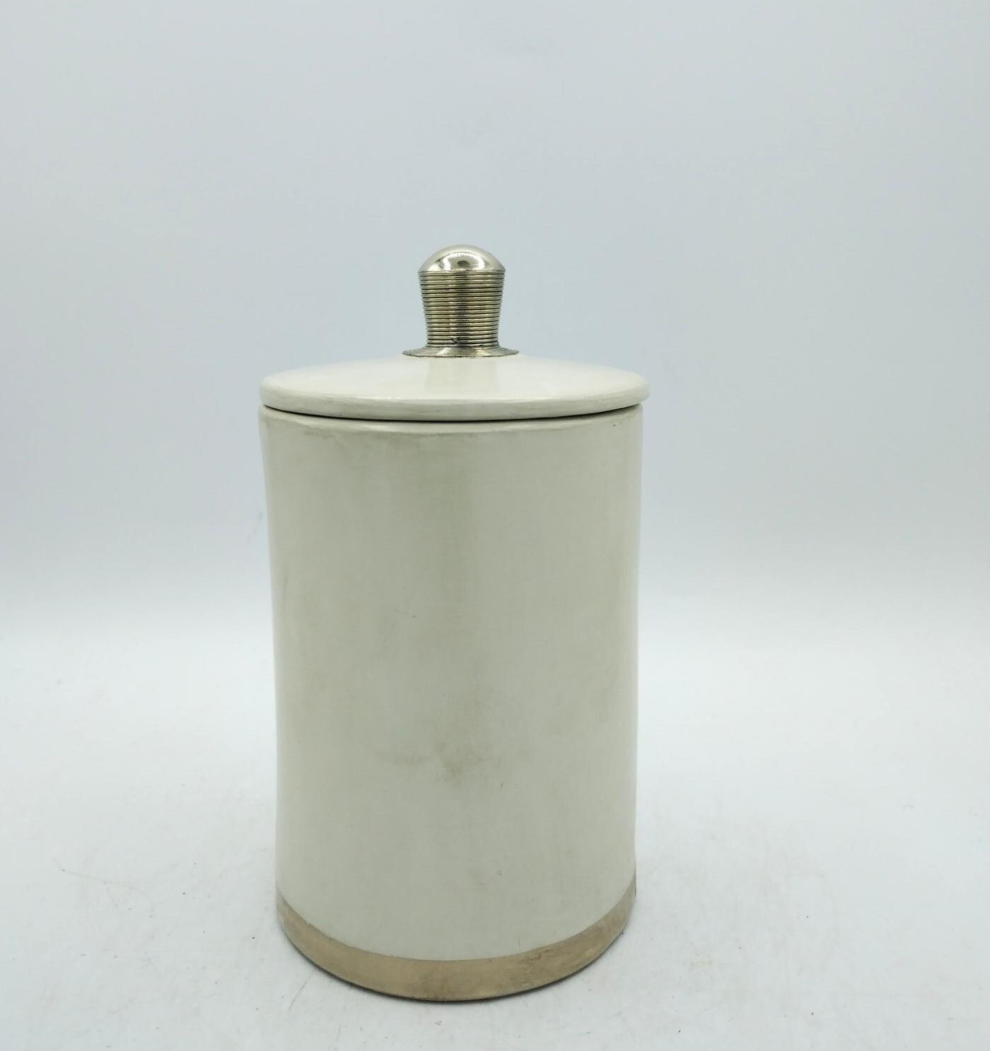Barattolo marocchino in tadelakt panna con pomello e bordo rifiniti in argentone, essendo un prodotto artigianale potrebbero esserci leggere imperfezioni