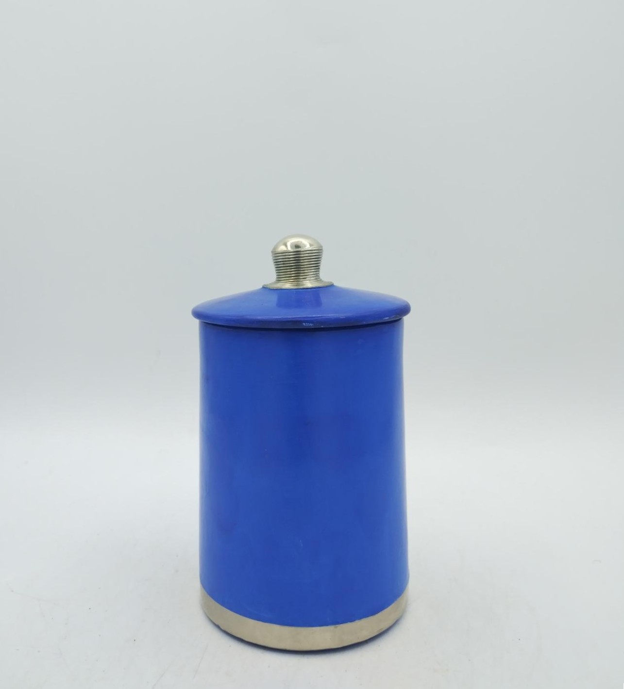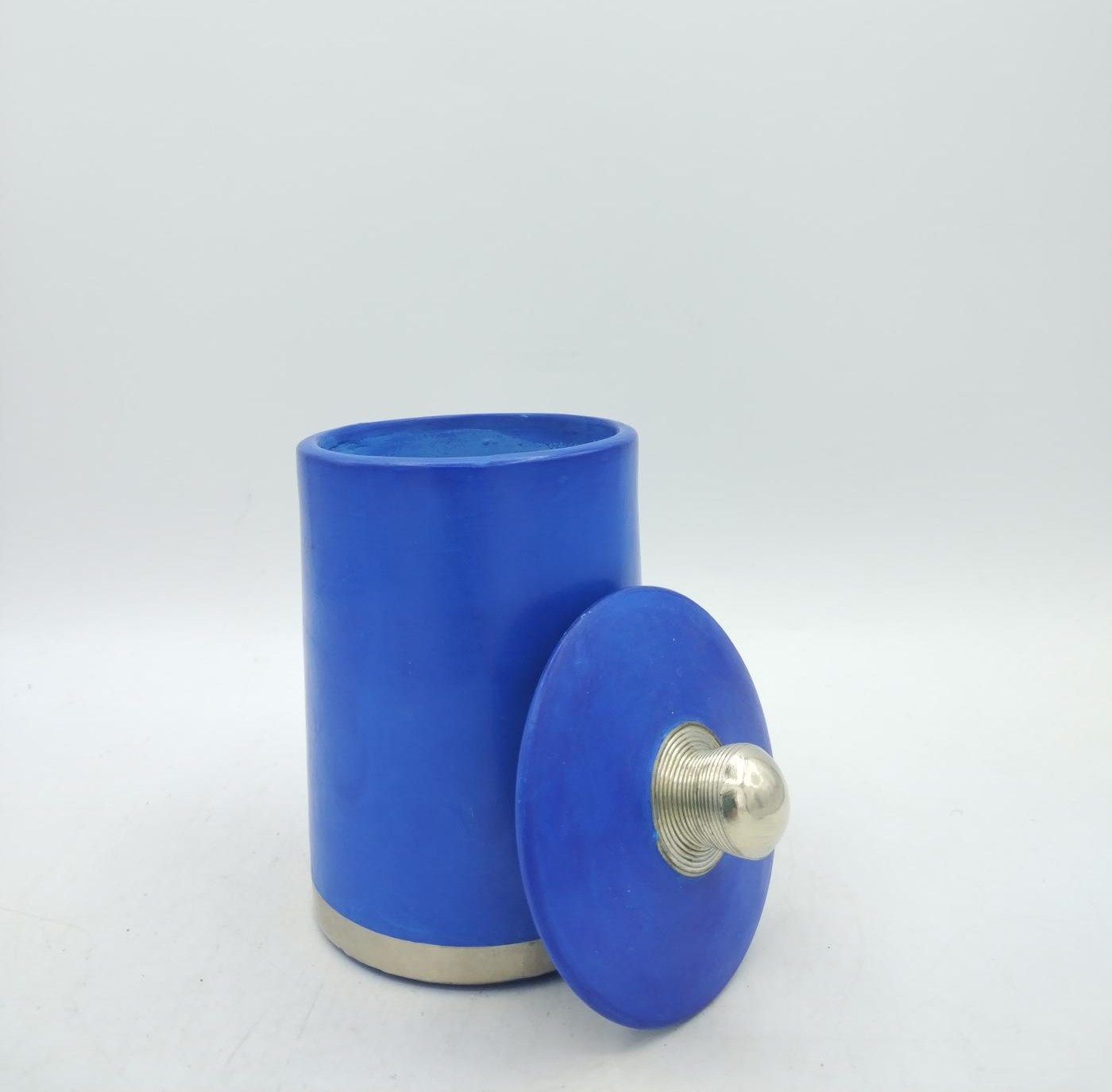 Barattolo marocchino in tadelakt blu con pomello e bordo rifiniti in argentone, essendo un prodotto artigianale potrebbero esserci leggere imperfezioni