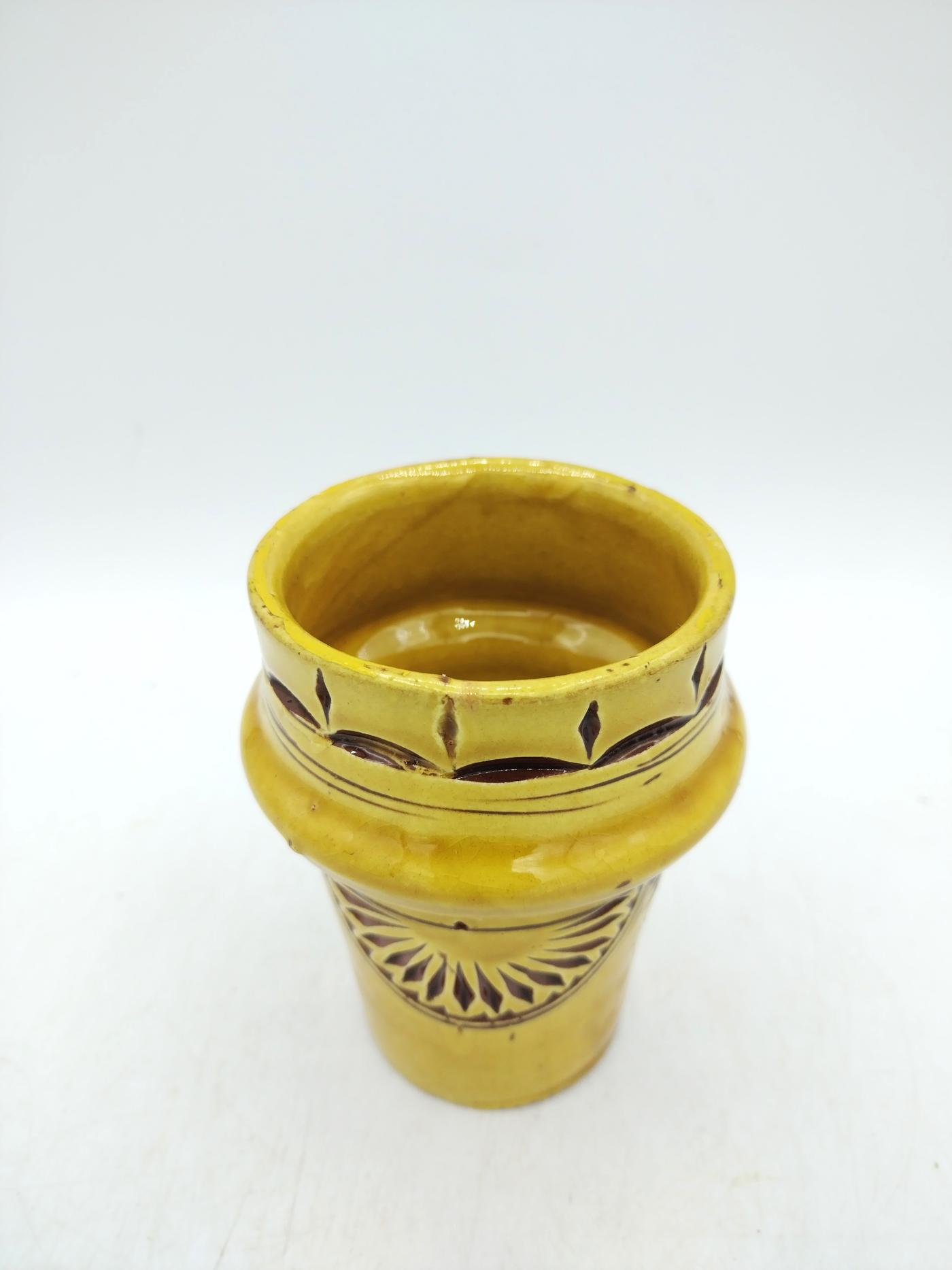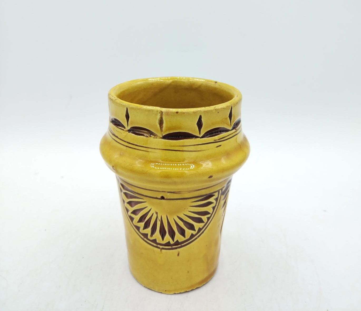 Bicchiere marocchino in terracotta smaltata ocra, decorato con incisioni.