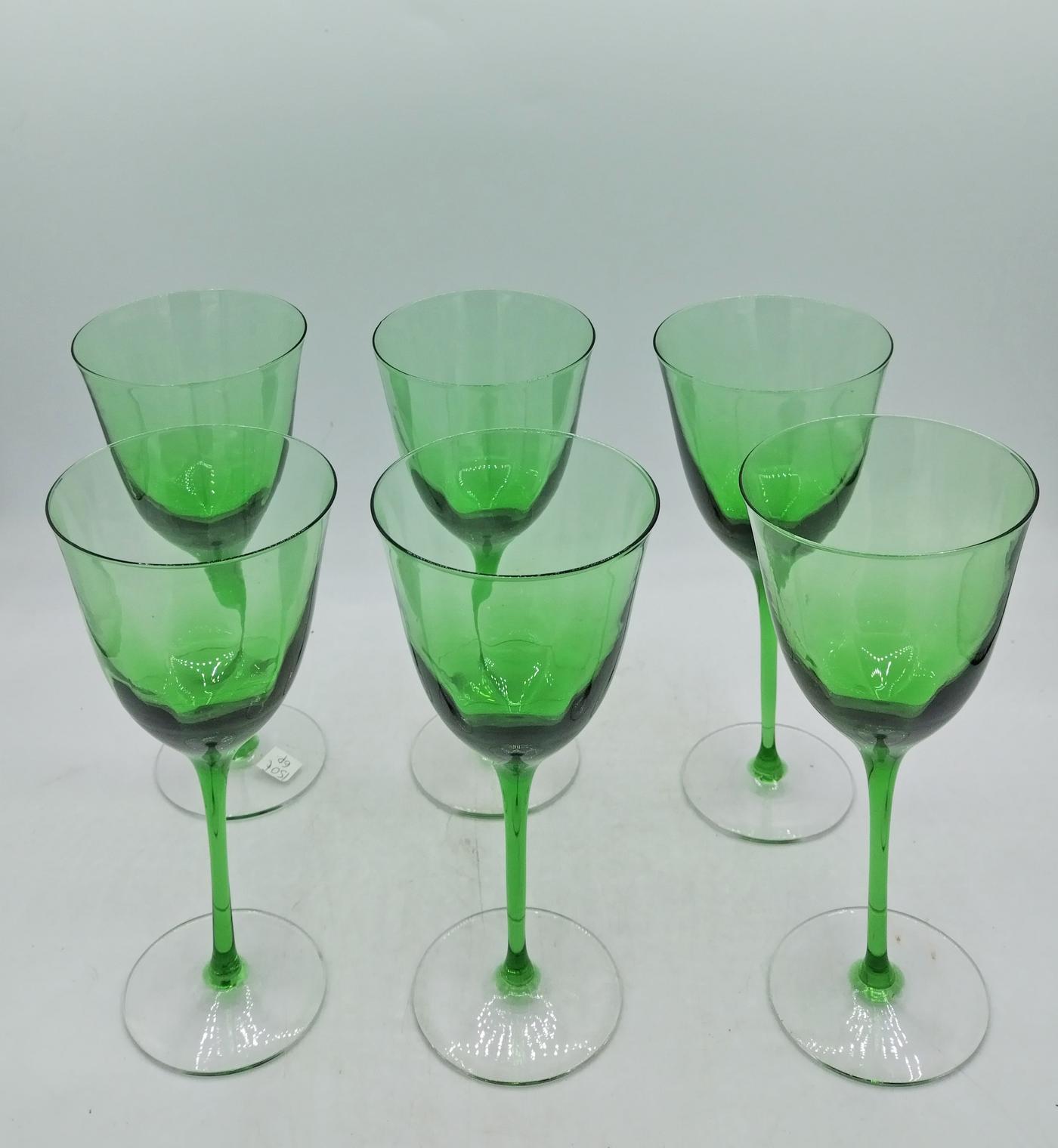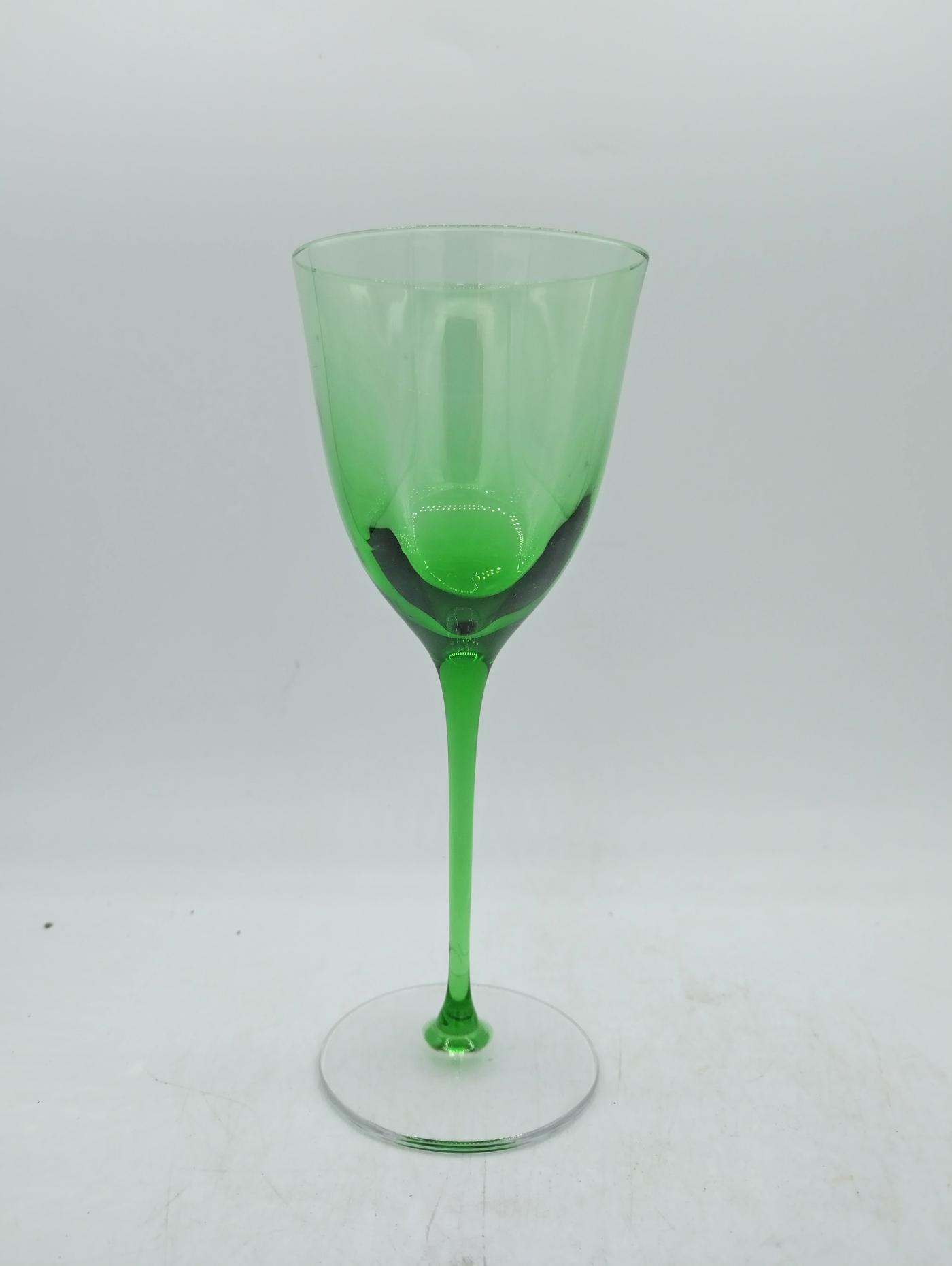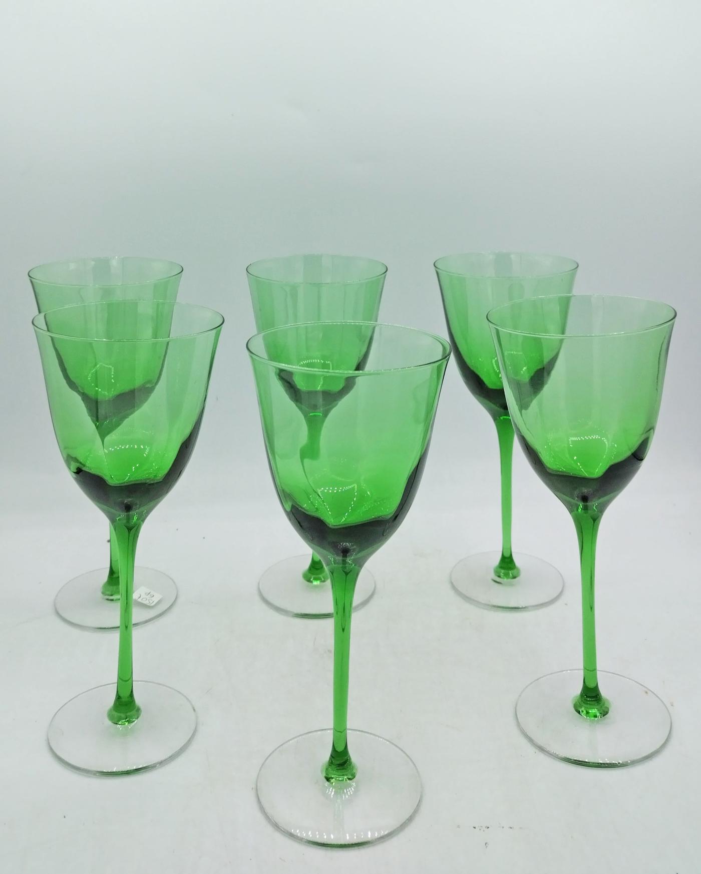Il set comprende sei calici color verde con gambo molto sottile dalla forma semplice e lineare, classica e moderna al tempo stesso.