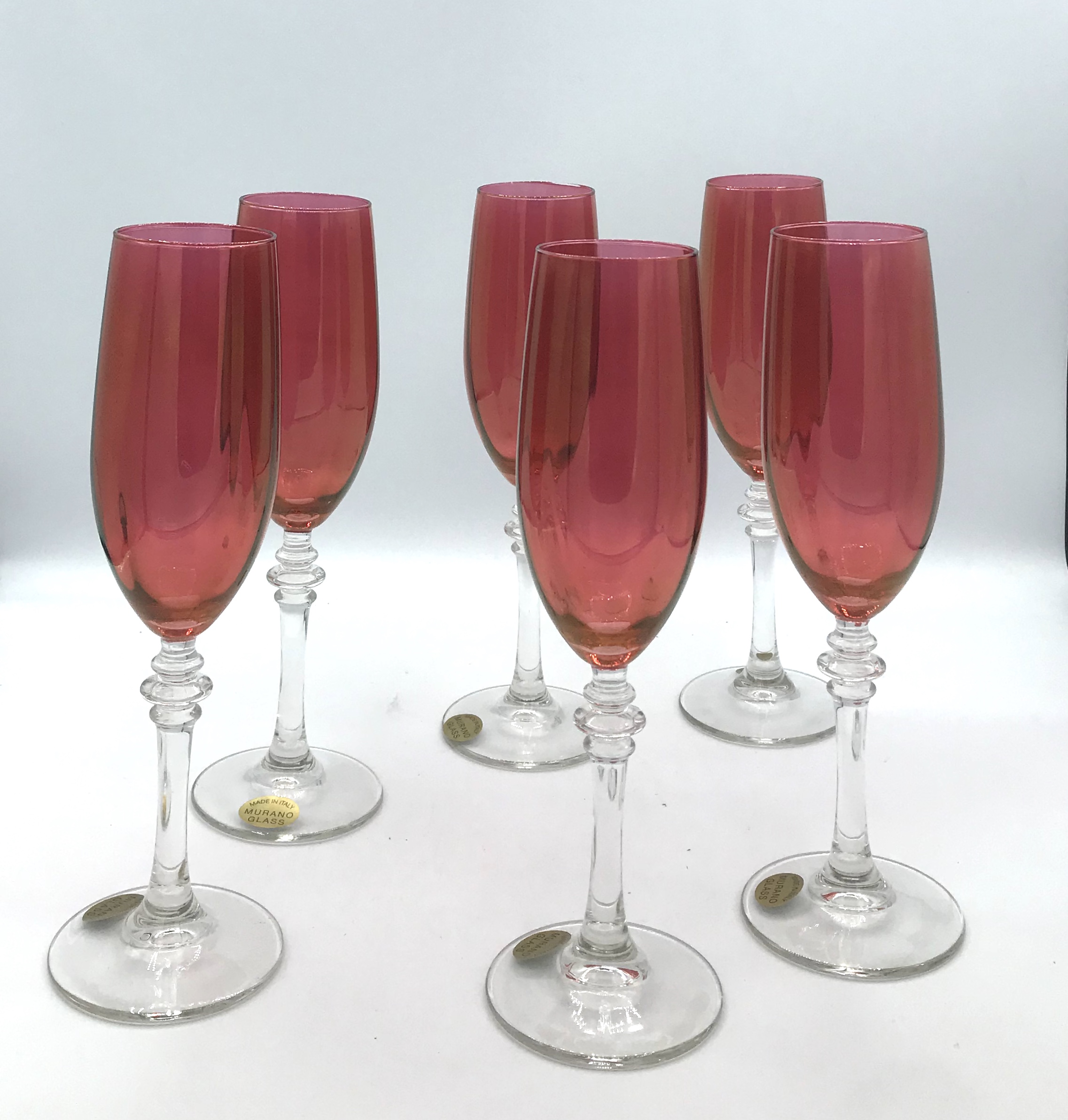 Flute modello “bolla” color rosso in vetro soffiato di Murano in scatola da sei pezzi