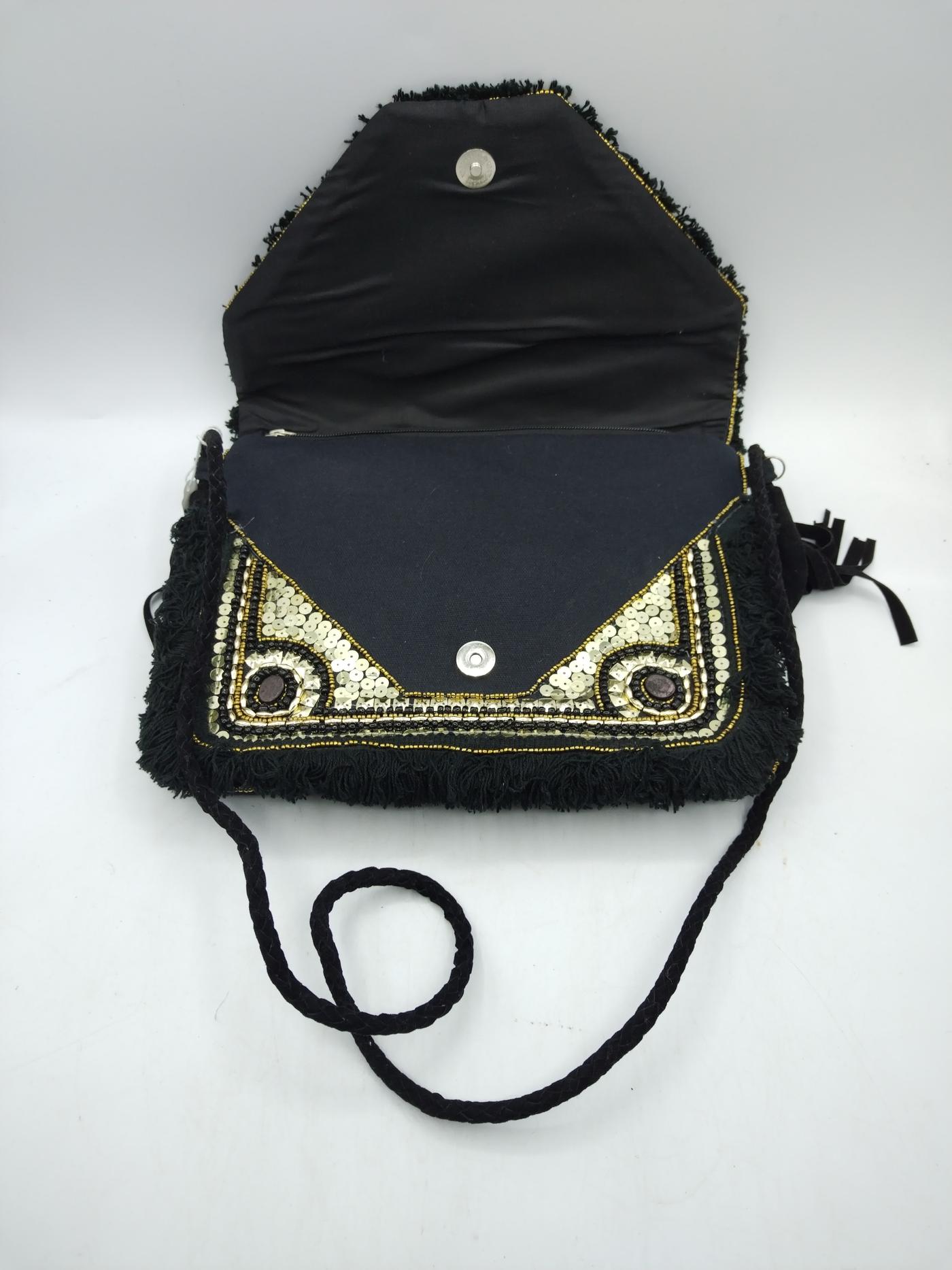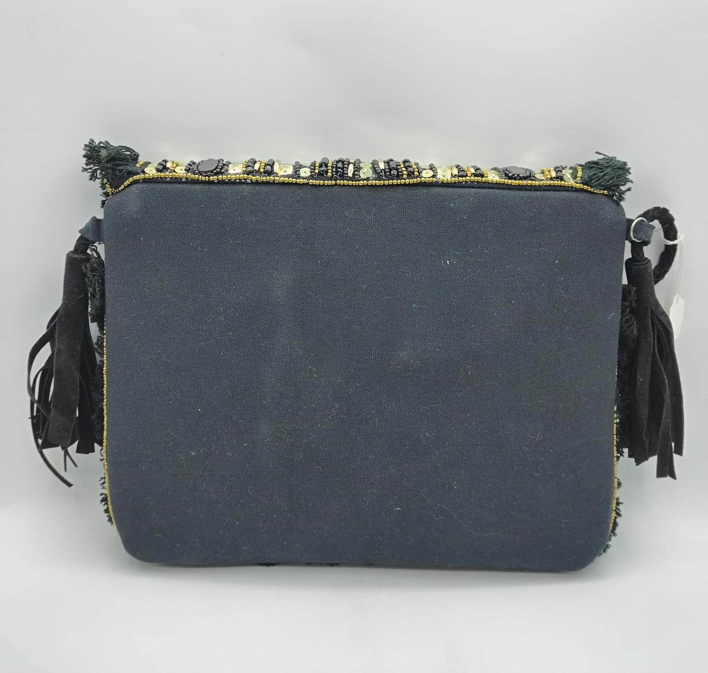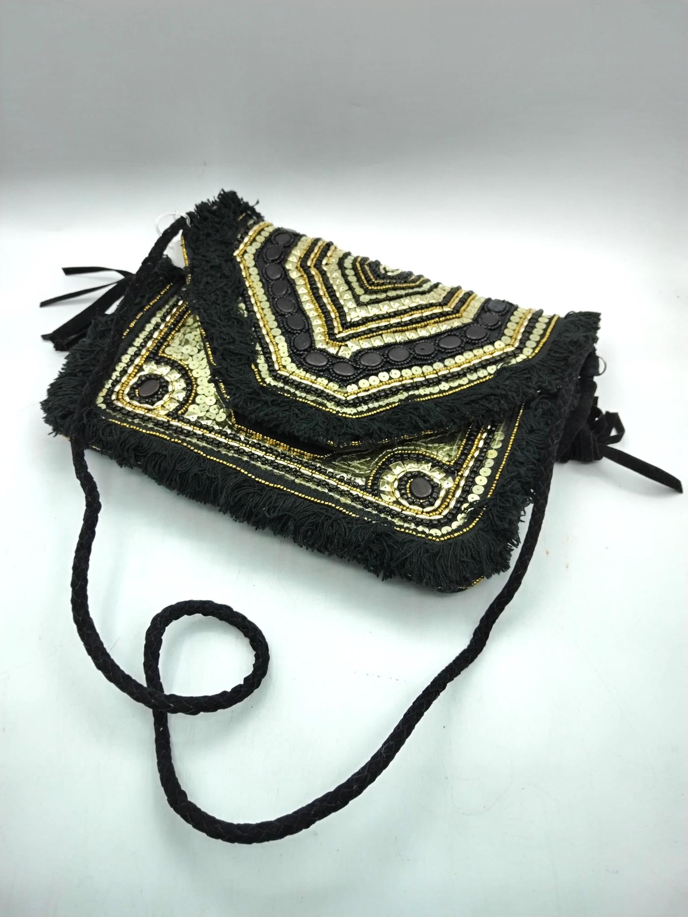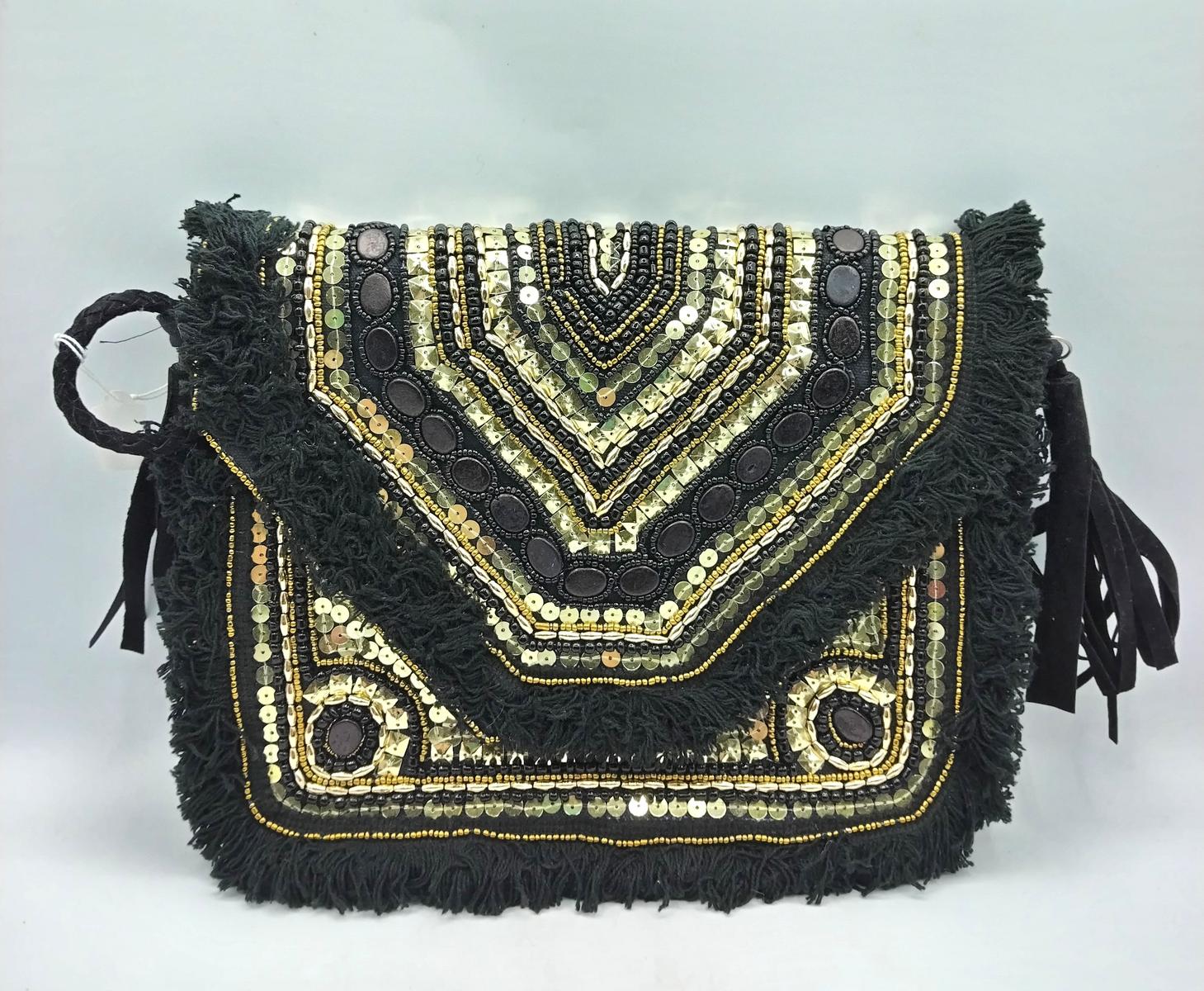 Borsa a tracolla indiana in cotone nero arricchita con pietre nere, perline oro, paillette e fili decorativi