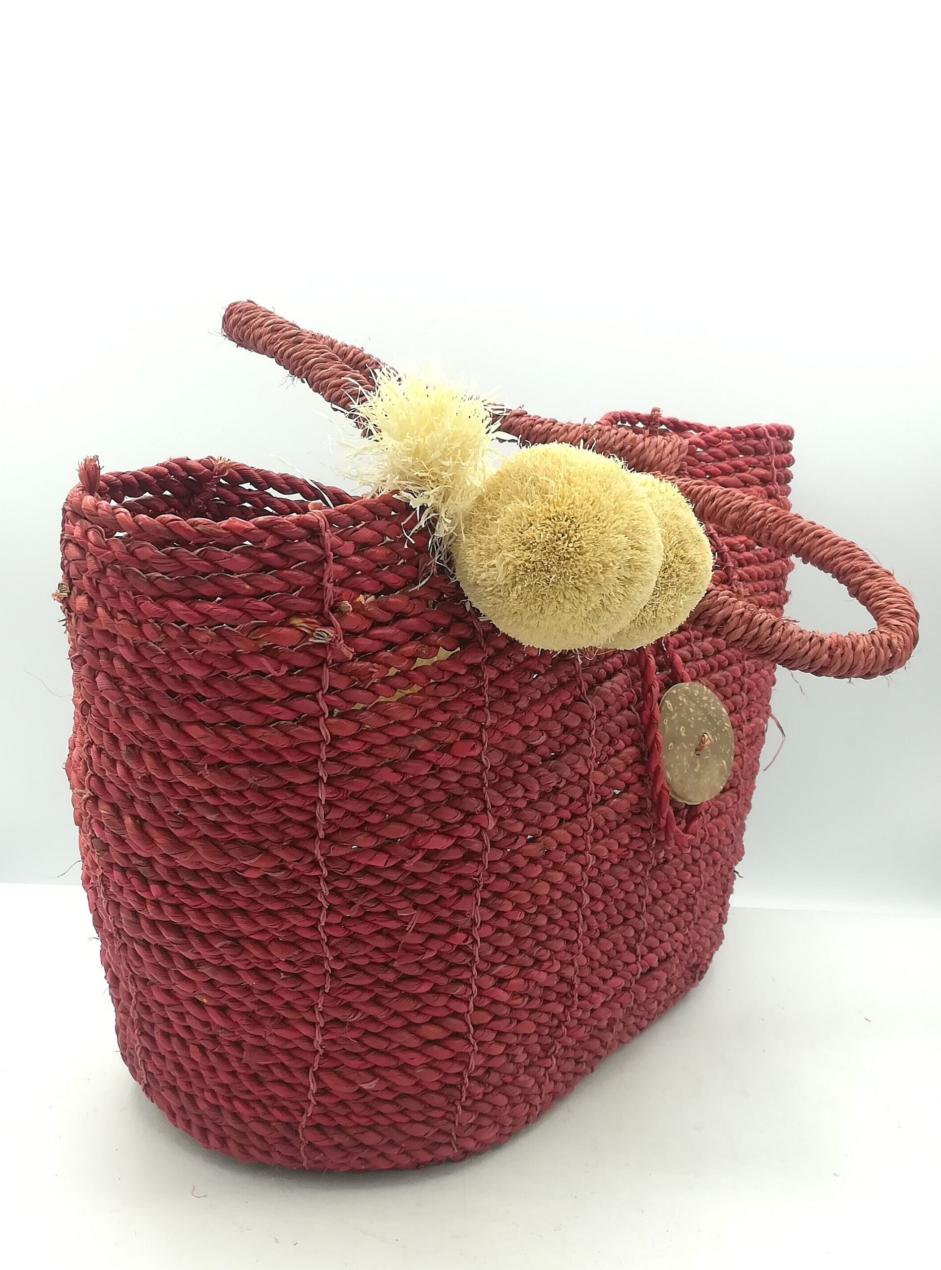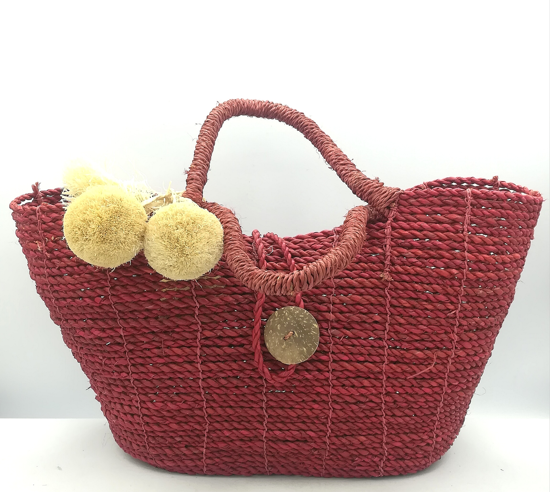 borsa realizzata in Indonesia in paglia rigida rossa, chiusura con bottone in cocco e manici corti