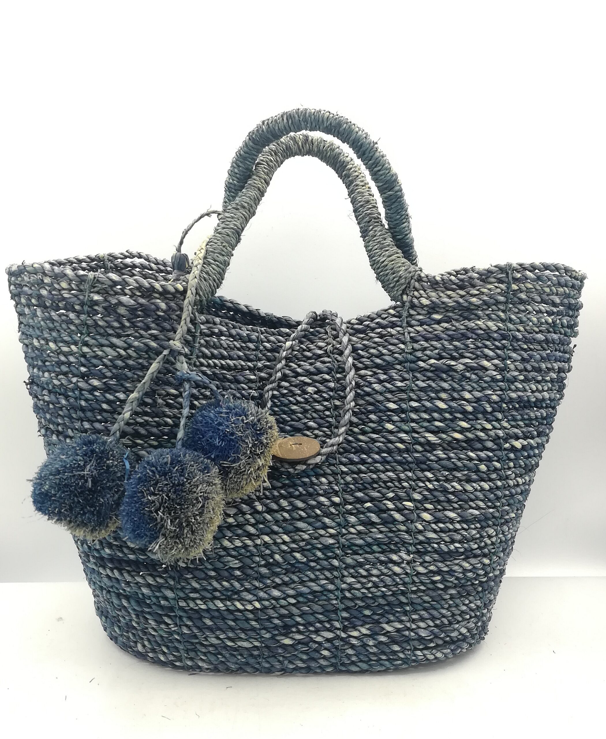 borsa realizzata in Indonesia in paglia rigida color azzurro con chiusura con bottone in cocco e manici corti