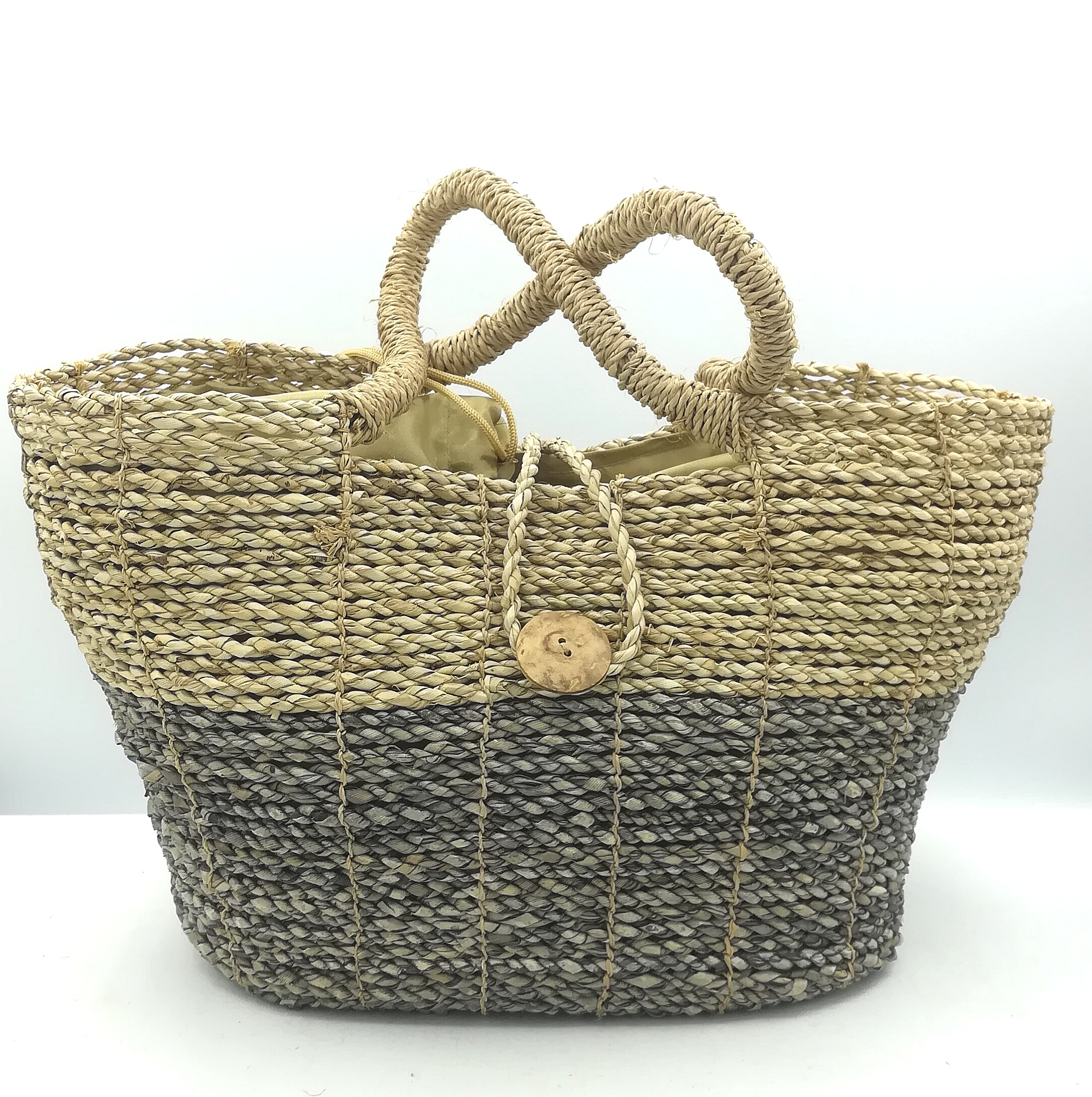 borsa realizzata in paglia rigida bicolor, naturale e scura, foderata in tessuto color verde chiaro-dorato, con delle tasche laterali per i documenti e il cellulare, chiusura interna a sacca ed esterna con bottone in cocco, manici corti