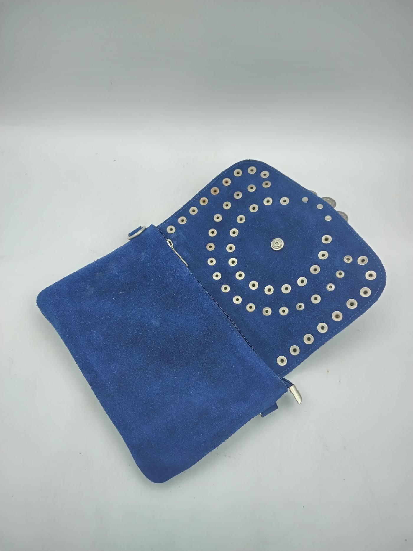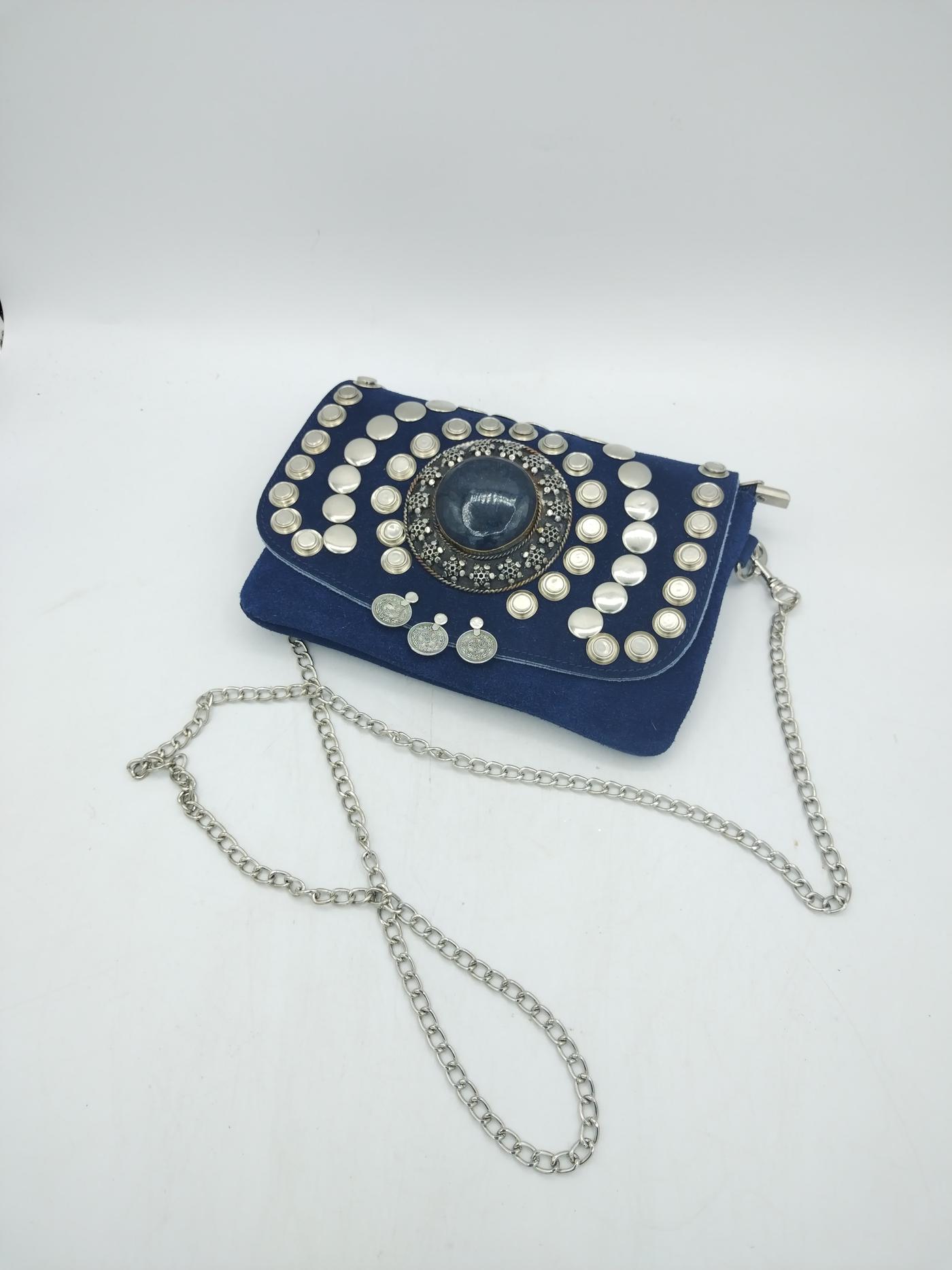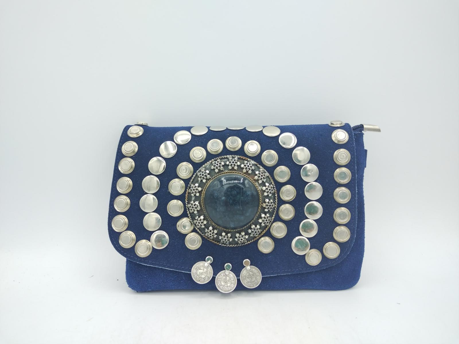 Borsetta marocchina in camoscio color blu con borchie in metallo e medaglione centrale decorato con scaglie di pietra colorate all’interno, tracolla in metallo