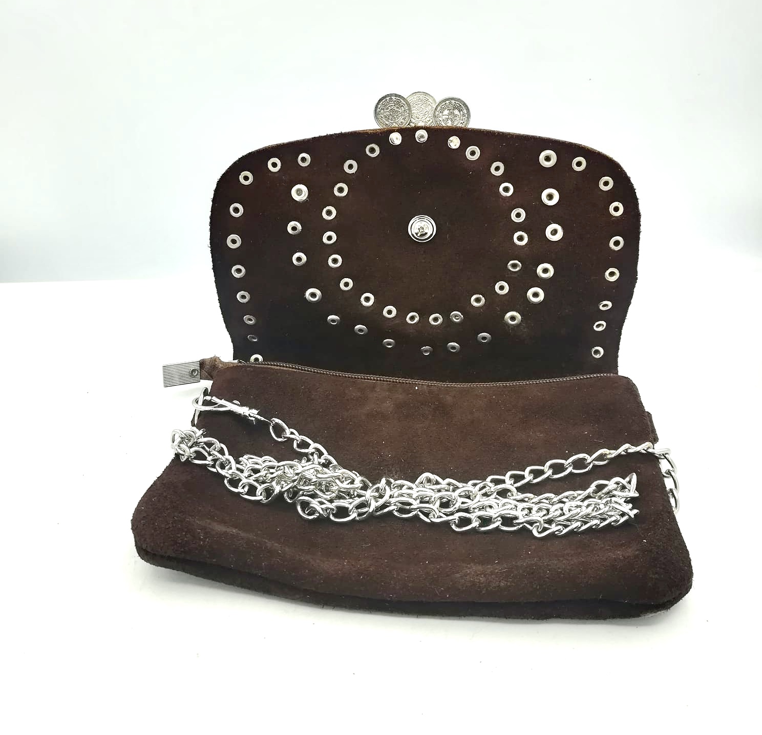 Borsetta marocchina in camoscio color testa di moro con borchie in metallo e medaglione centrale decorato con scaglie di pietra colorate all’interno, tracolla in metallo