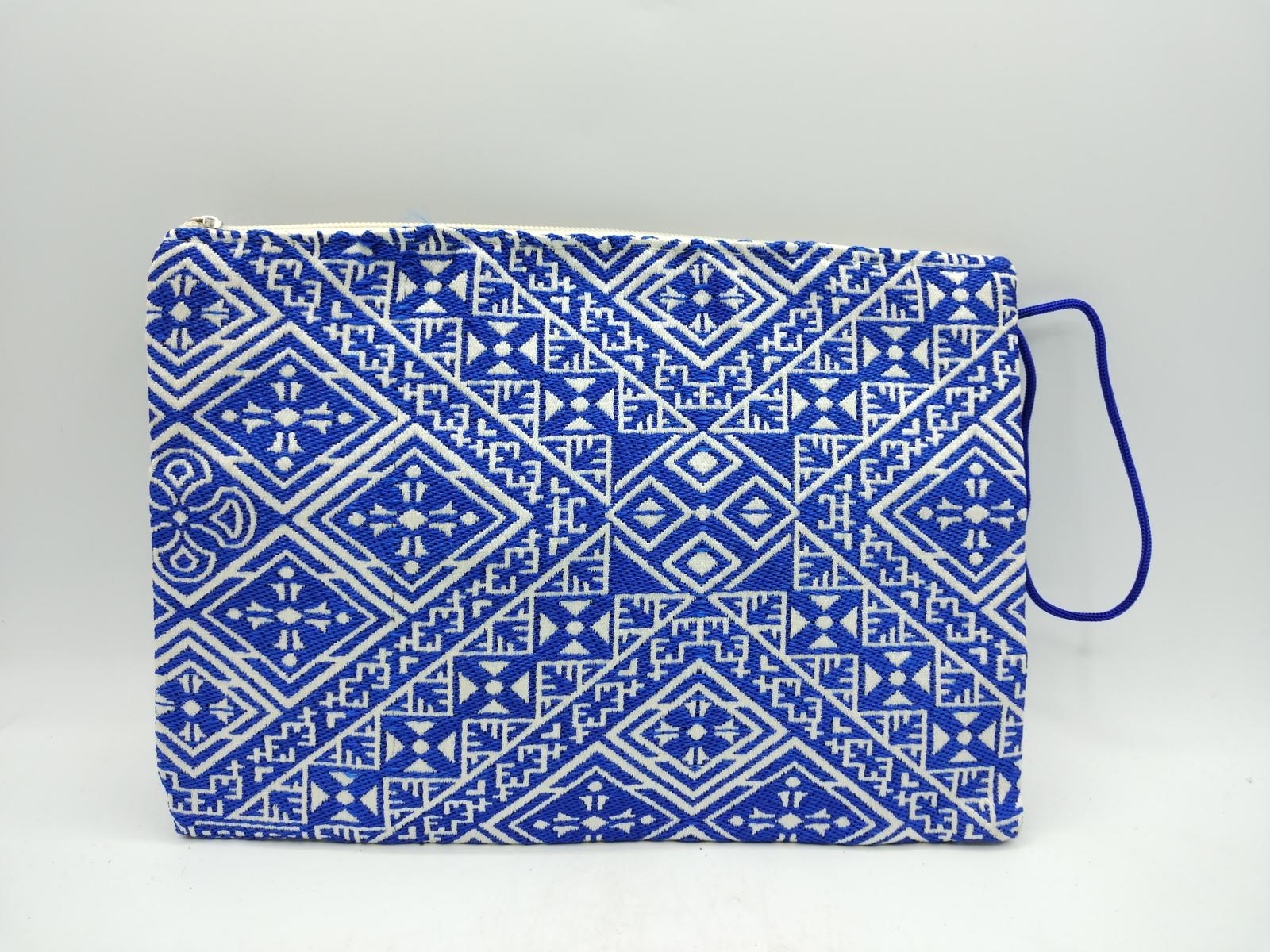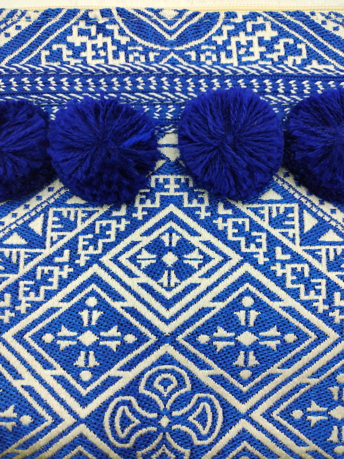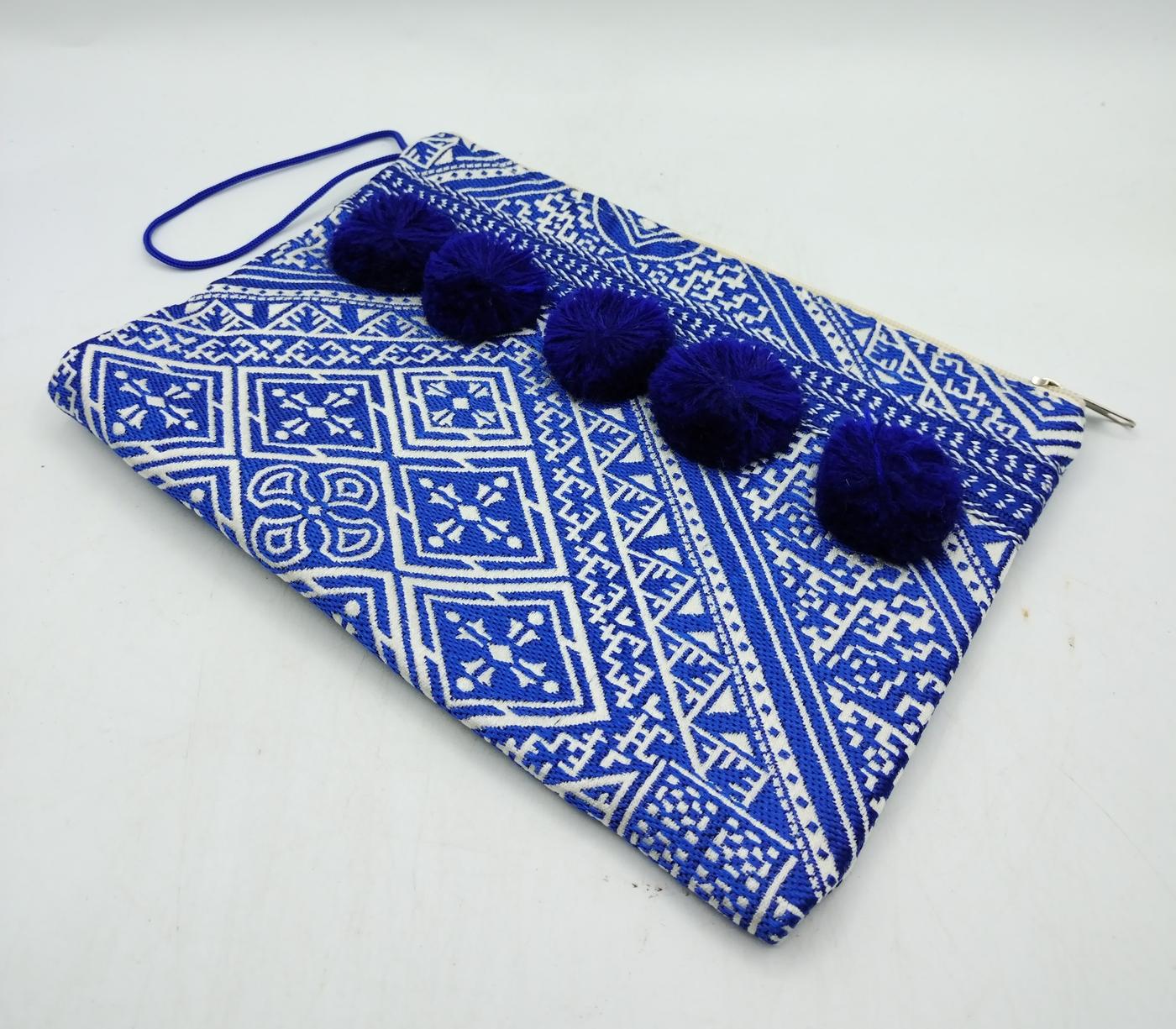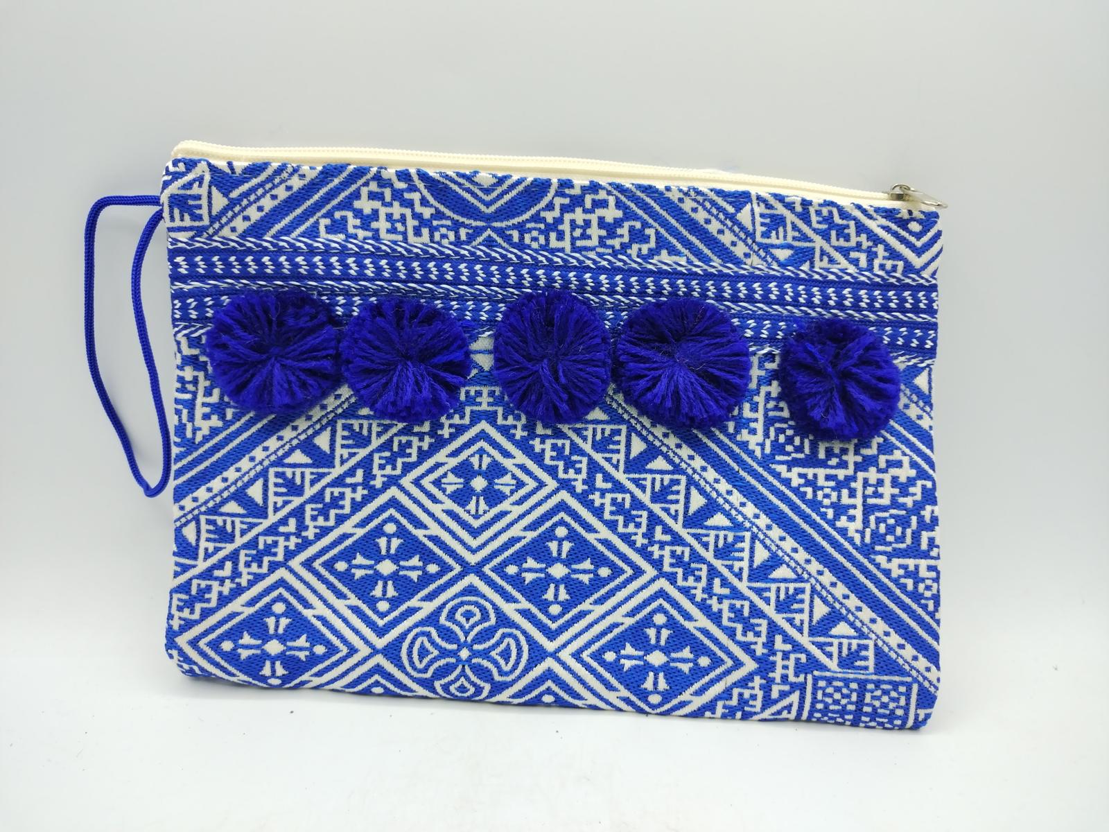E’ una pochette in cotone bianco e blu, ricamata con disegni orientaleggianti, impreziosita da cinque divertenti Pon Pon blu, con piccolo laccetto laterale dello stesso colore e cerniera per chiuderla.