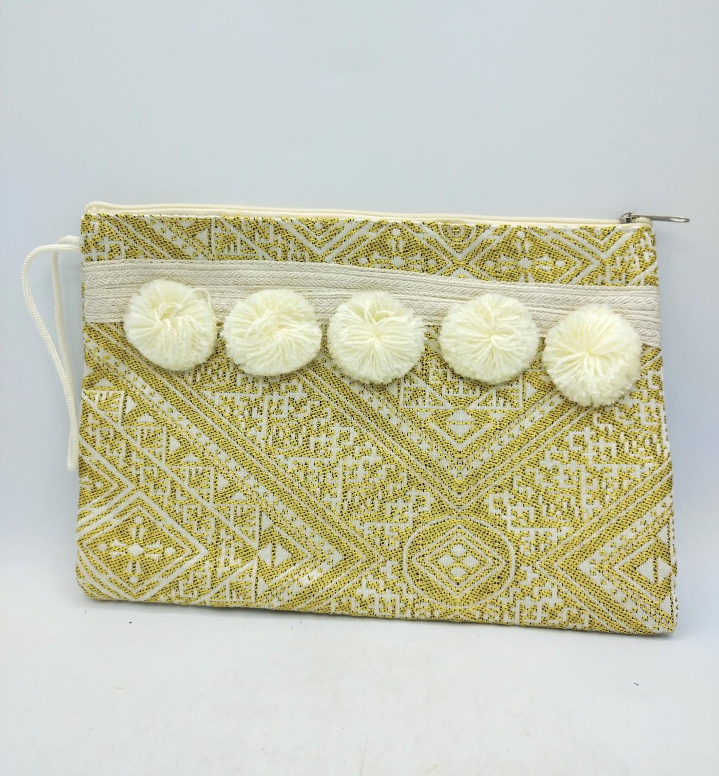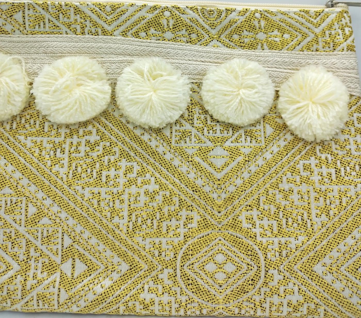 E’ una pochette in cotone color oro e panna, ricamata con disegni orientaleggianti, impreziosita da cinque divertenti Pon Pon panna, con piccolo laccetto laterale dello stesso colore e cerniera per chiuderla.