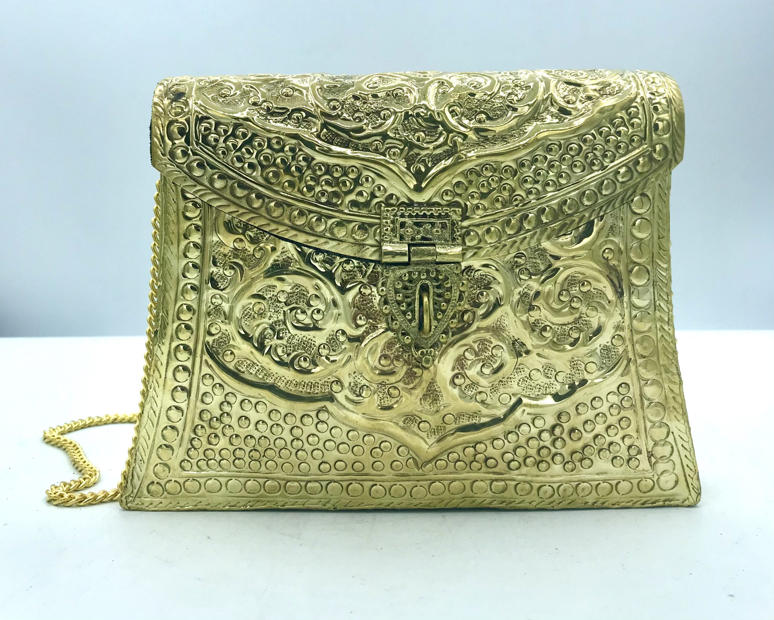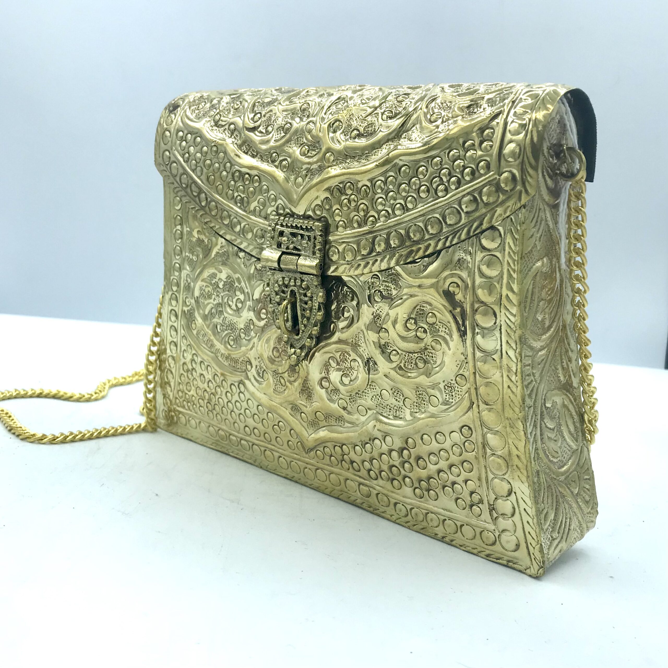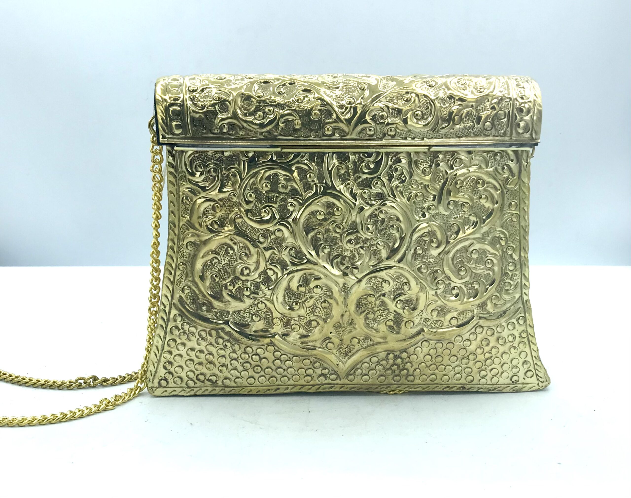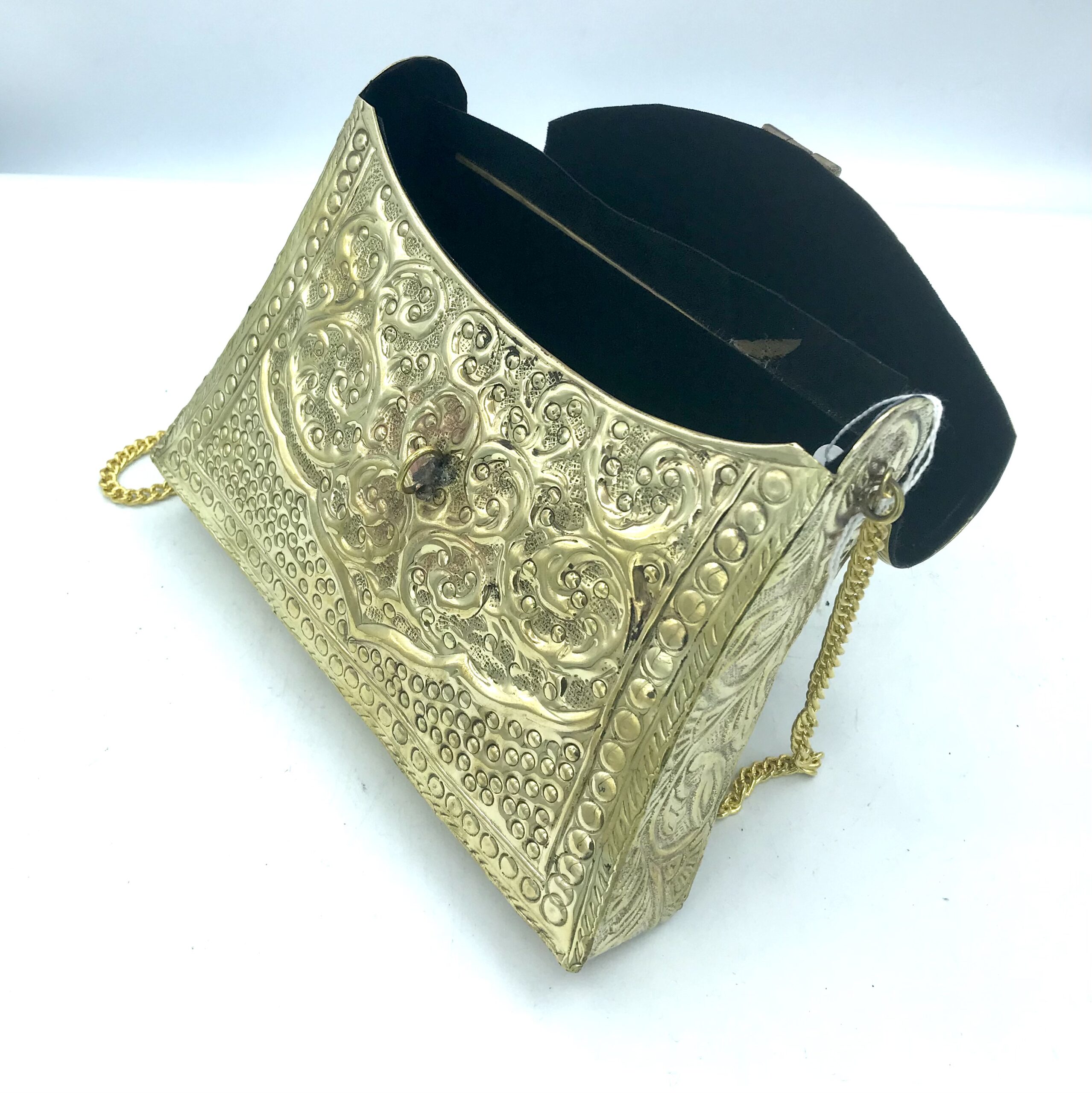 Borsetta a tracolla indiana in metallo dorato con incise decorazioni floreali e tracolla in metallo dorato, interno foderato in tessuto di velluto nero