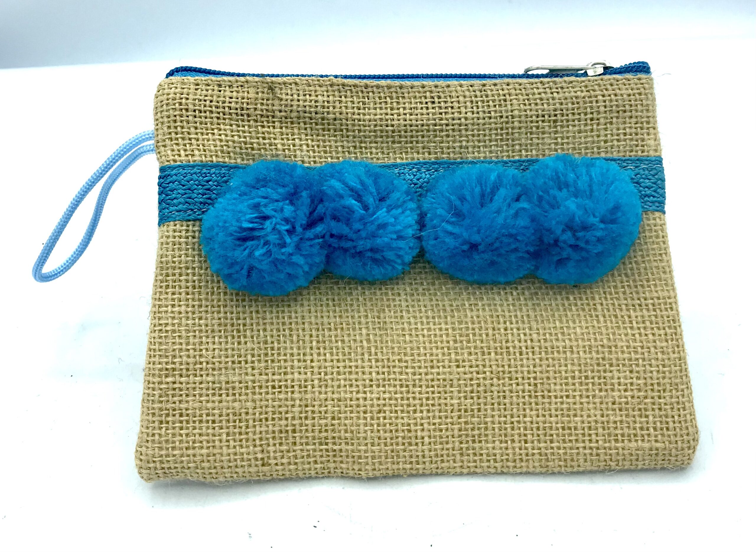 borsetta in juta naturale decorata con Pon Pon azzurri, con laccetto laterale e cerniera