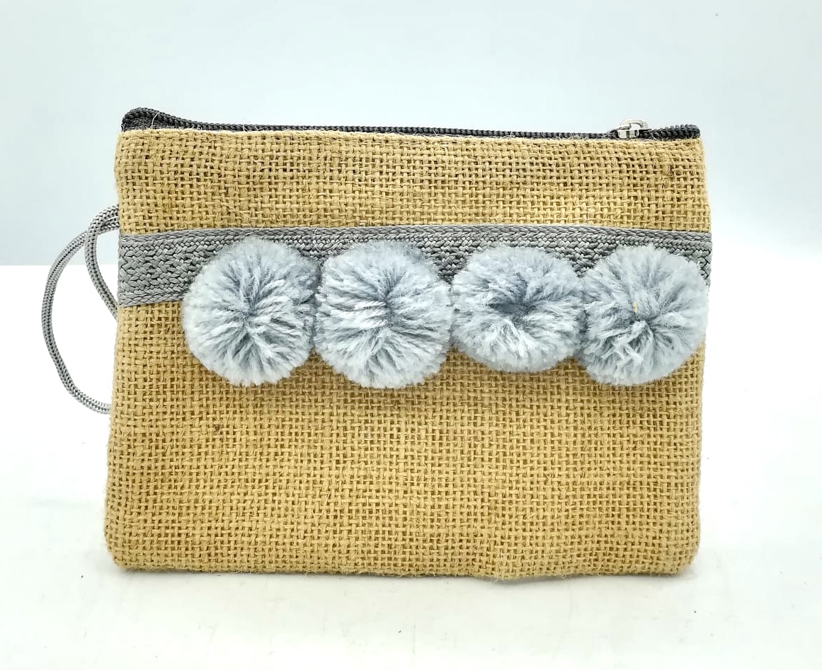 E’ una sacchetta di misura media in juta naturale impreziosita da un nastrino ornato da 4 divertenti Pon Pon color grigio, con laccetto laterale dello stesso colore e cerniera per chiuderla.
