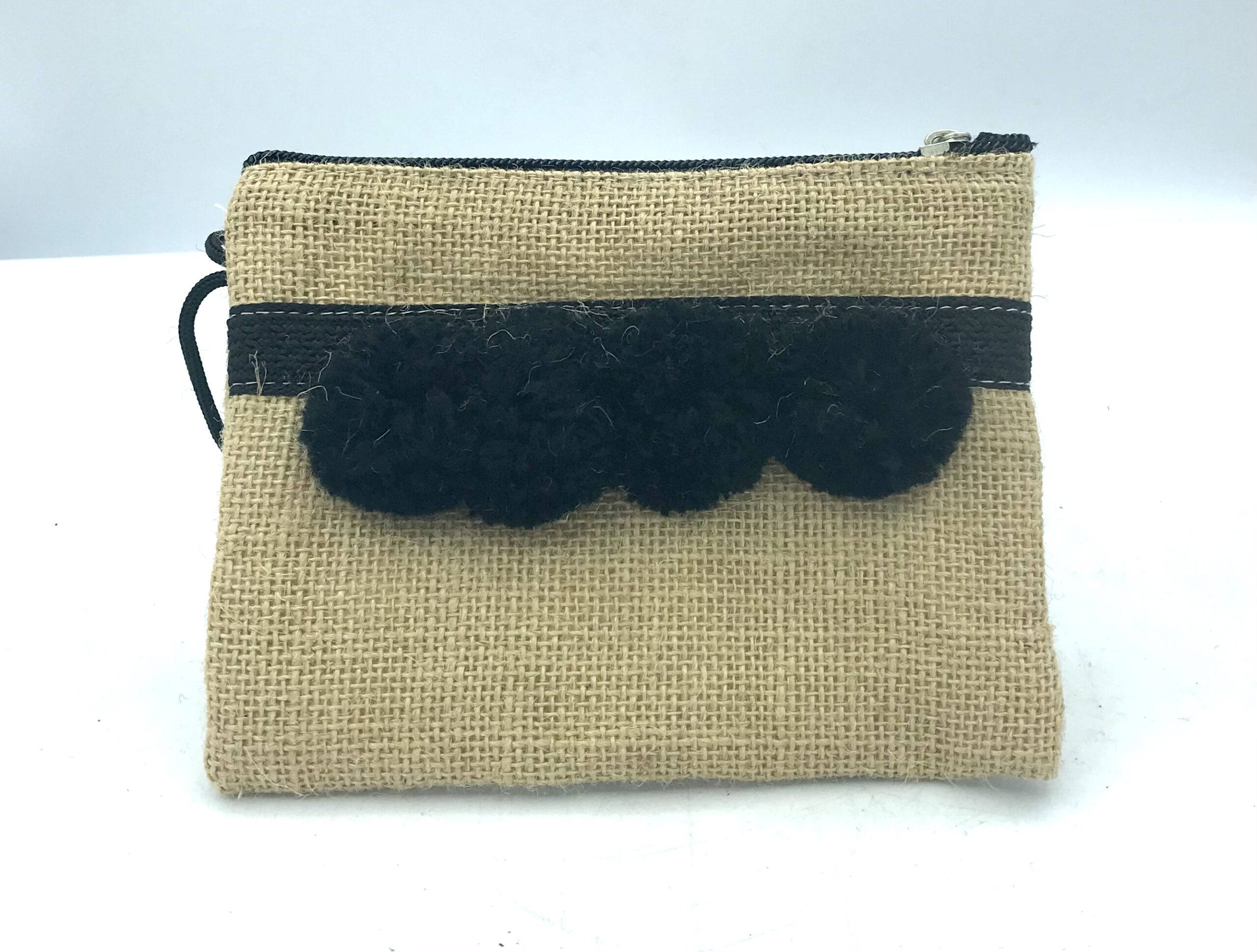 borsetta di juta naturale decorata con Pon Pon neri, con laccetto nero e cerniera