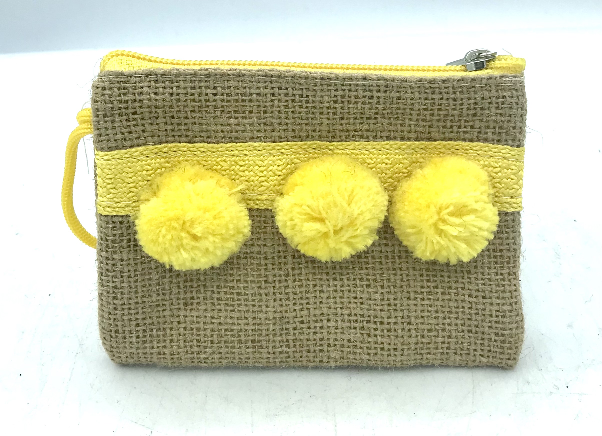 E’ una piccola sacchetta in juta naturale impreziosita da un nastrino ornato da 3 divertenti Pon Pon gialli, con laccetto laterale dello stesso colore e cerniera per chiuderla.