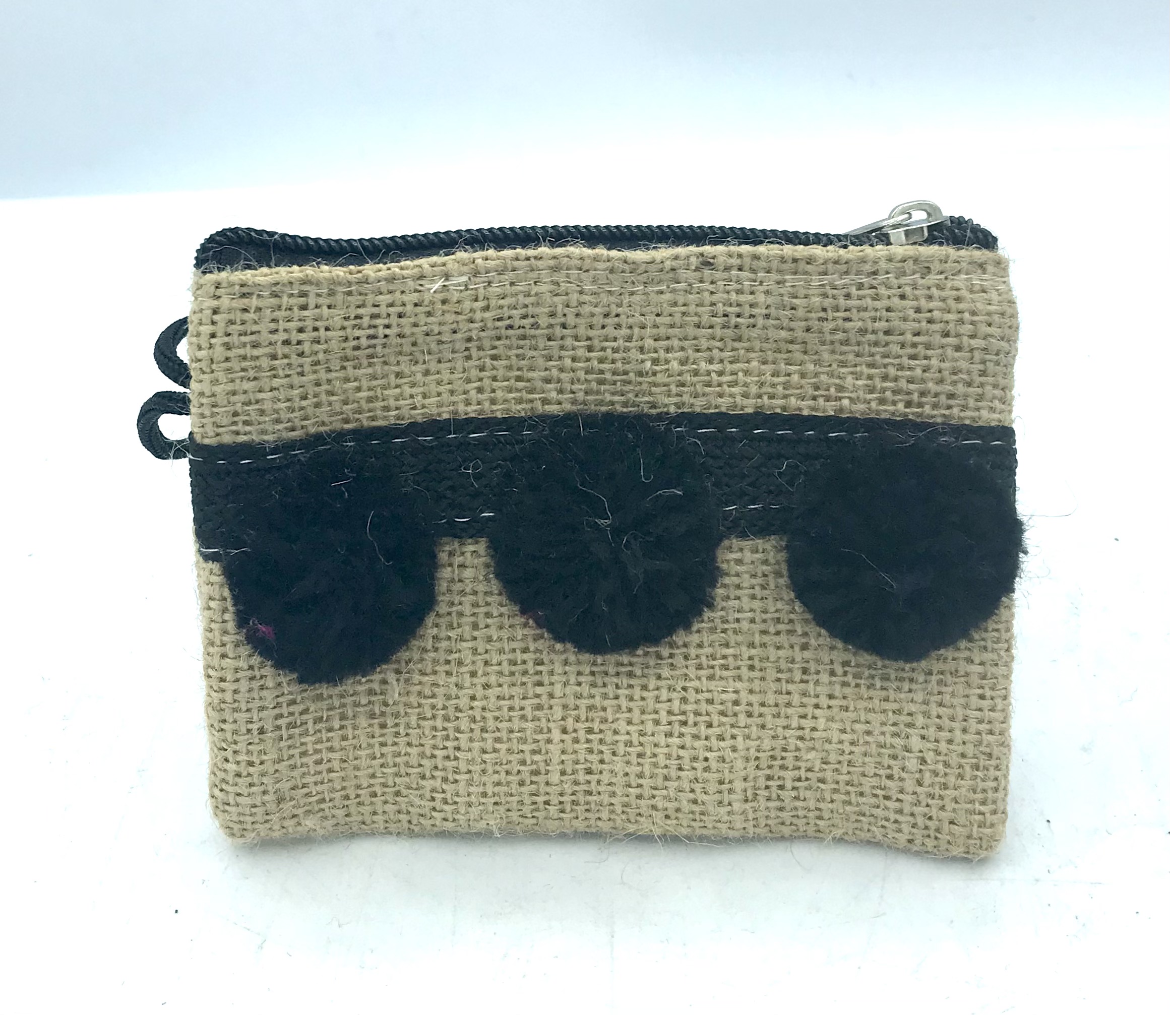 E’ una piccola sacchetta in juta naturale impreziosita da un nastrino ornato da 3 divertenti Pon Pon neri, con laccetto laterale dello stesso colore e cerniera per chiuderla.