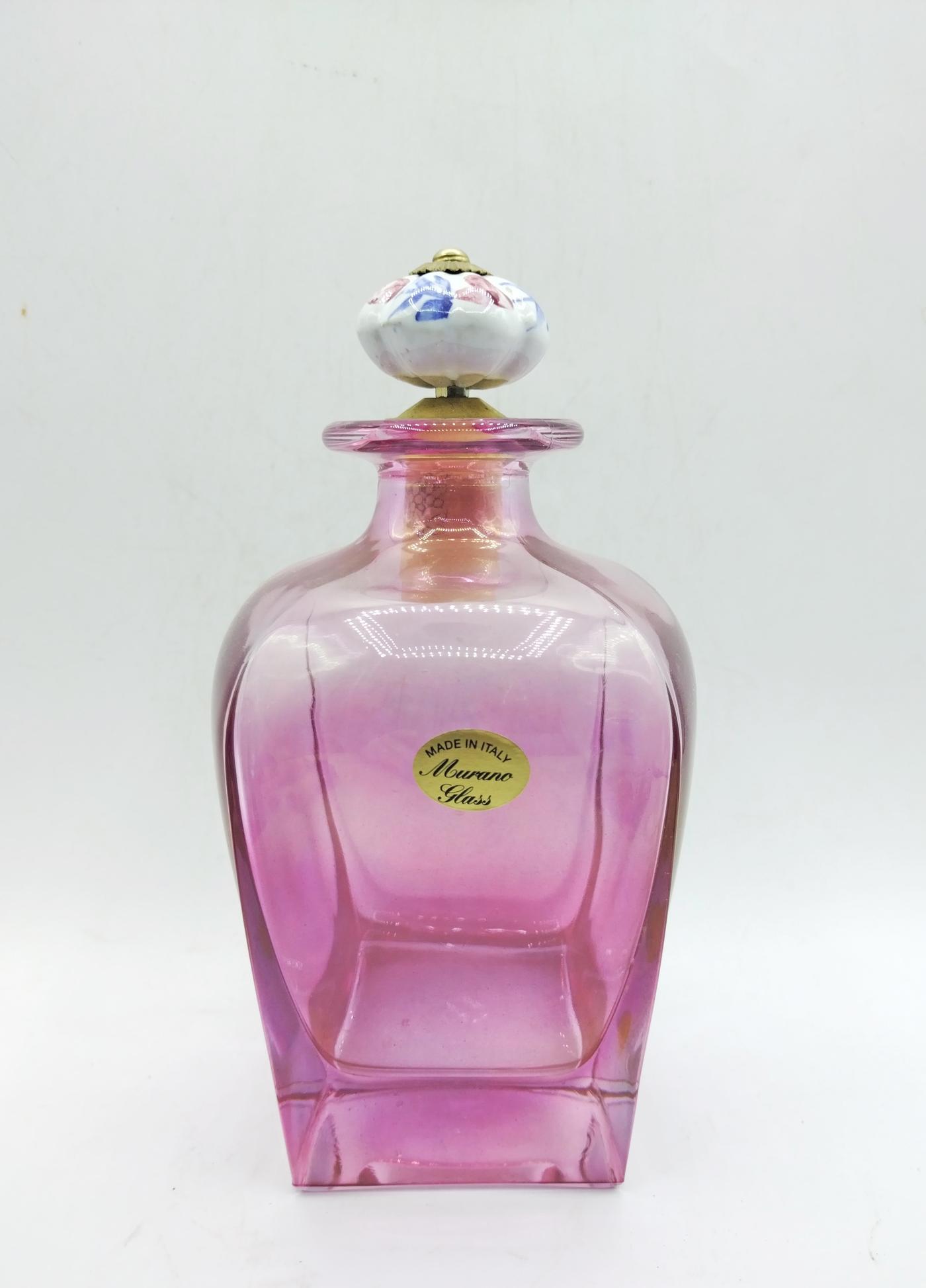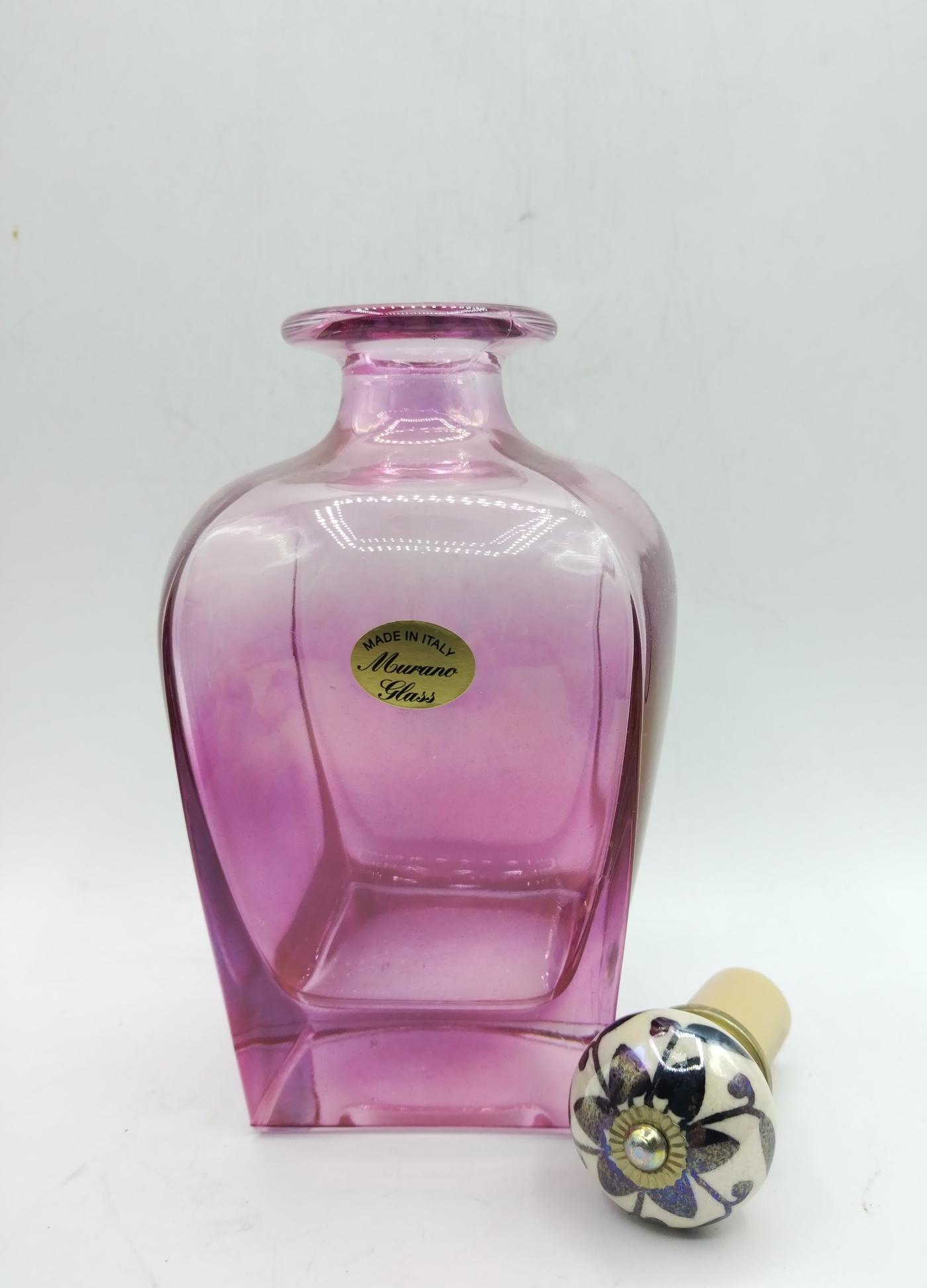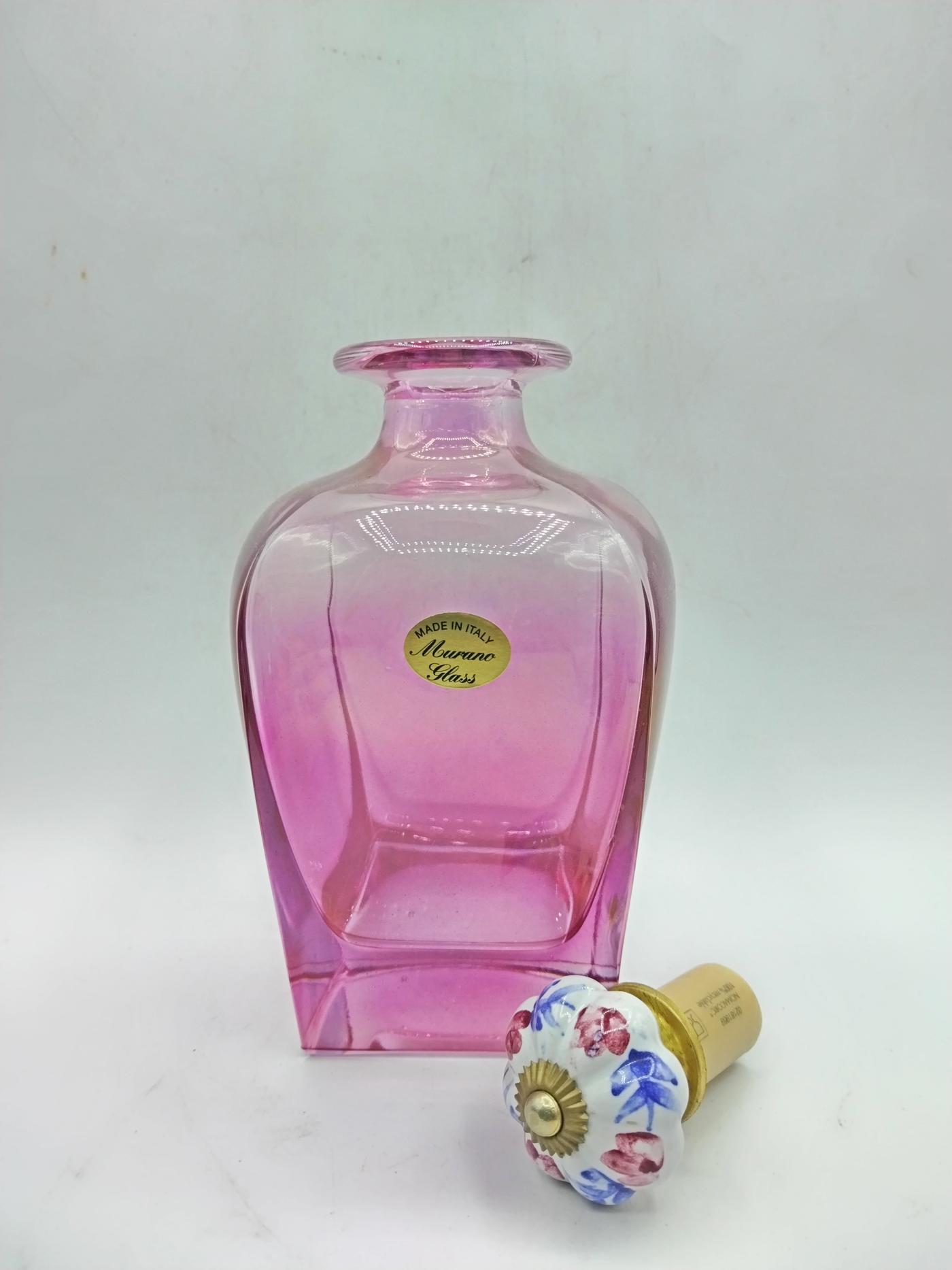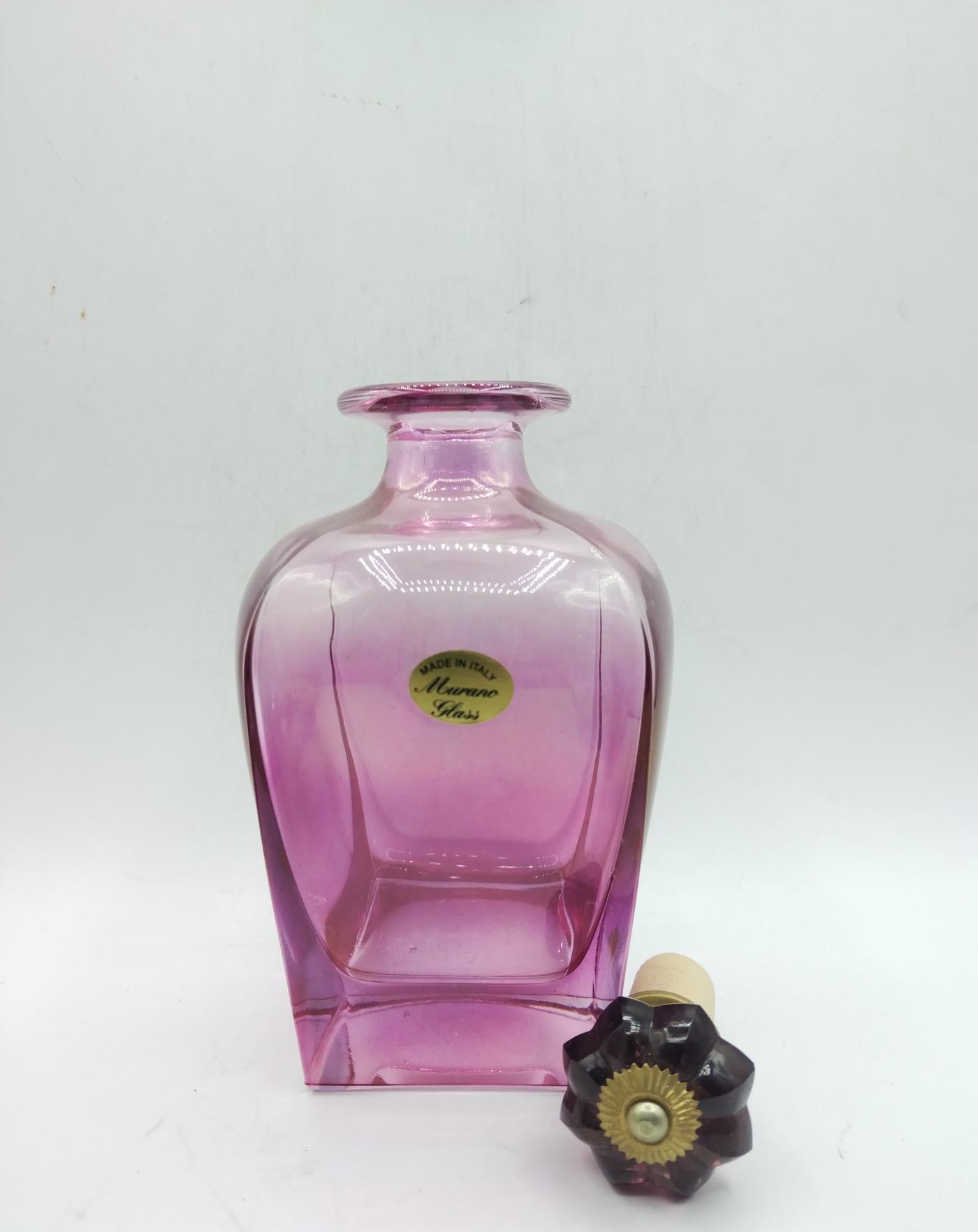 Bottiglia per liquore in vetro soffiato di murano color rosa; la possibilità di scegliere il tappo che più si abbina ai vostri gusti