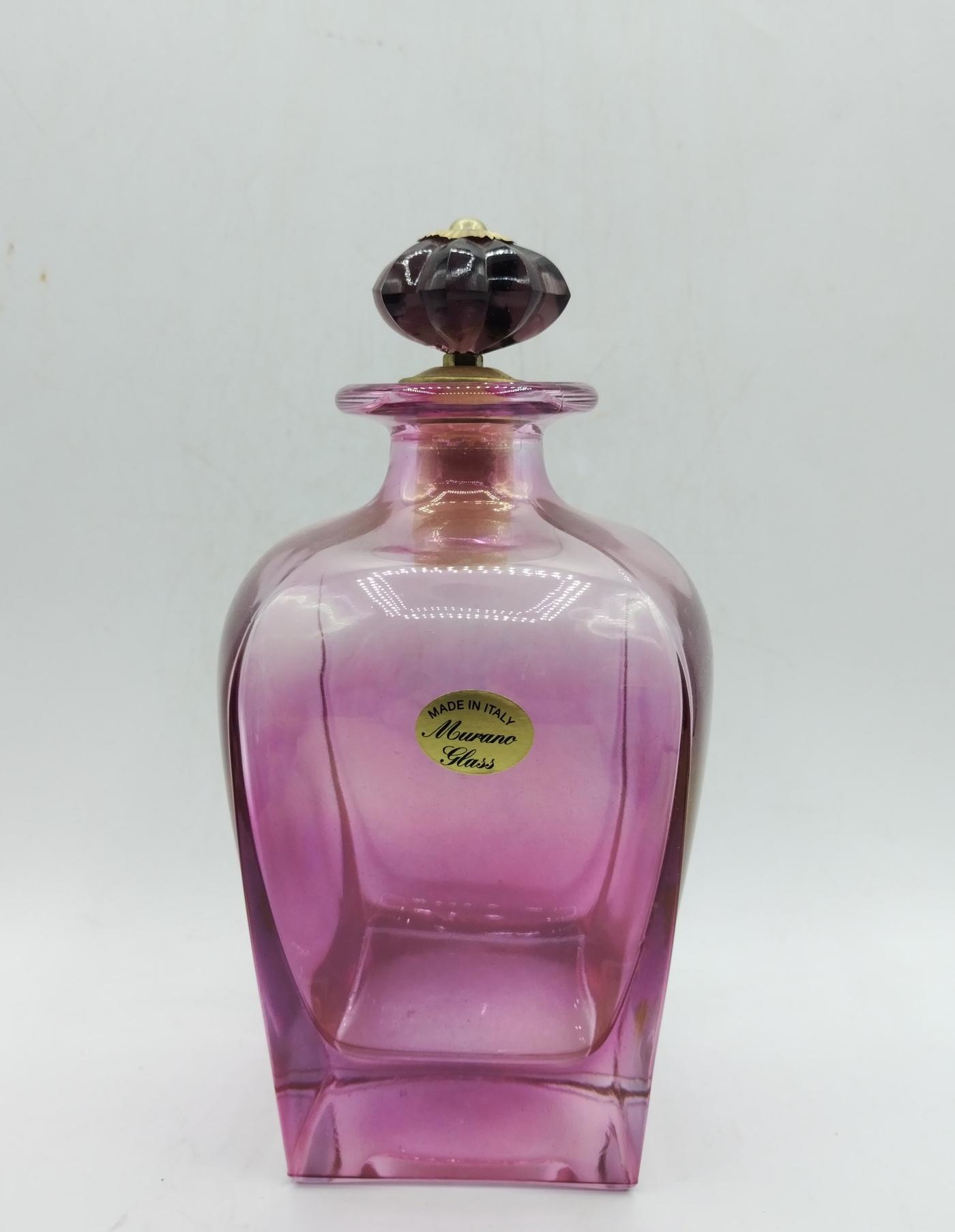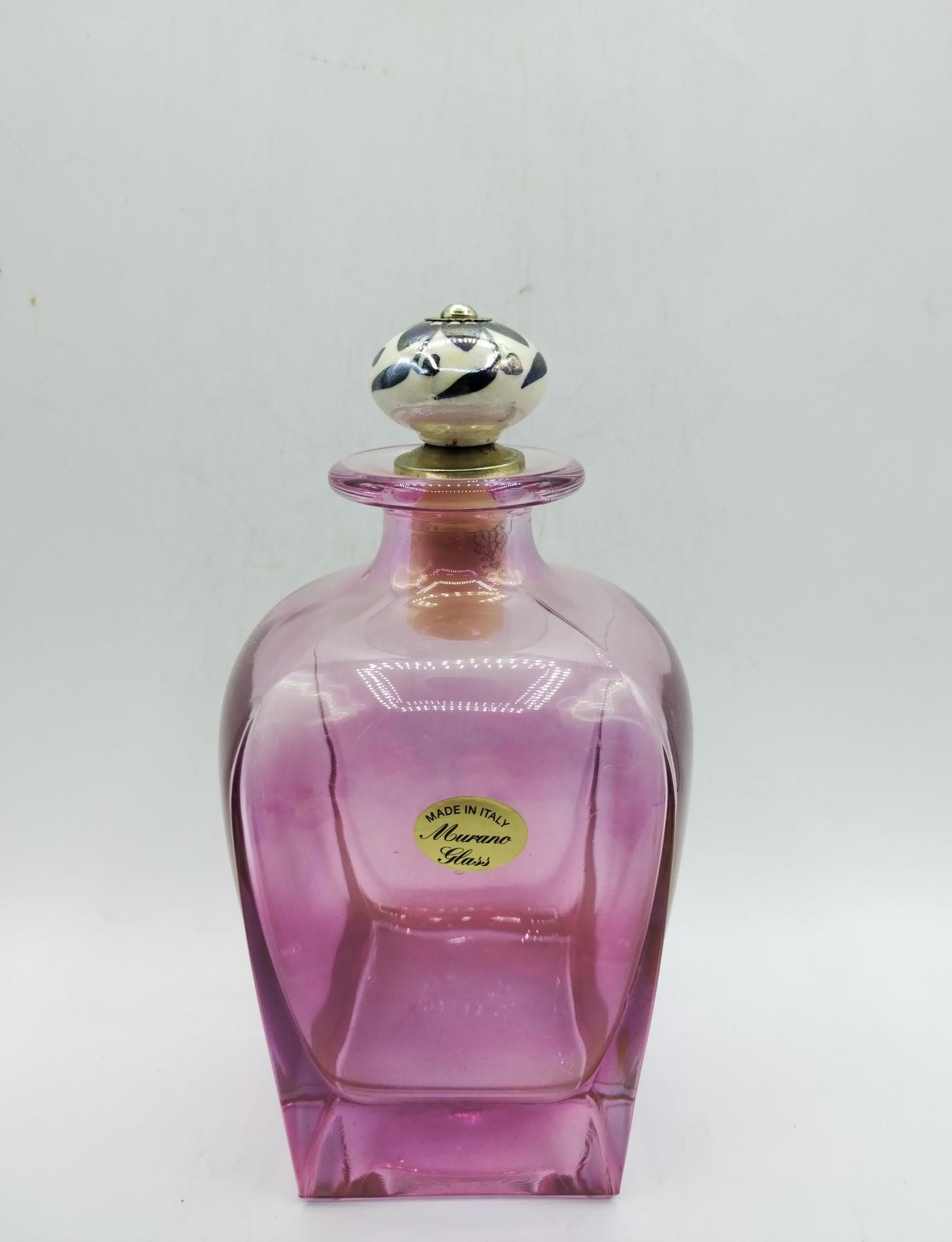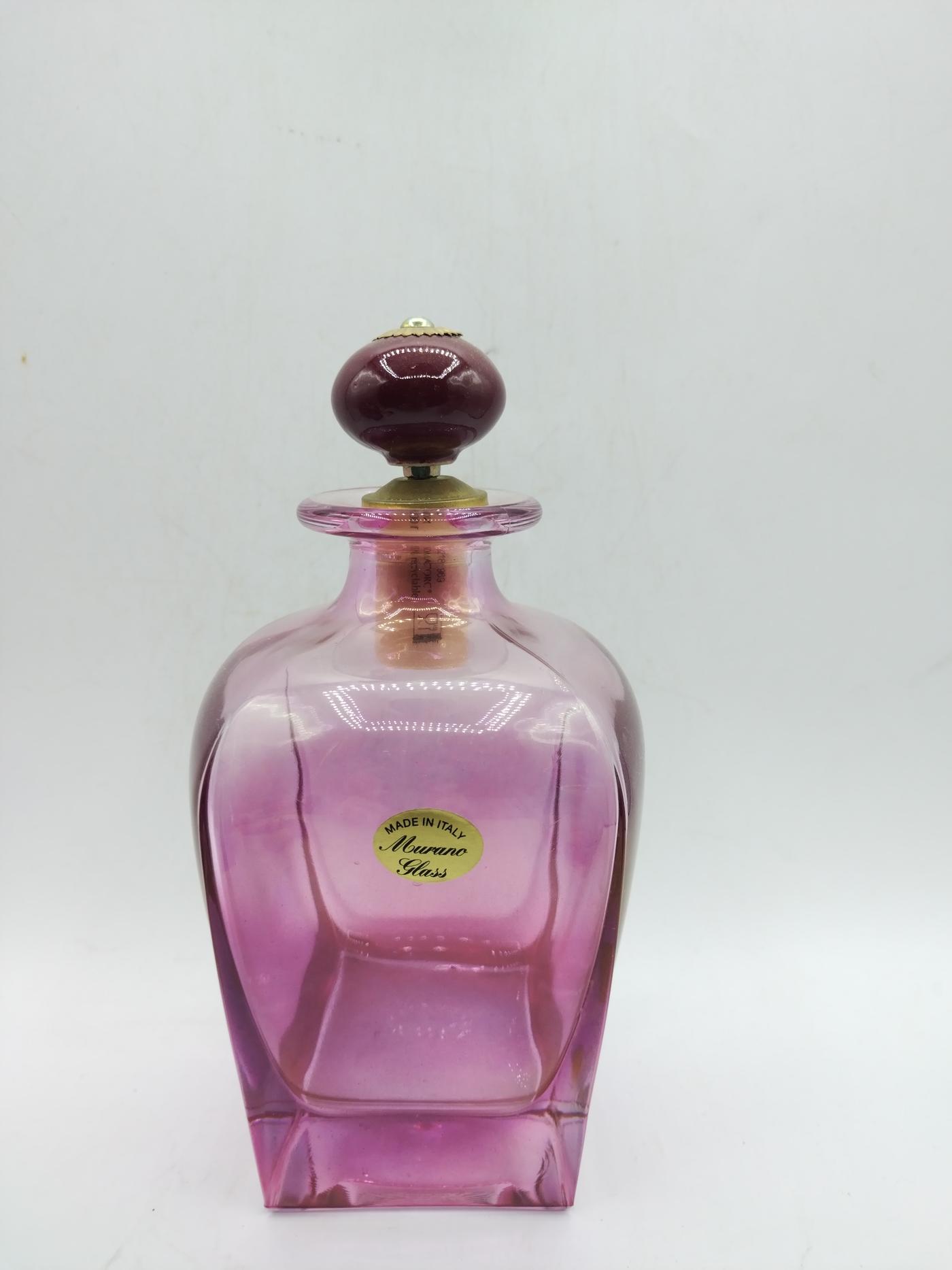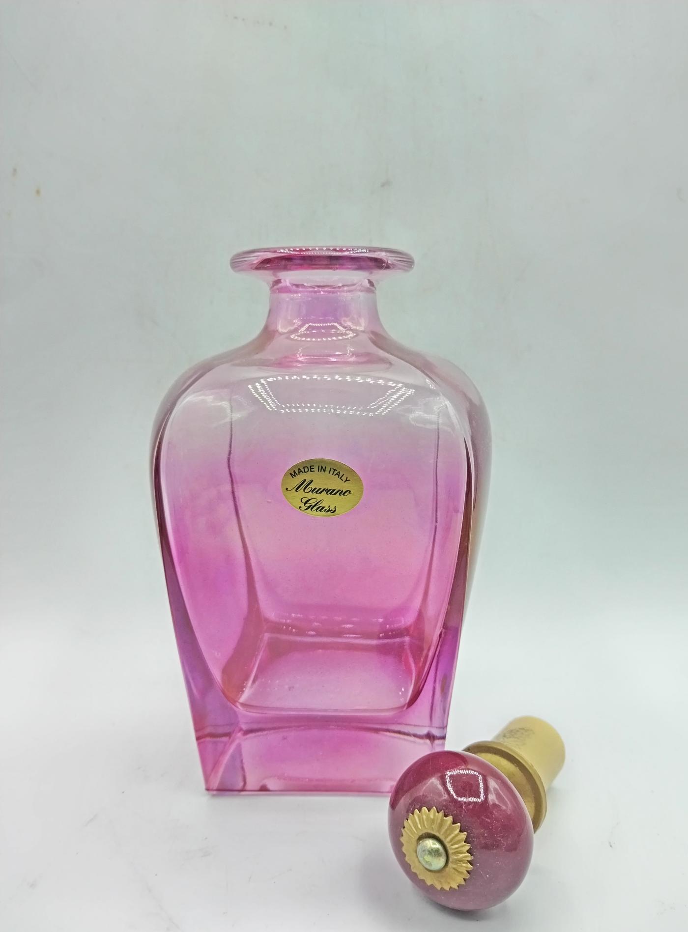 Bottiglia per liquore in vetro soffiato di murano color rosa; la possibilità di scegliere il tappo che più si abbina ai vostri gusti