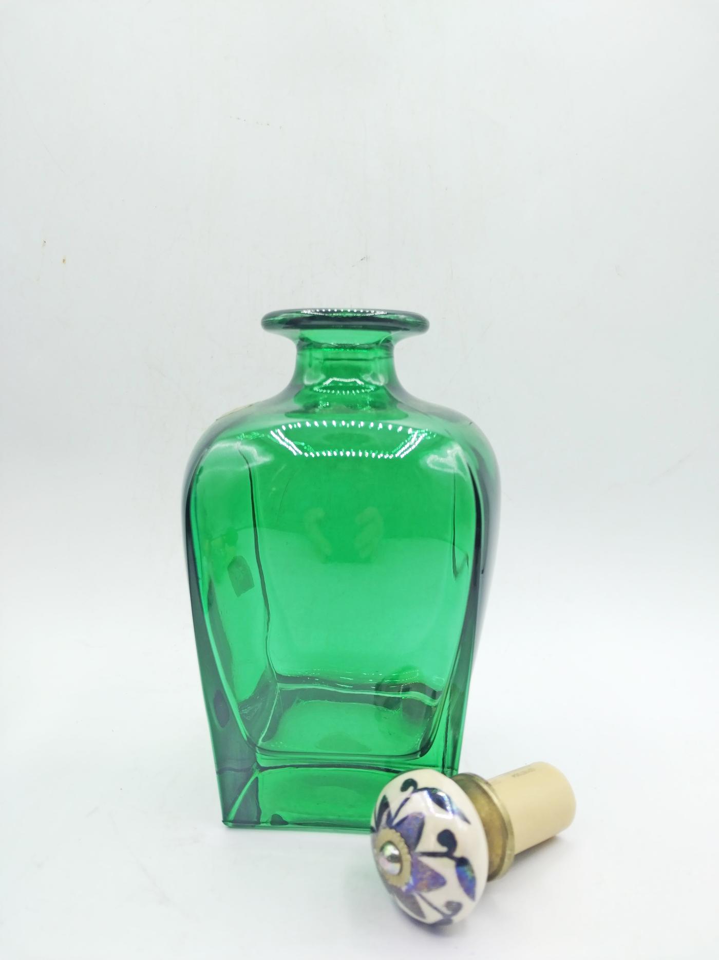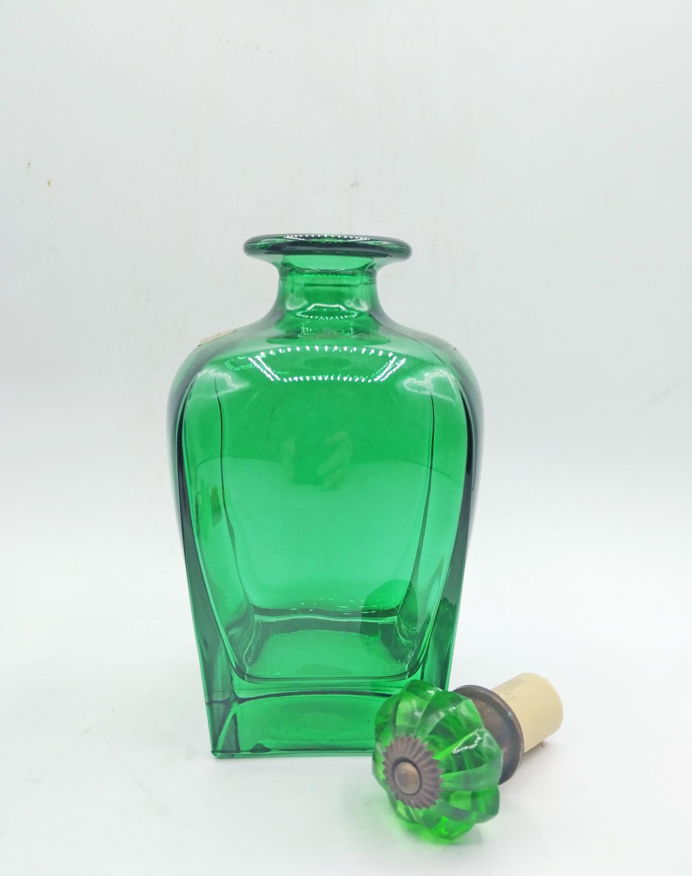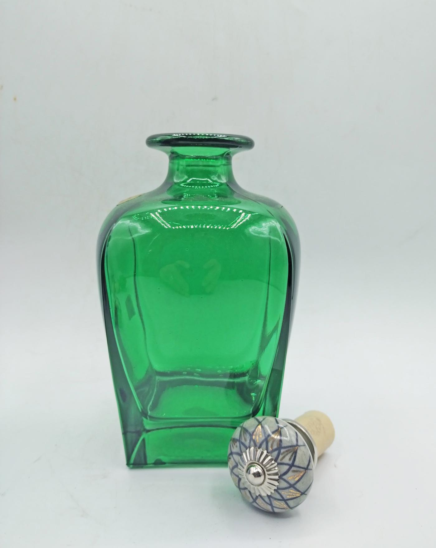 Bottiglia per liquore in vetro soffiato di murano color verde; la possibilità di scegliere il tappo che più si abbina ai vostri gusti