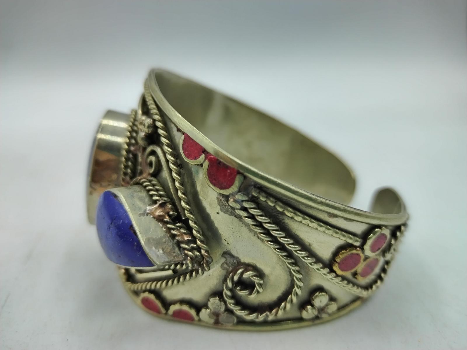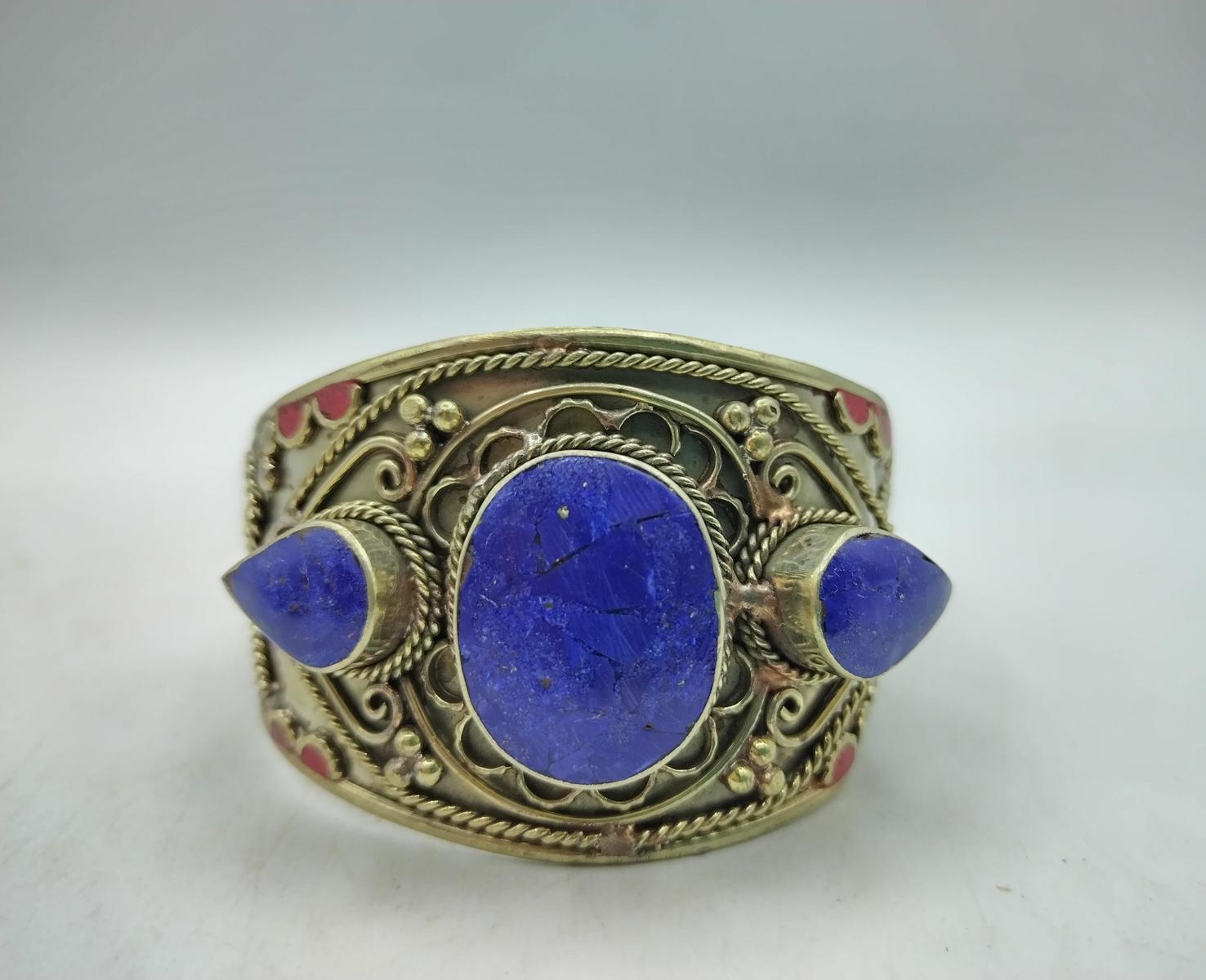 Il bracciale Amina è un gioiello realizzato con maestria artigianale in Marocco, con una fascia in argentone la cui parte centrale è decorata con splendide pietre dure blu, accuratamente incastonate, di diverse dimensioni, una grande centrale ovale e a seguire altre più piccole a forma di goccia rigirata.