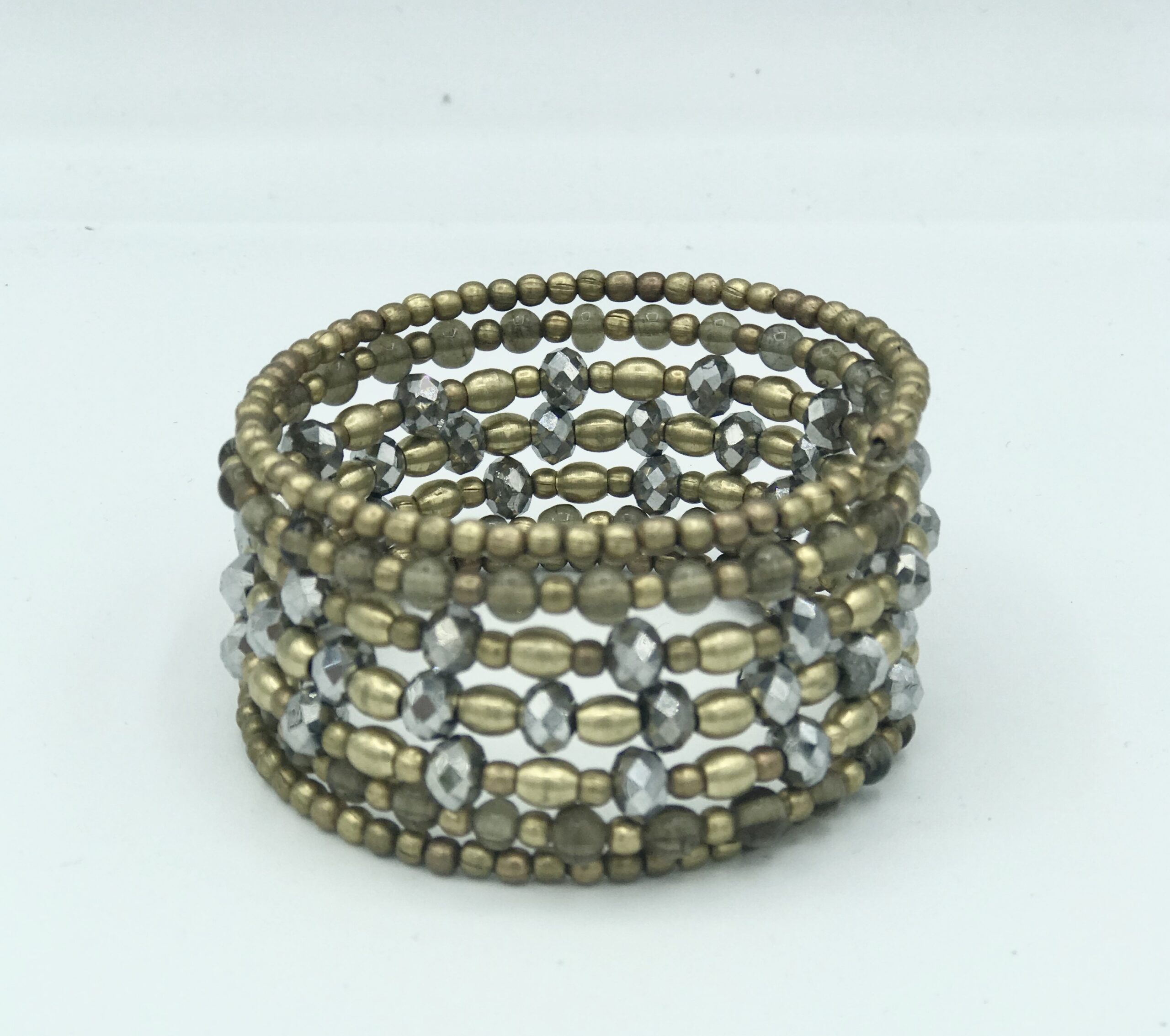 Bracciale a spirale Indiano realizzato in perline di Swarovski grigie e di perline di varie dimensioni in colore oro