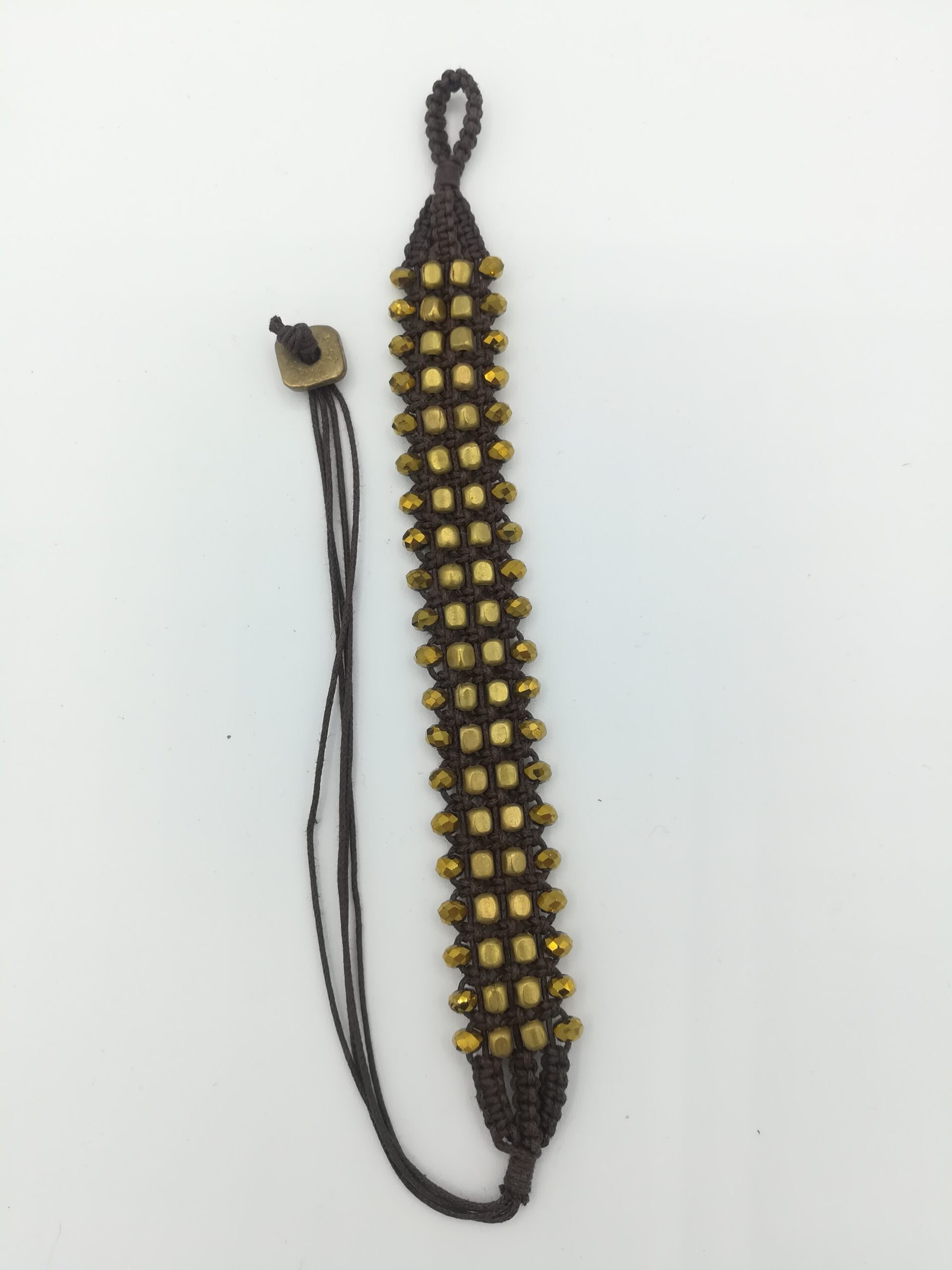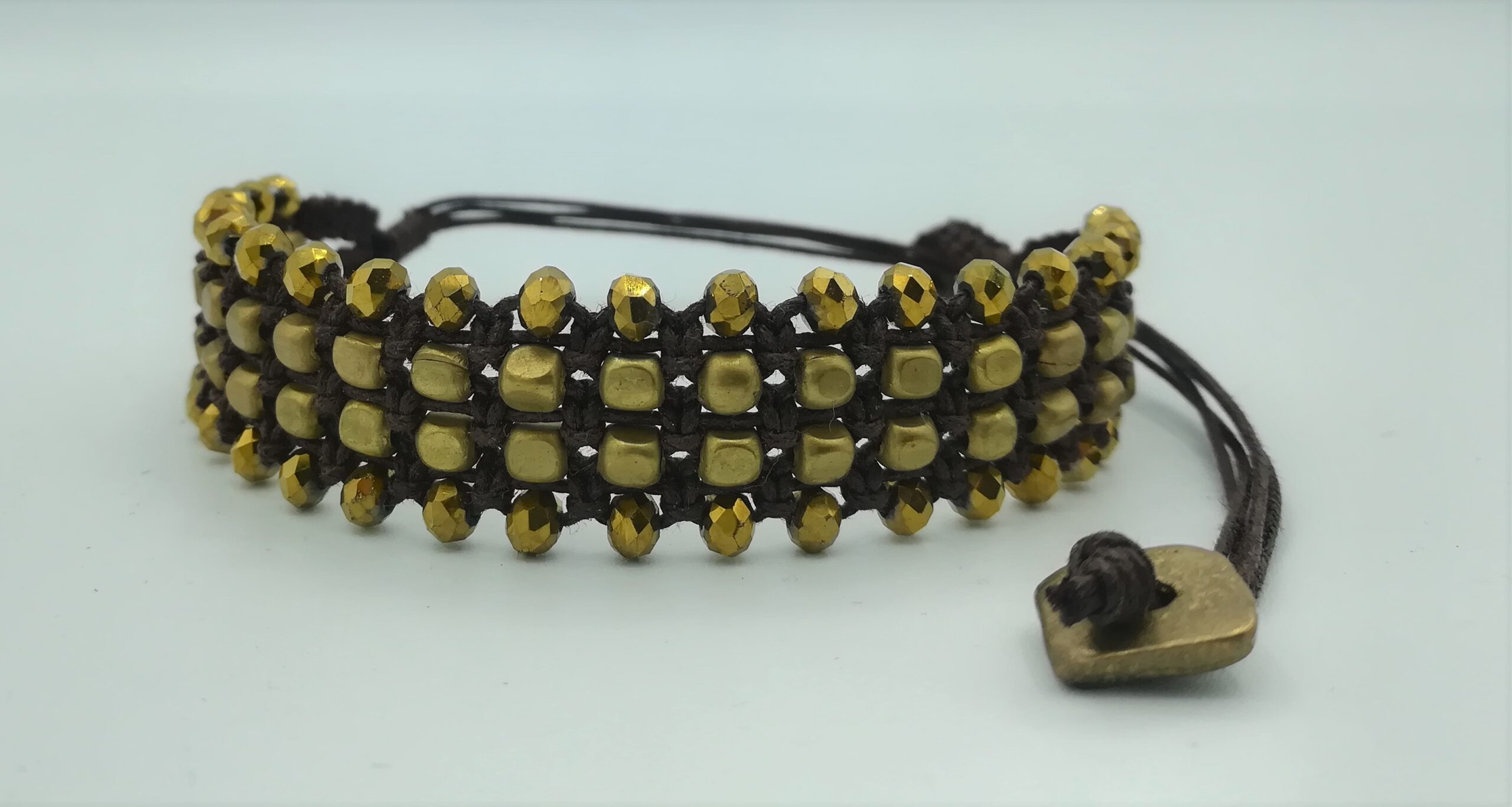 Bracciale in cuoio color marrone con inserti in metallo color oro e perline color oro sui bordi,misura regolabile