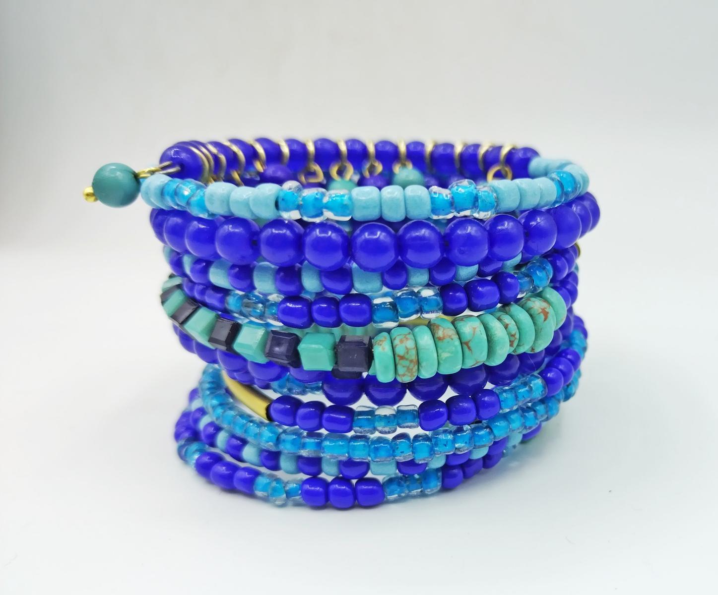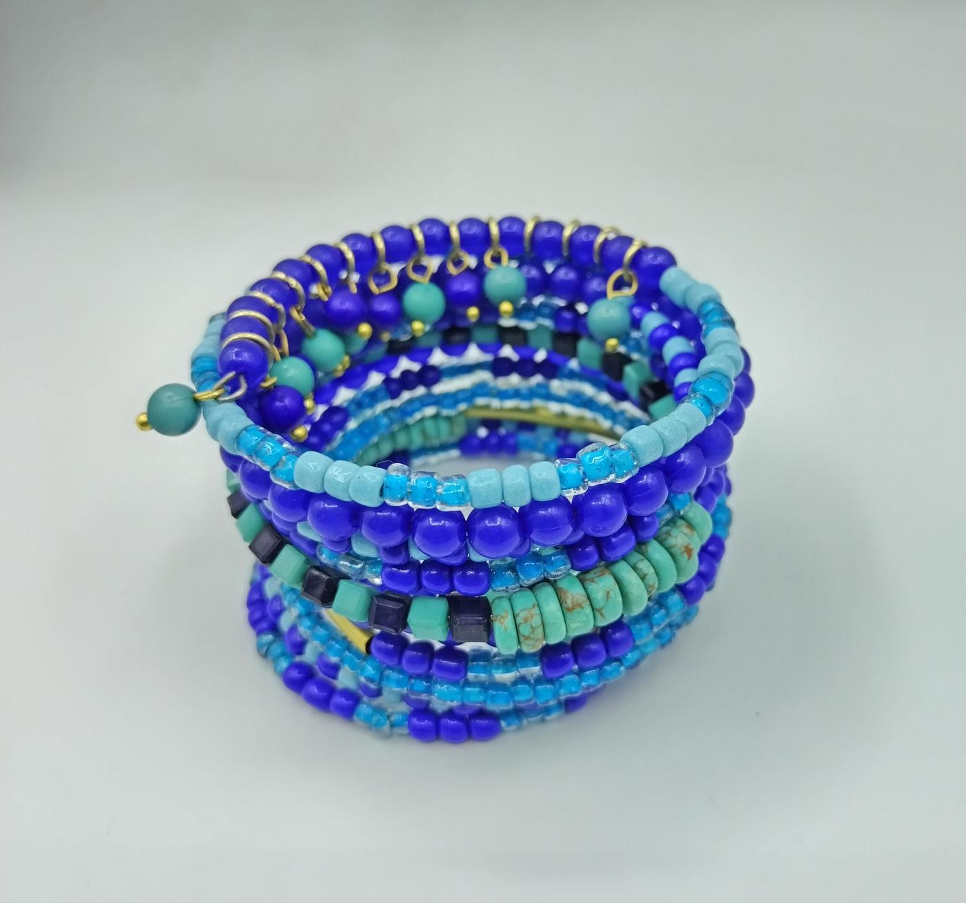 Bracciale a spirale indiano realizzato in perline di varie dimensioni color azzurro, verde acqua, blu ed oro
