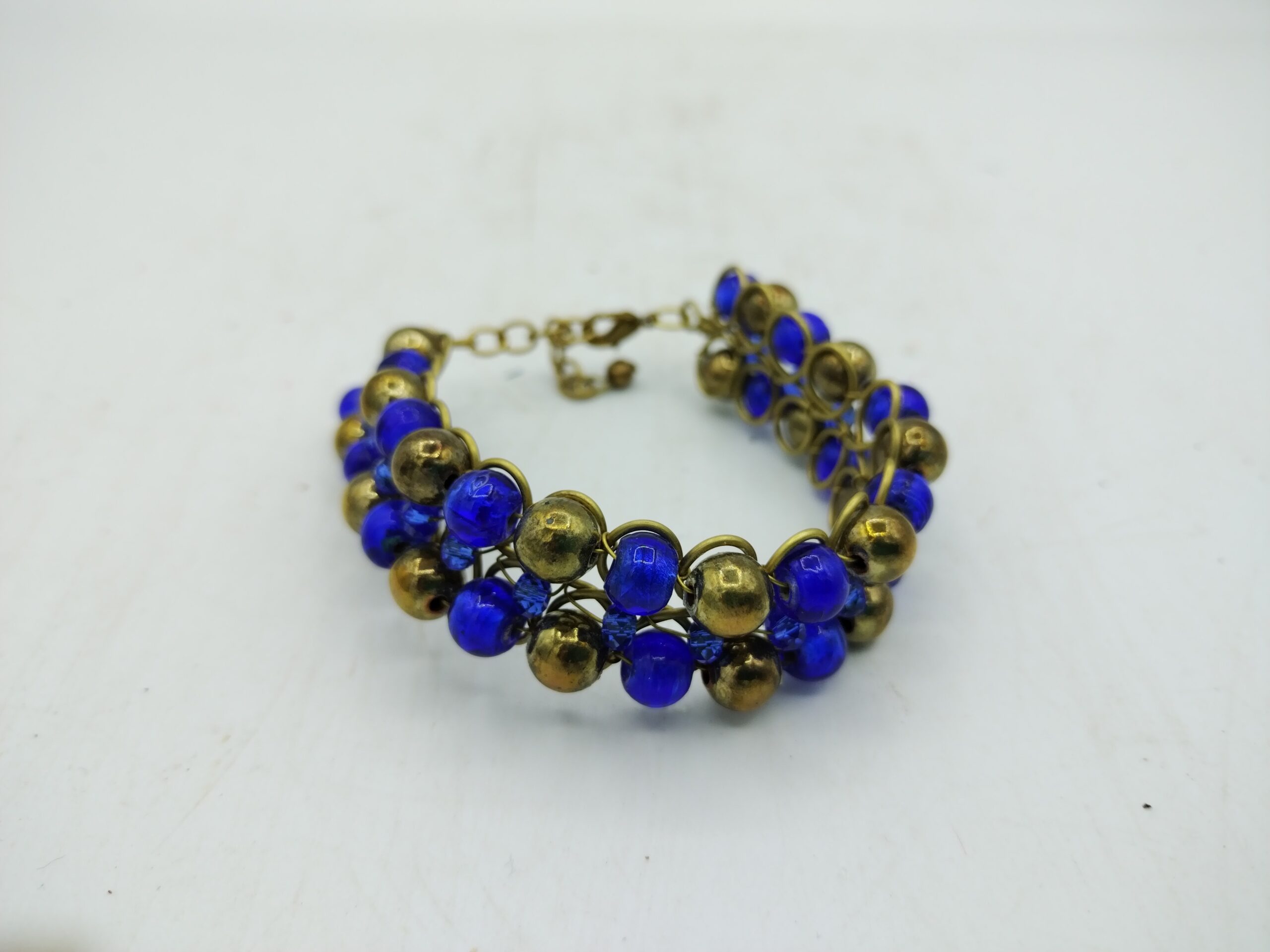 Bracciale rigido in metallo oro con perline oro e blu, realizzato in India