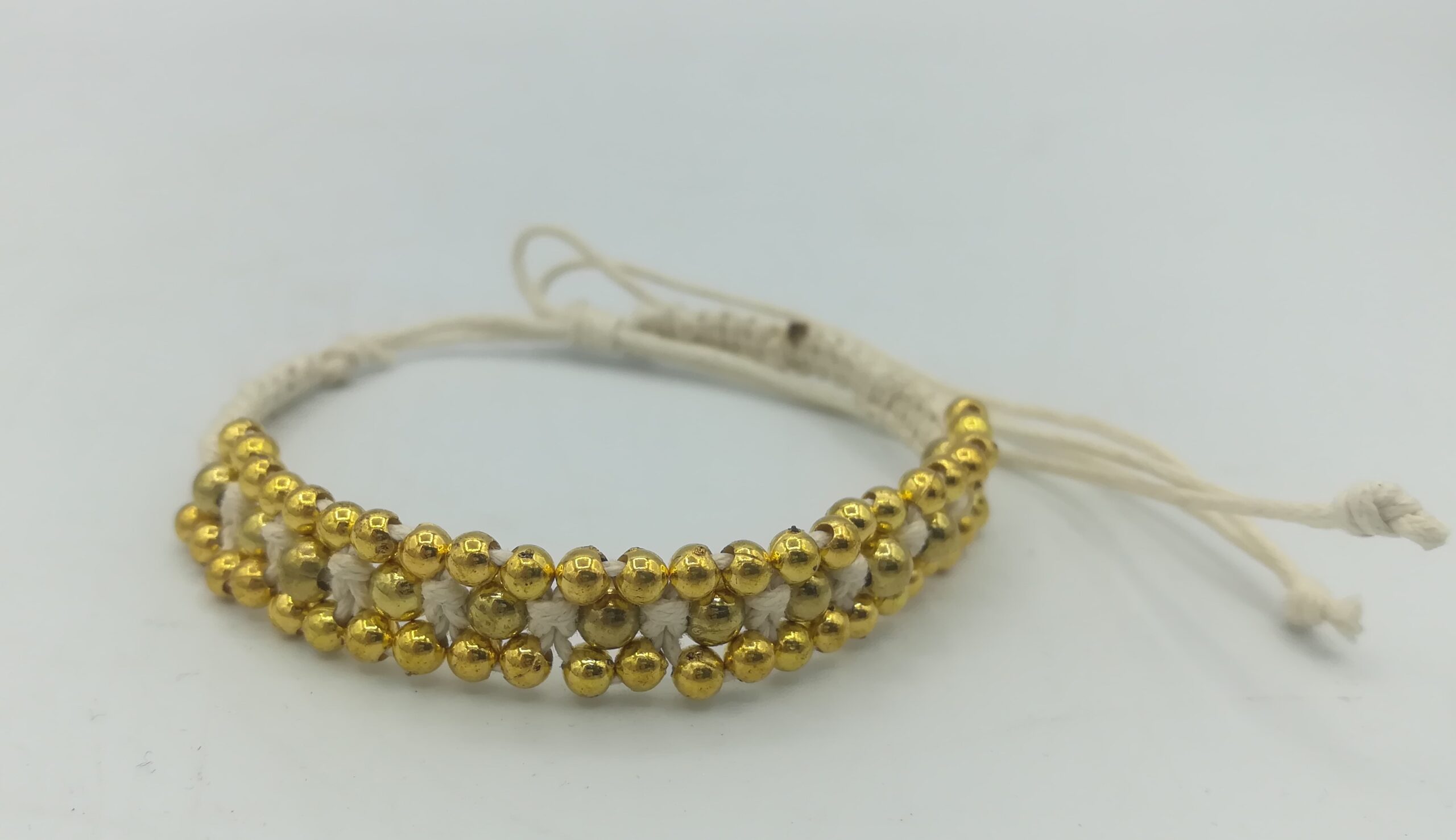 La struttura morbida e regolabile lo rende comodo da indossare, adattandosi facilmente al polso. Le perline dorate, disposte in modo armonioso, creano un delicato gioco di riflessi che valorizza le tonalità calde del tessuto.