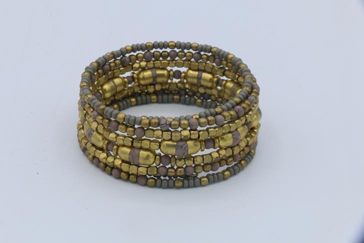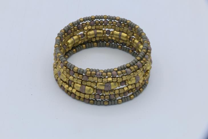 Bracciale a spirale Indiano realizzato in perline di varie dimensioni in colore oro e grigio tortora