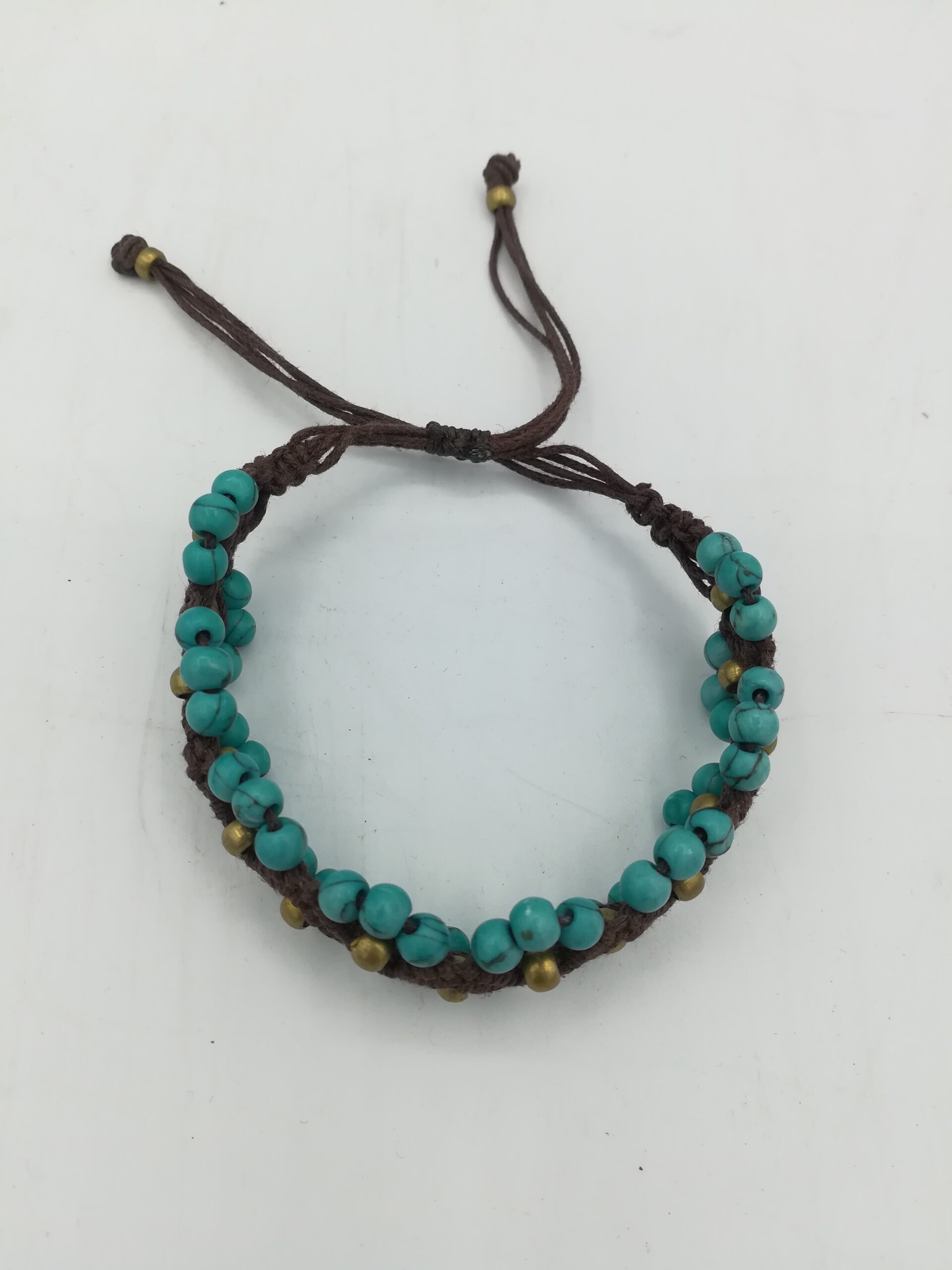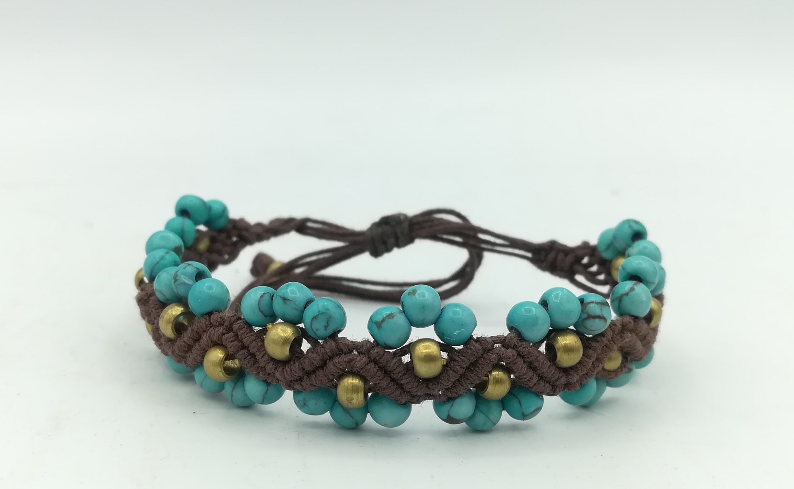 Bracciale indiano in macramè marrone con inserti dorati e turchesi