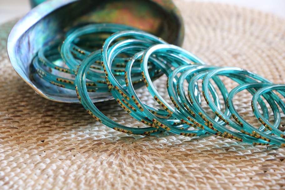 Bracciali Indiani in vetro color verde acqua, con puntini decorativi glitterati di vari colori