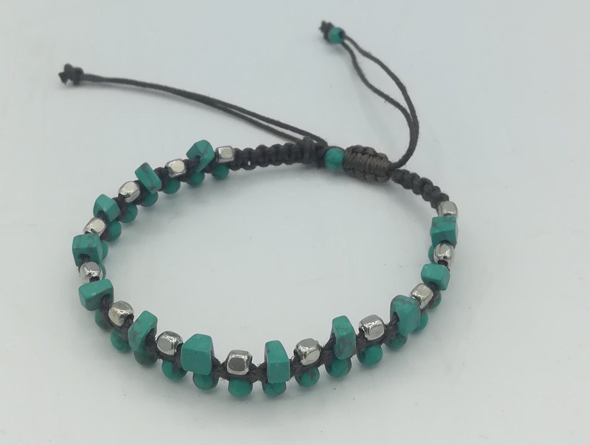 Bracciale in tessuto color marrone con inserti in metallo color argento e pietre in pasta di turchese