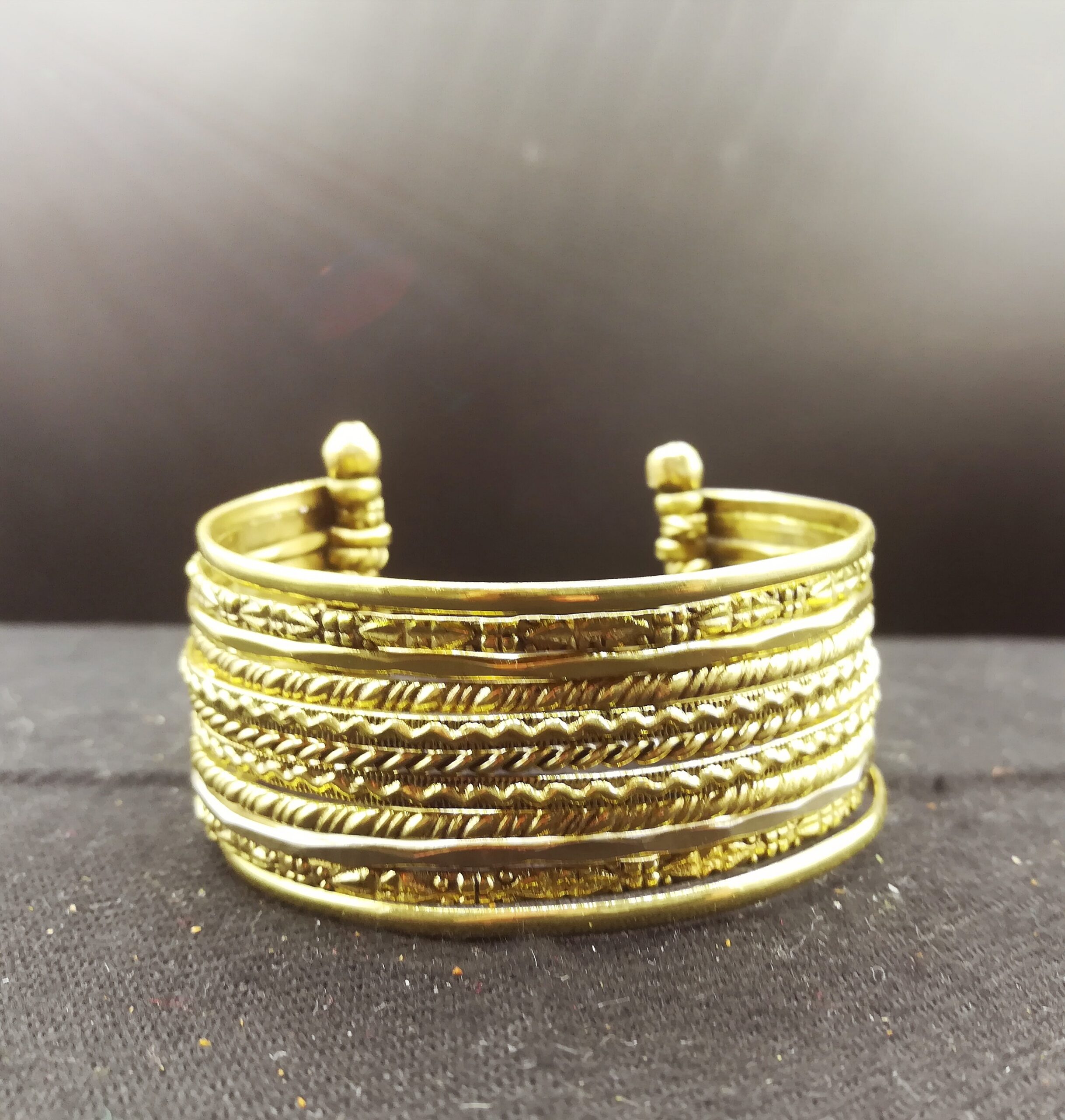 E’ composto da una fascia rigida di metallo dorato incisa con motivi geometrici e da un’ampia apertura perfetta per tutti i tipi di polsi.