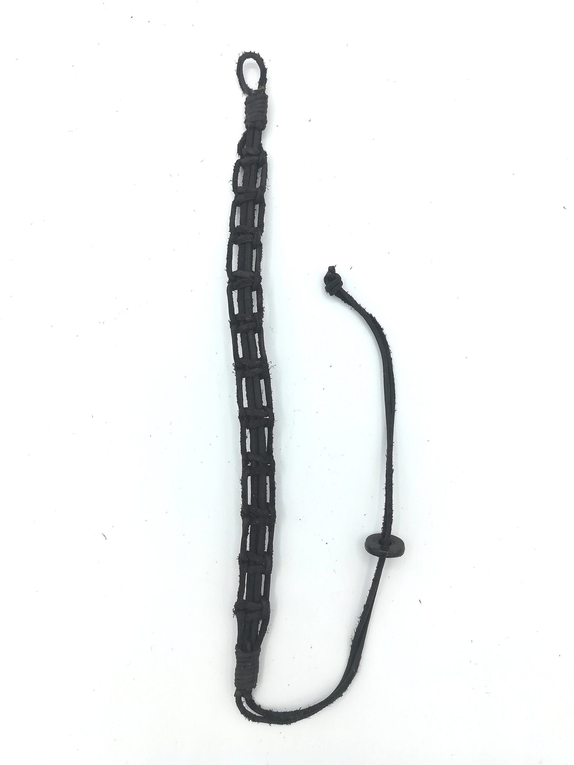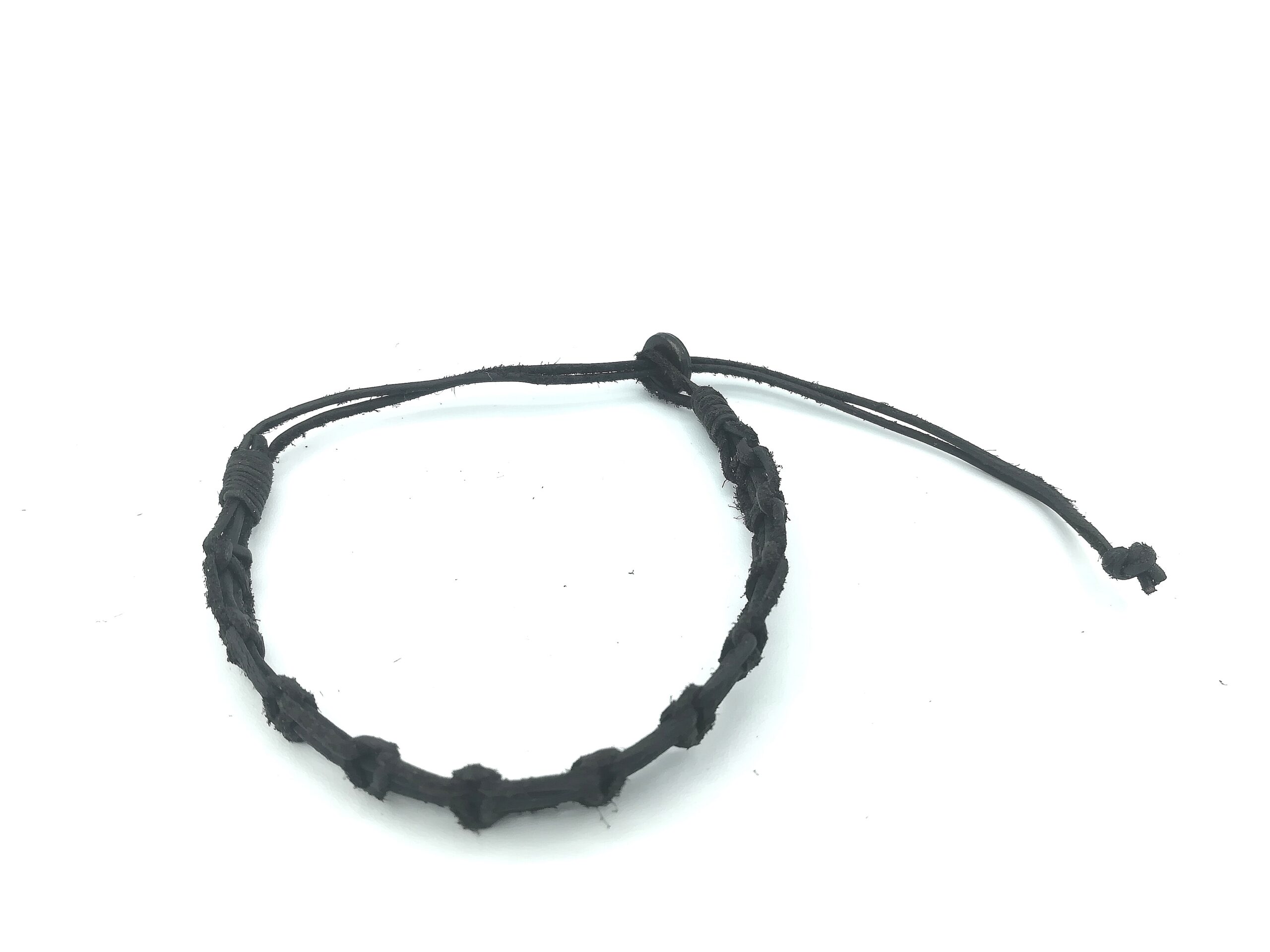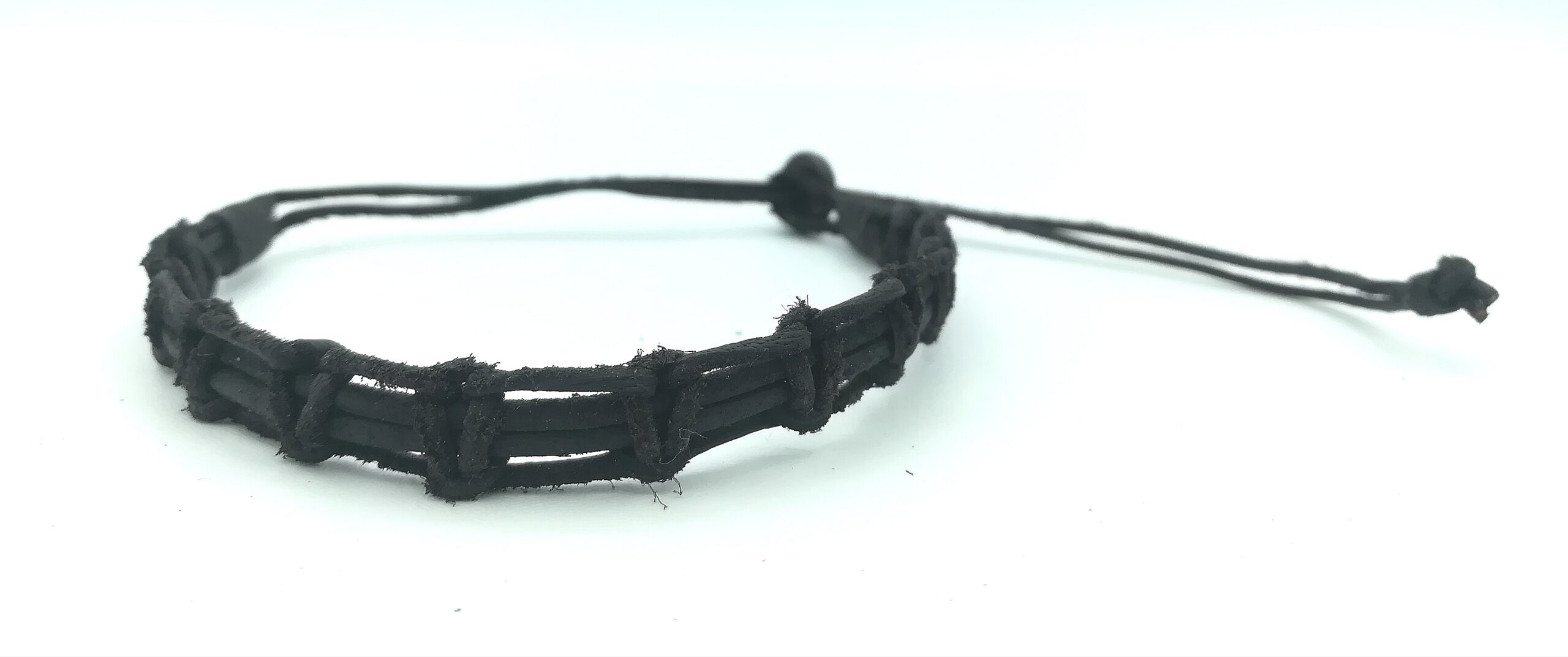 Il bracciale Sven è stato realizzato in India in cuoio nero intrecciato che crea un disegno di line orizzontali.