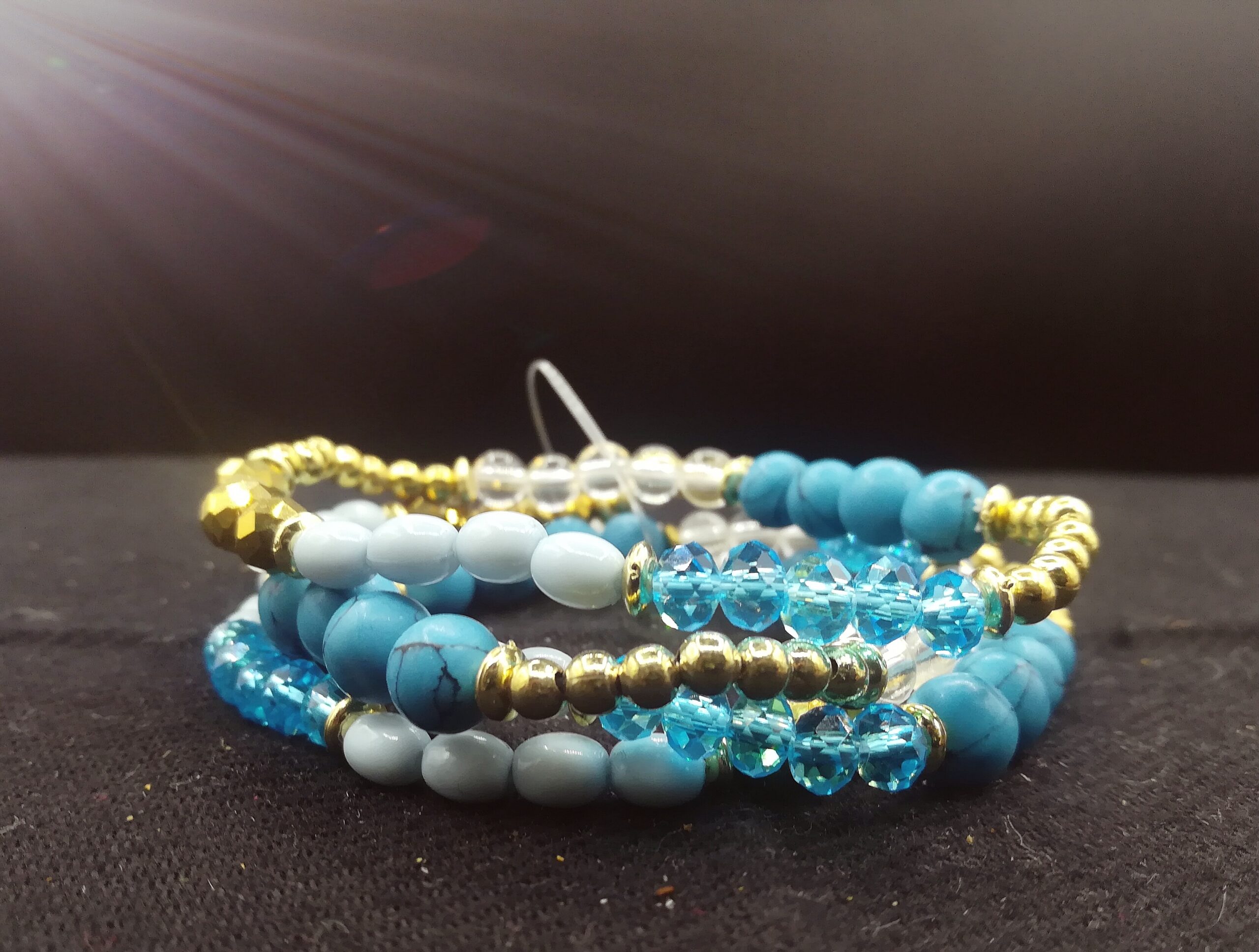 Sono composti da quattro fili elastici, facili da inserire e pratici da indossare, ornati con perline di varie grandezze e forme sui toni del bianco, azzurro, trasparente ed oro.