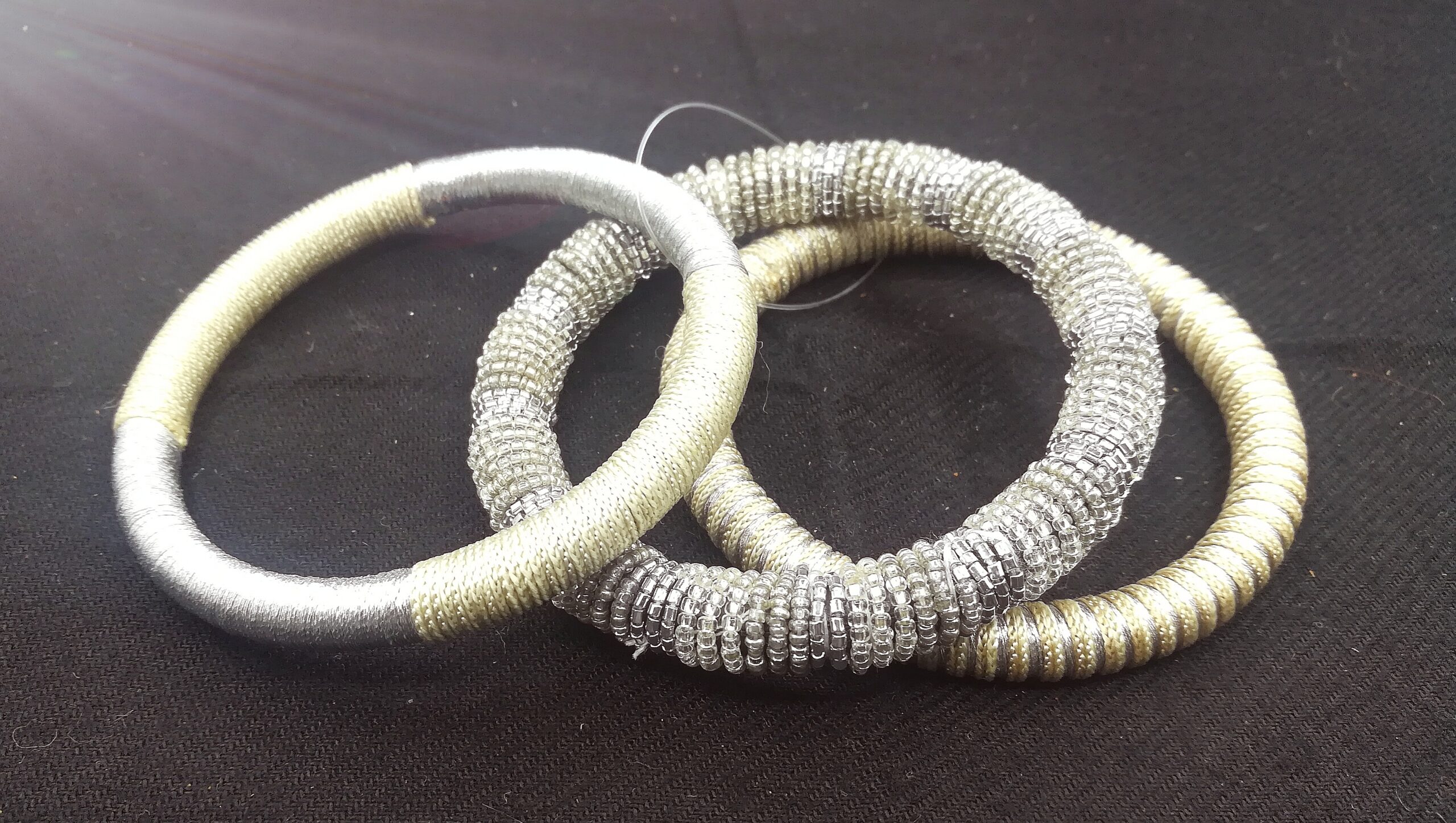 3 Bracciali rigidi Indiani realizzati in perline e fili di cotone argento e oro.