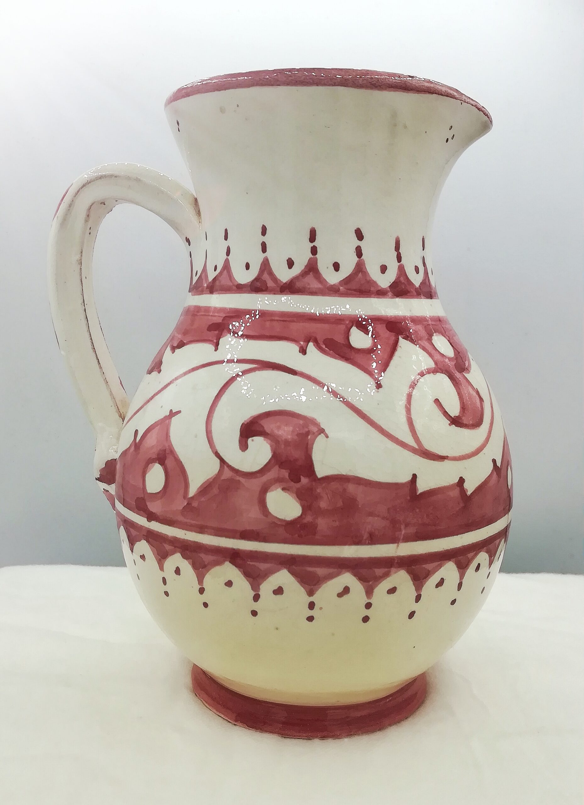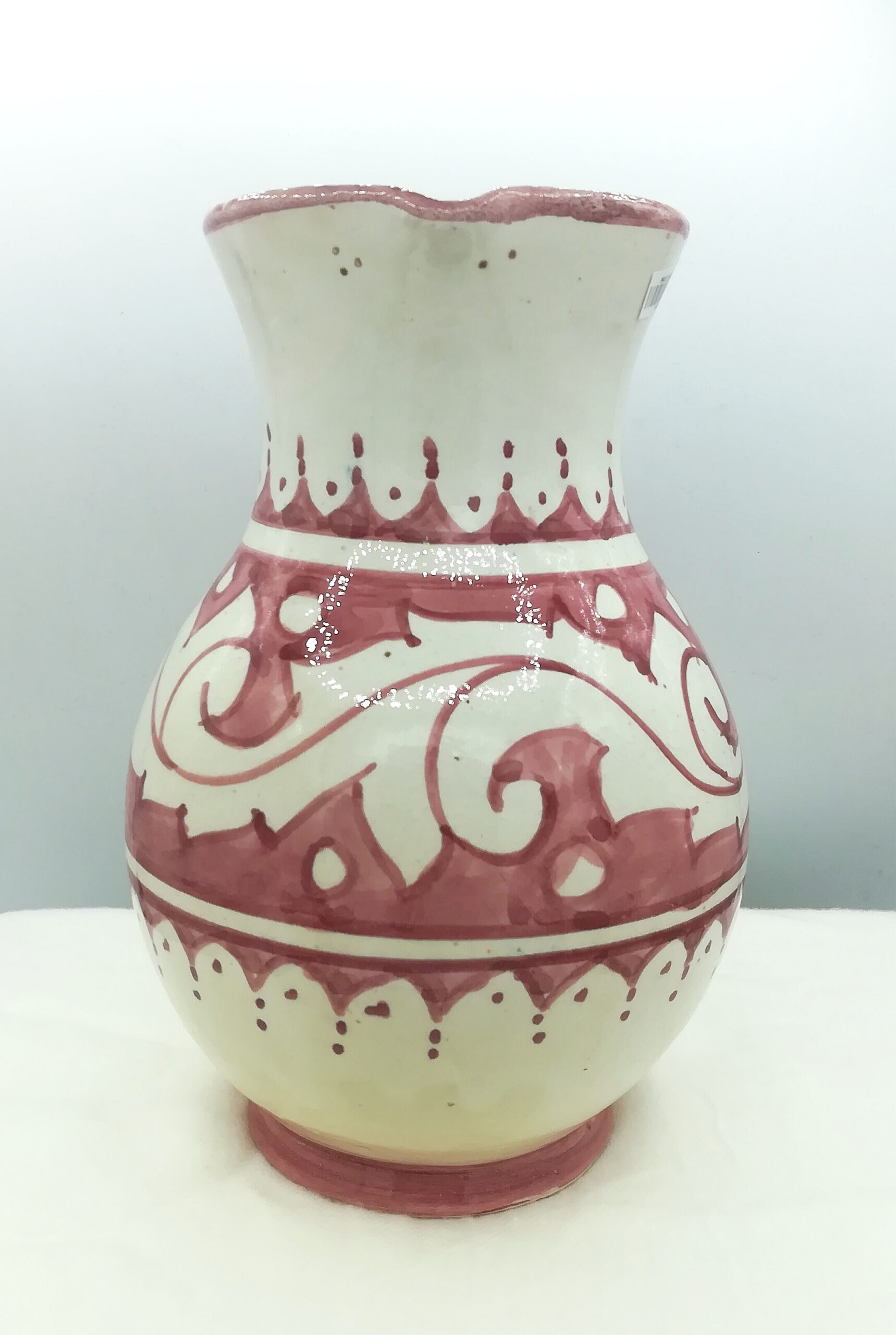 La brocca Safi è stata realizzata artigianalmente in Marocco in terracotta smaltata color panna e bordeaux.