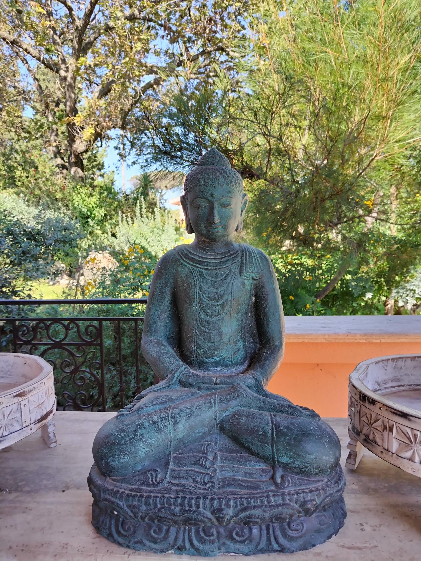 Scultura grande in pietra vulcanica e cemento, dipinto sui toni del verde ramato raffigurante Buddha in posizione meditativa realizzata in Indonesia