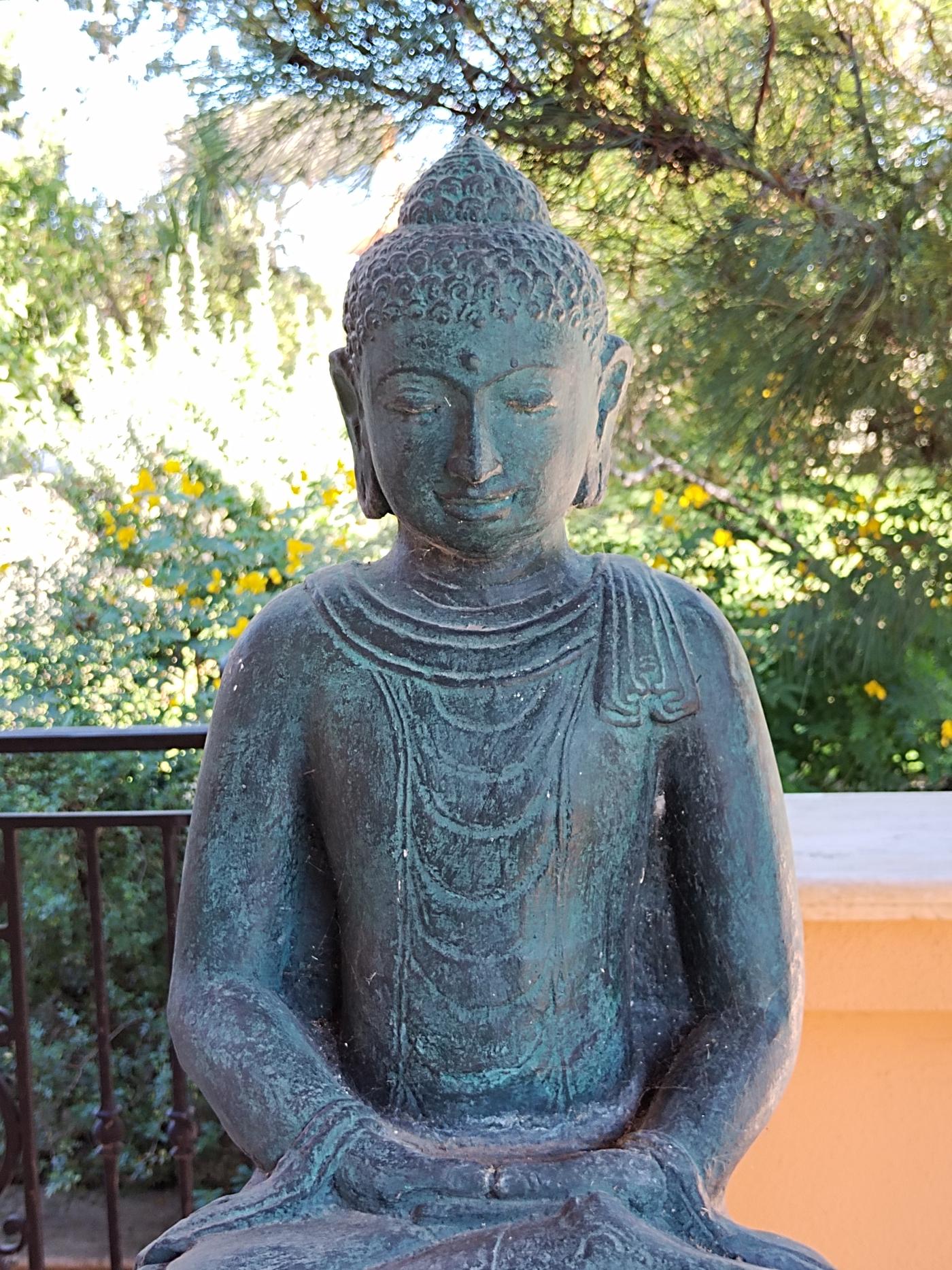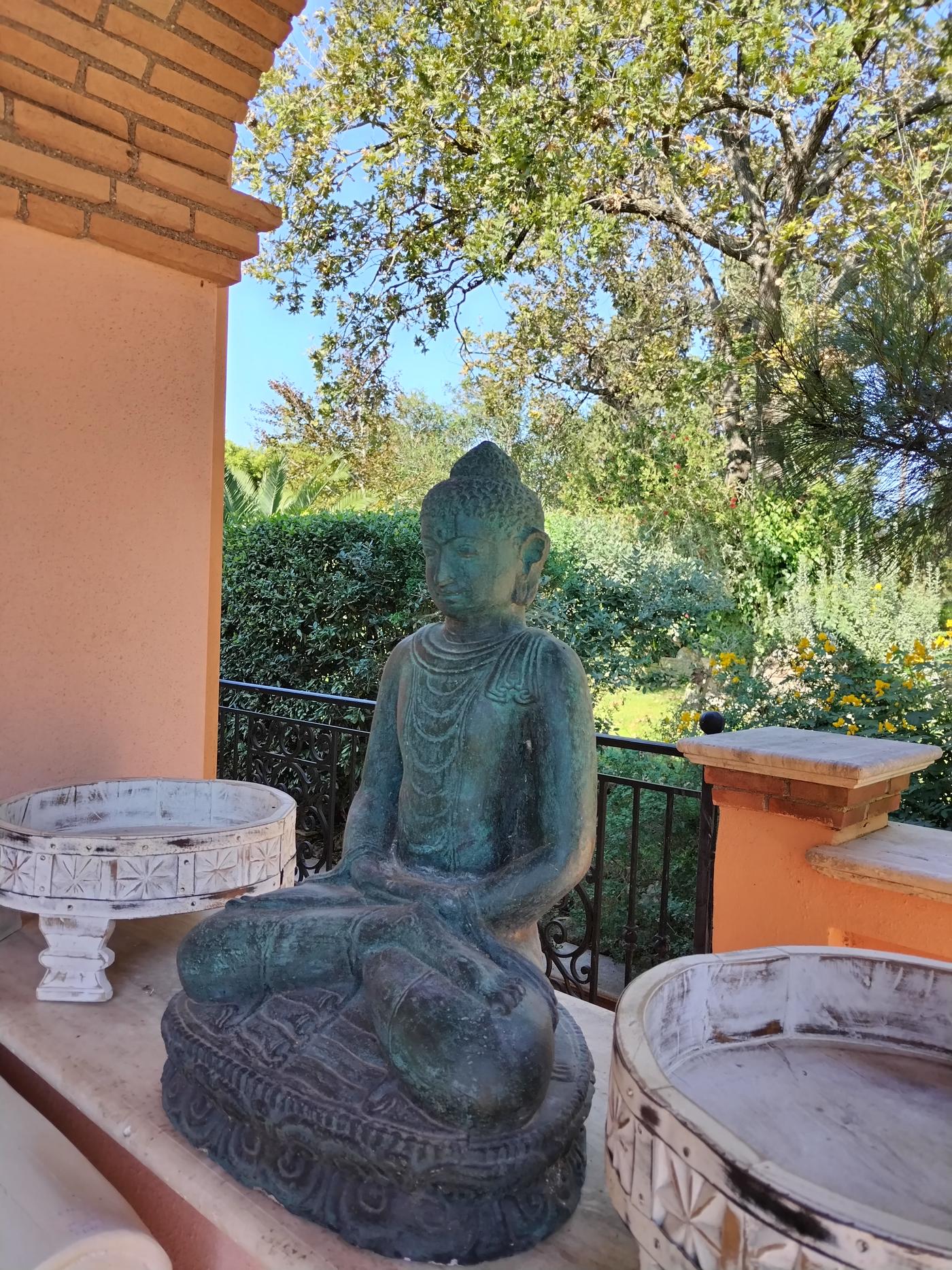 Questa statua non è solo un’opera d’arte decorativa, ma anche un oggetto carico di significato spirituale, ideale per spazi esterni come giardini zen o per un ambiente interno votato alla riflessione e alla pace interiore.