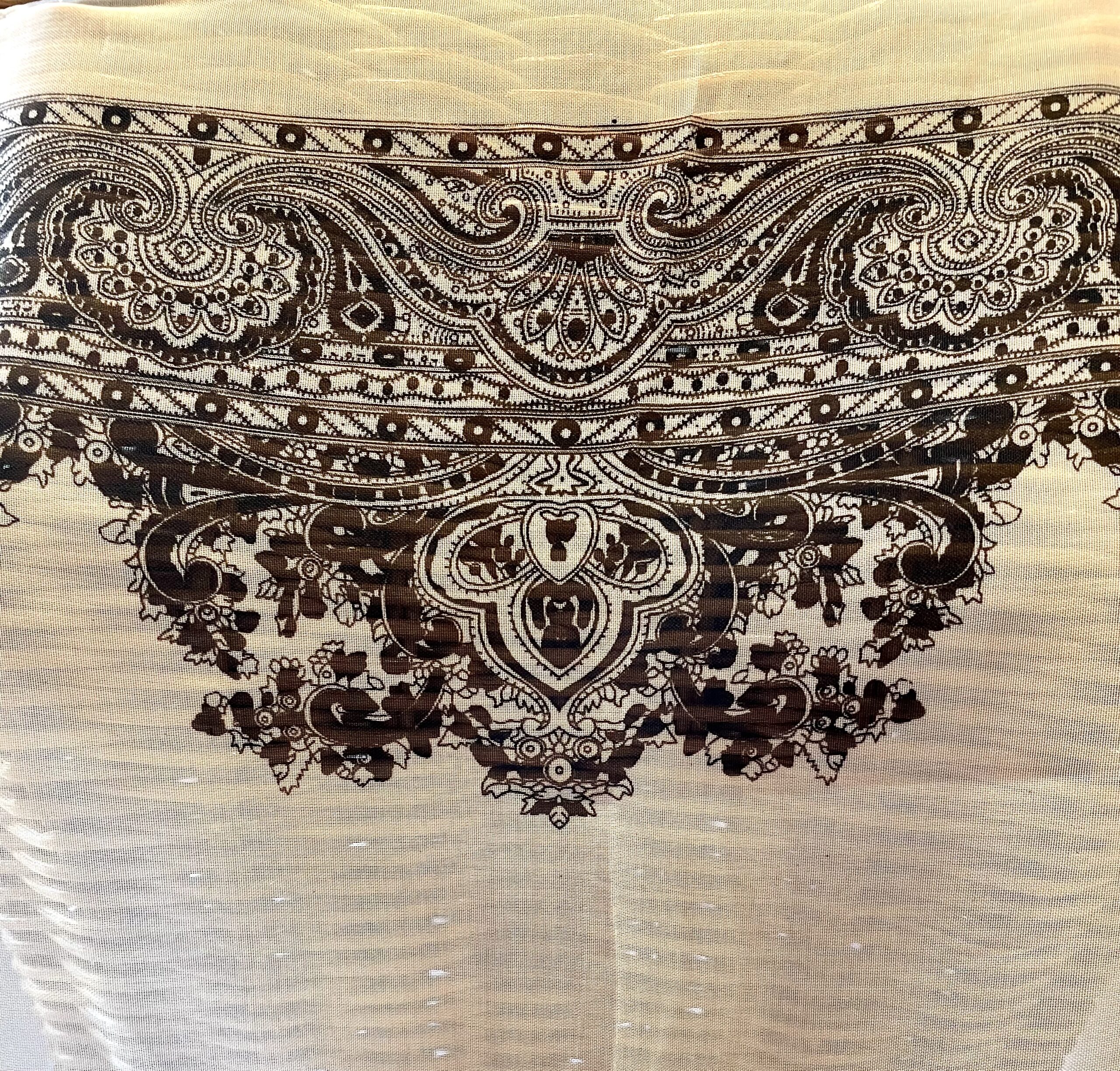 abito indonesiano trasparente color bianco con disegni tipici orientali, tre bottoncini sul davanti e tre dietro, taglia unica