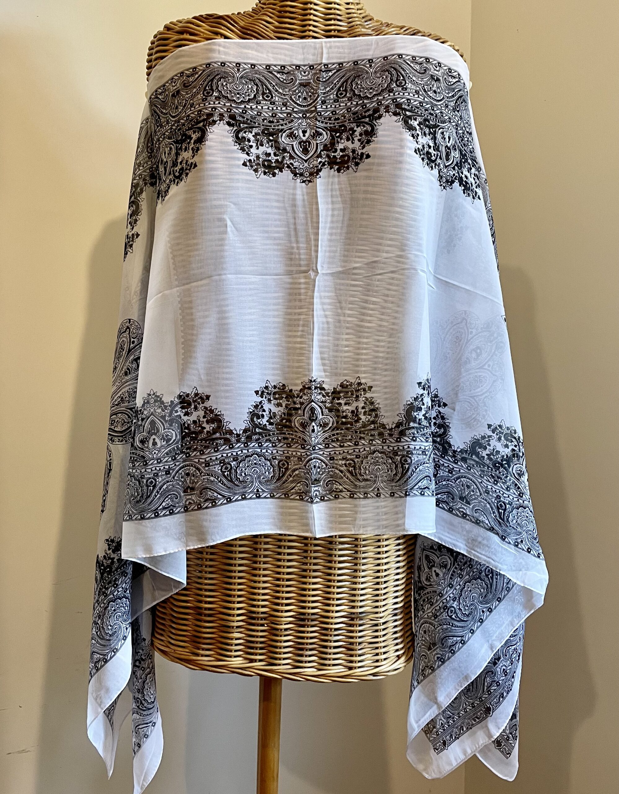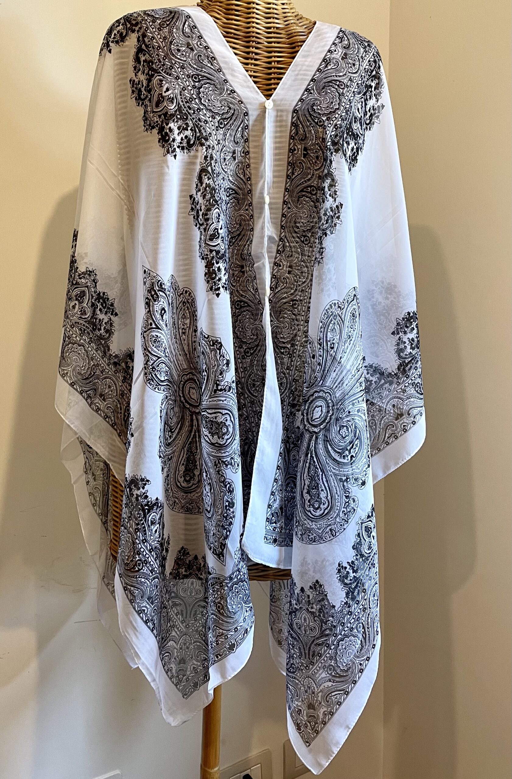 Realizzato con due foulard quadrati sovrapposti e cuciti tra loro con tre bottoncini davanti e tre dietro, può essere indossato come elegante copricostume in spiaggia o come mantella con sotto una canottiera per uscire nelle sere d’estate, abbinato con i giusti accessori.
