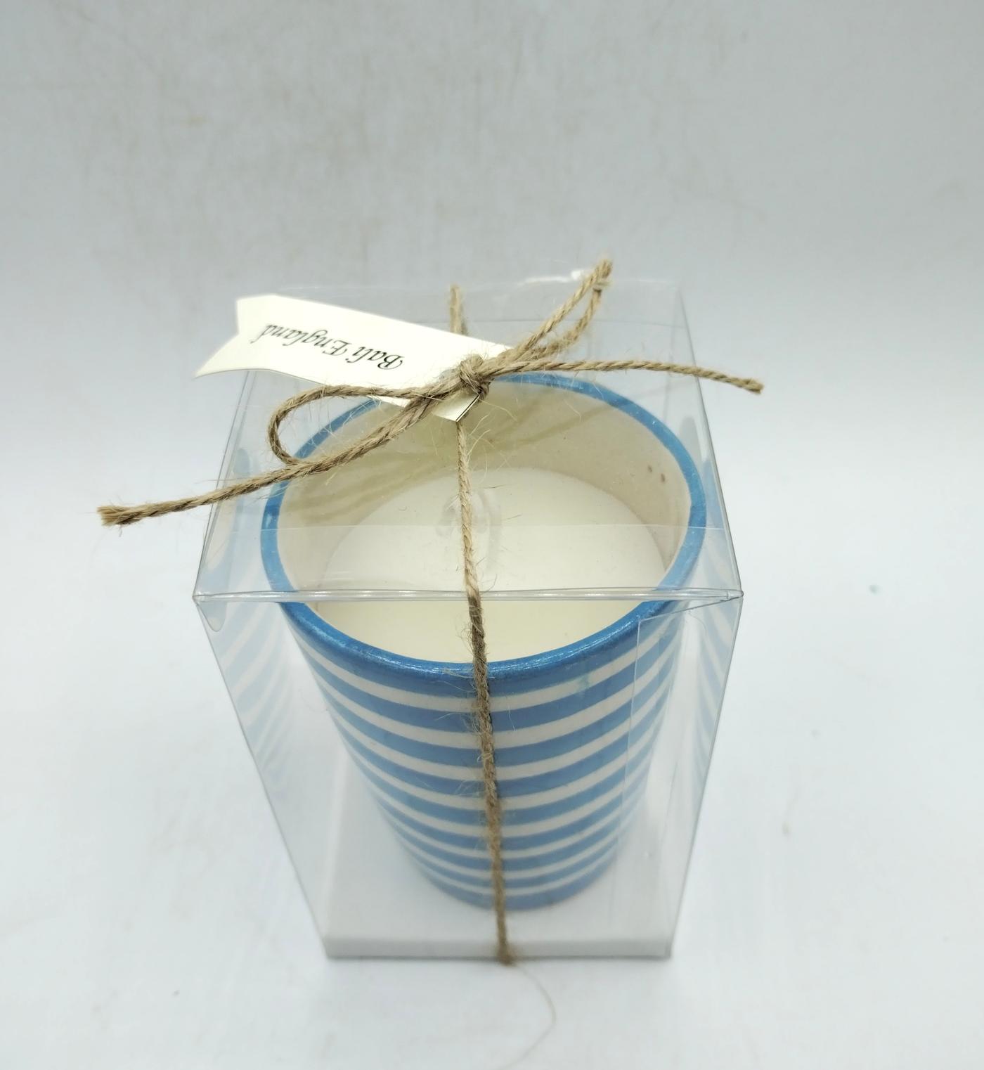 Candela profumata in cera bianca realizzata all’interno di un bicchiere marocchino a righe bianche e azzurre