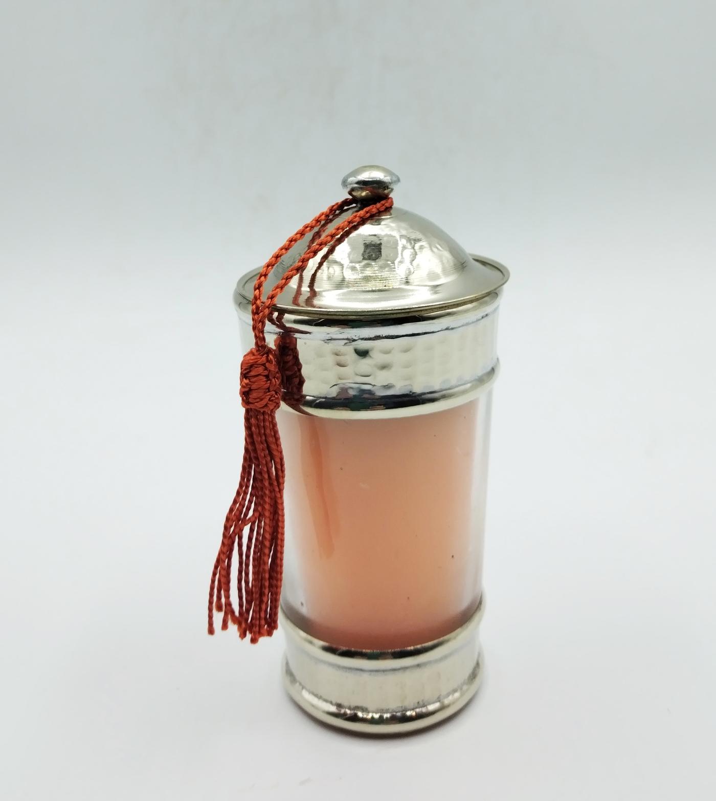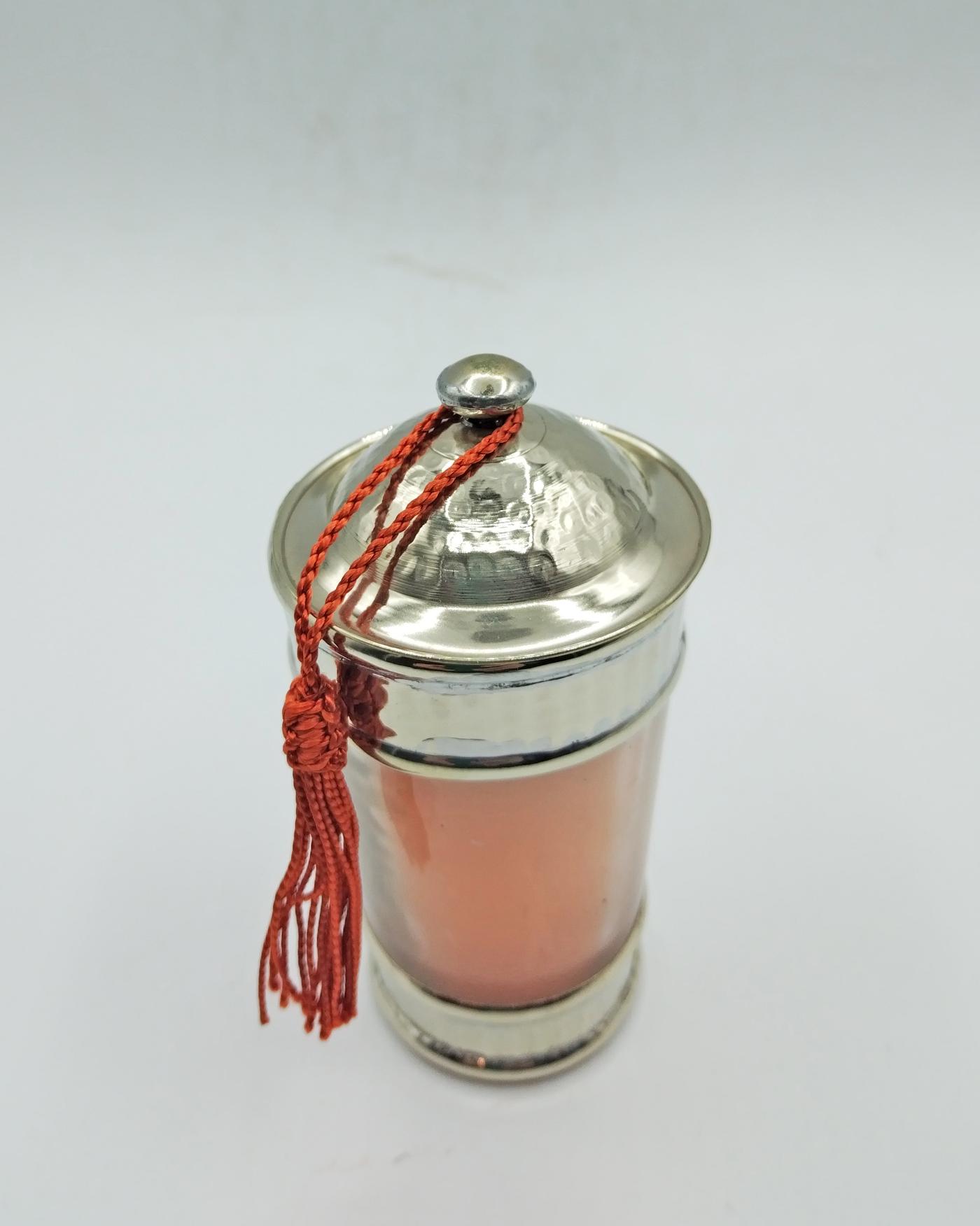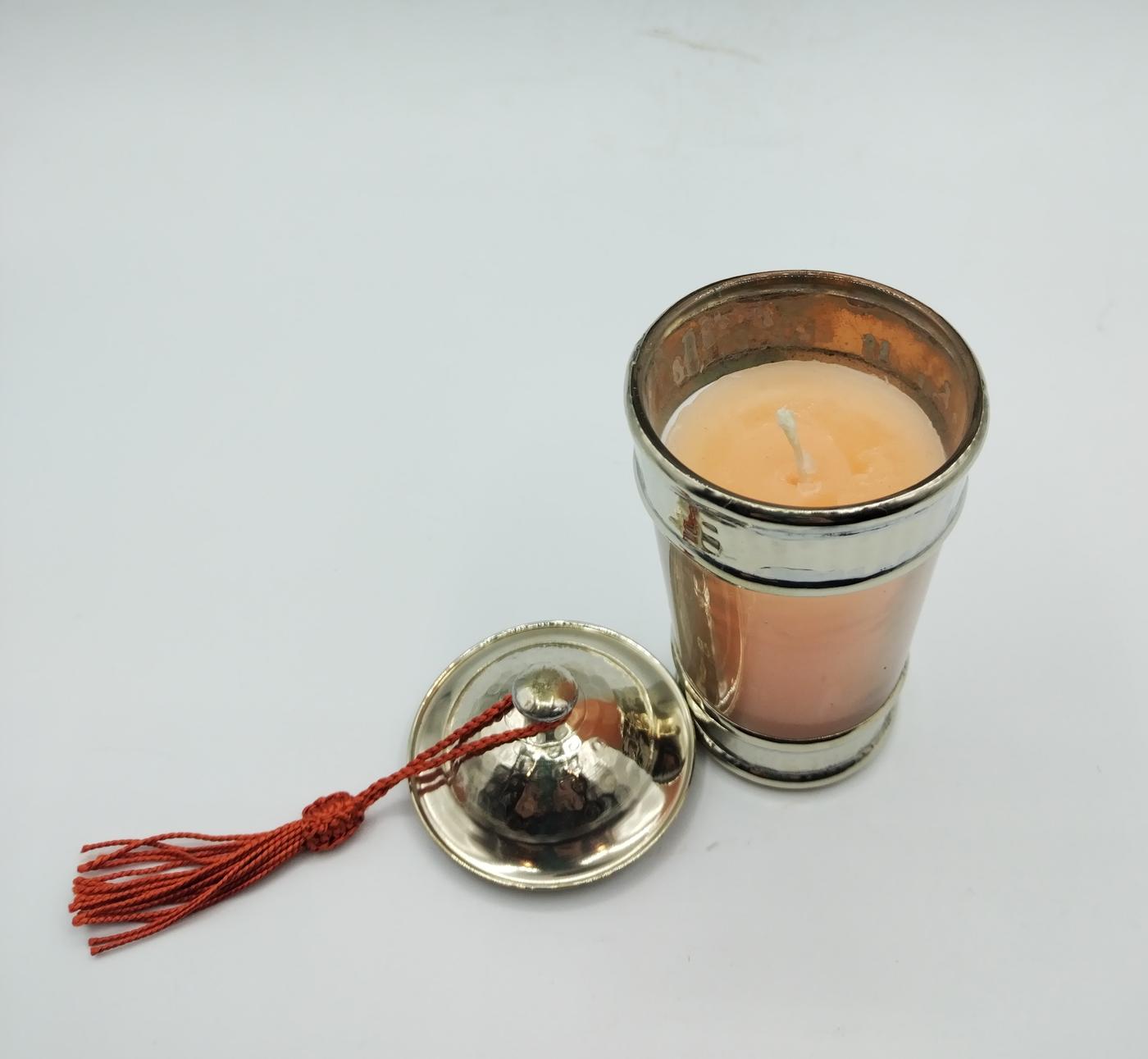 Candela arancione profumata, realizzata in Marocco da artigiani locali, con contenitore in vetro decorato con argentone sbalzato