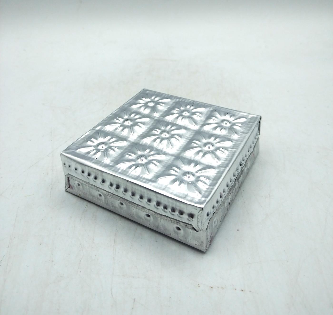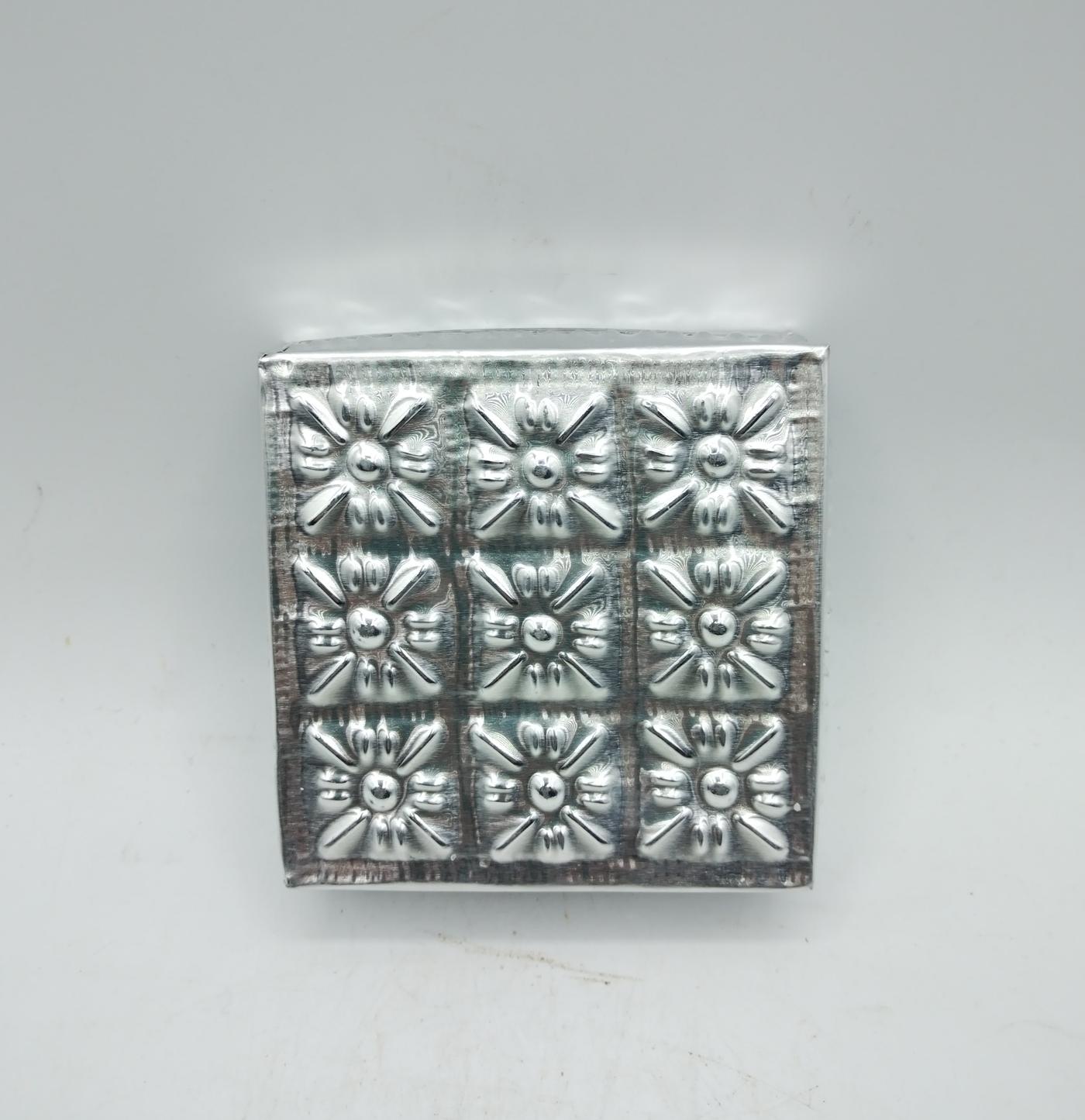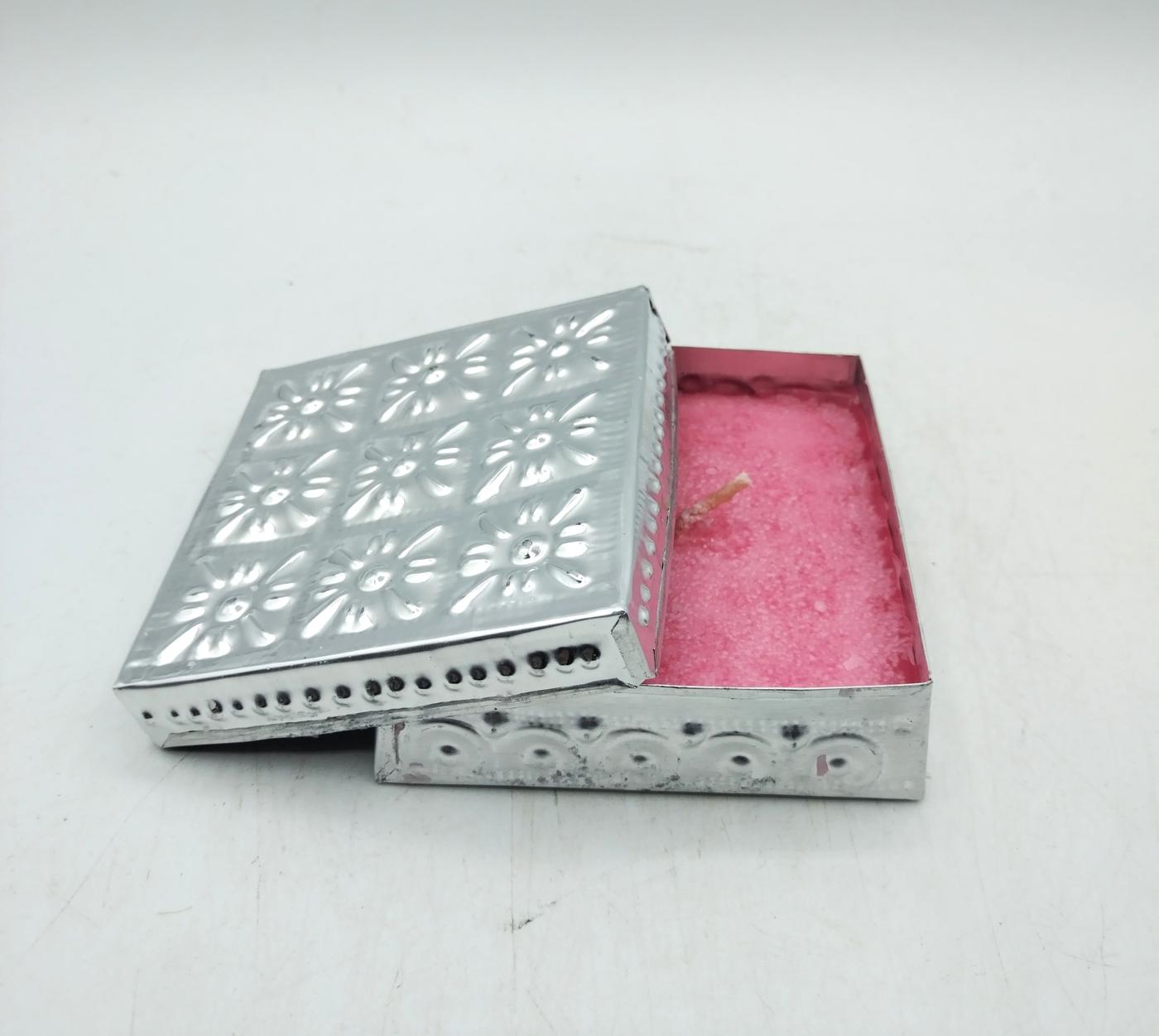 Scatola in latta sbalzata a mano di forma quadrata realizzata in Indonesia con all’interno una candela profumata di color rosso