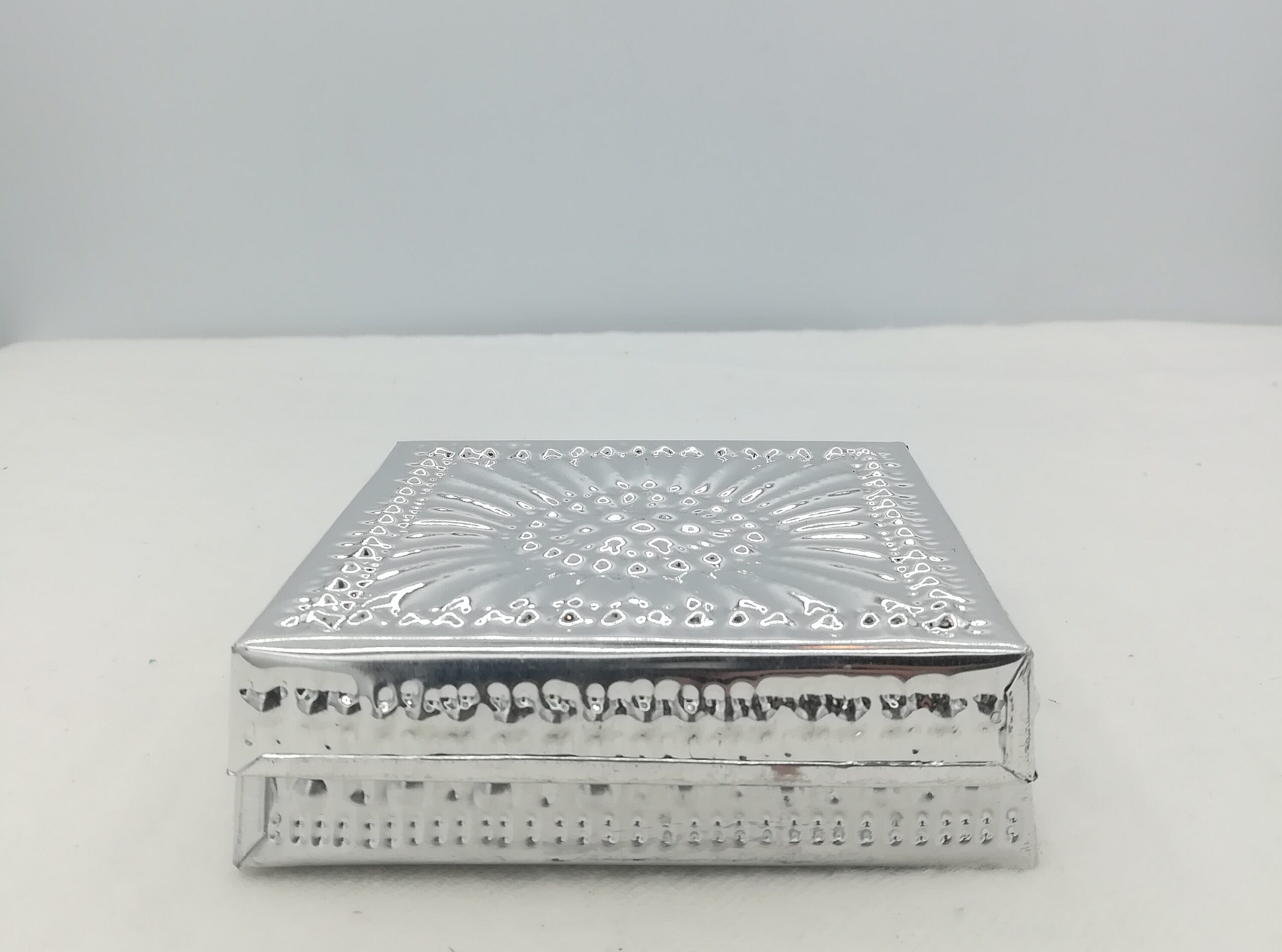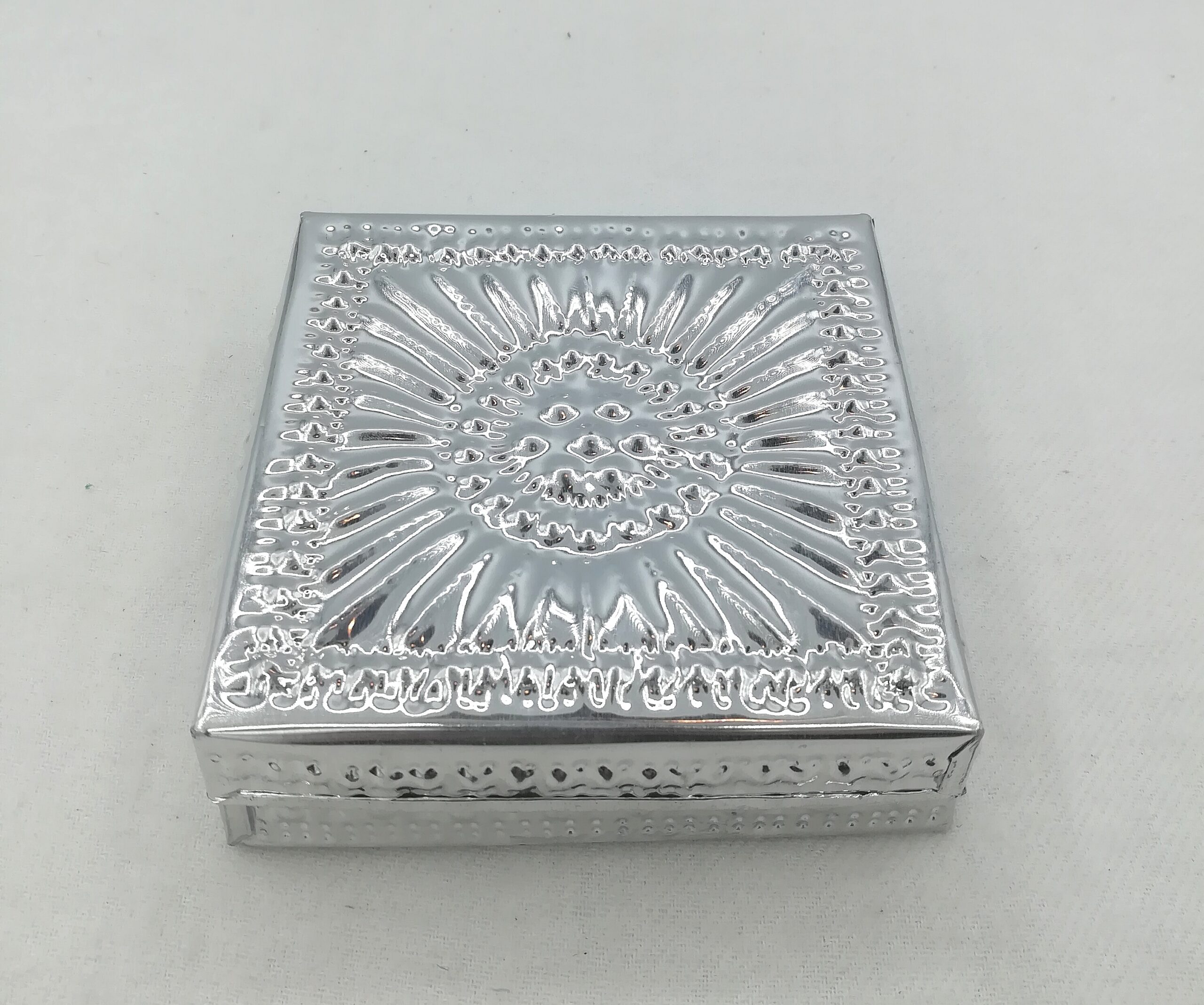 La latta è lavorata con la tecnica dello sbalzo, una tradizione artigianale antica, che conferisce alla superficie rilievi raffinati e intricati, fatti di motivi floreali e geometrici.