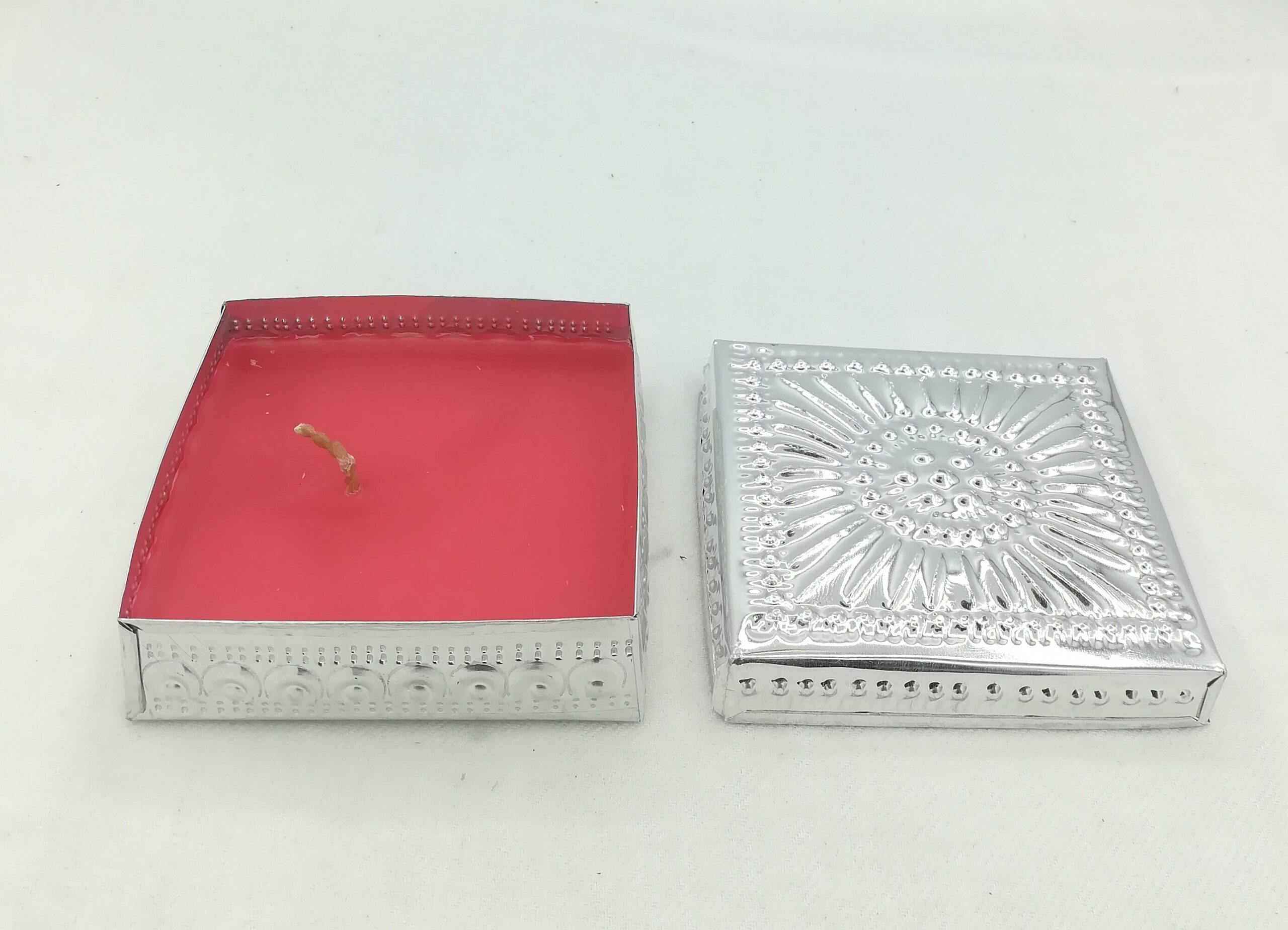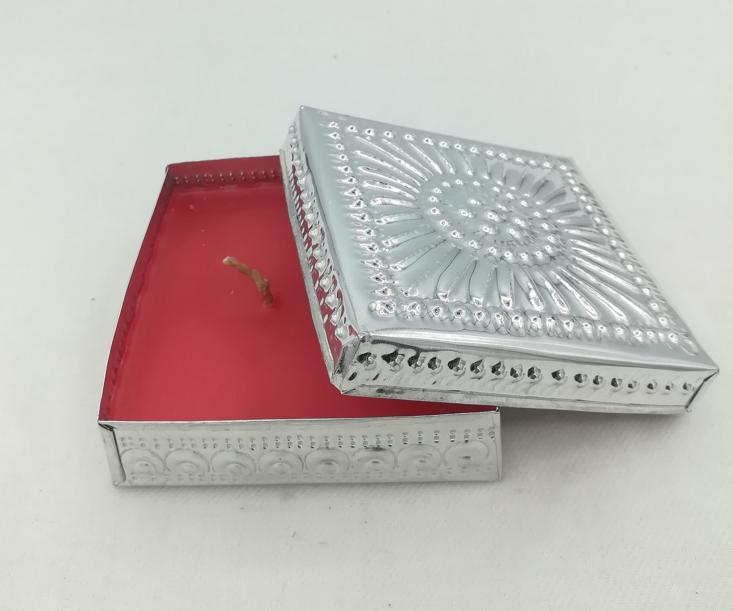 Scatola in latta sbalzata a mano di forma quadrata realizzata in Indonesia con all’interno una candela profumata di colore rosso