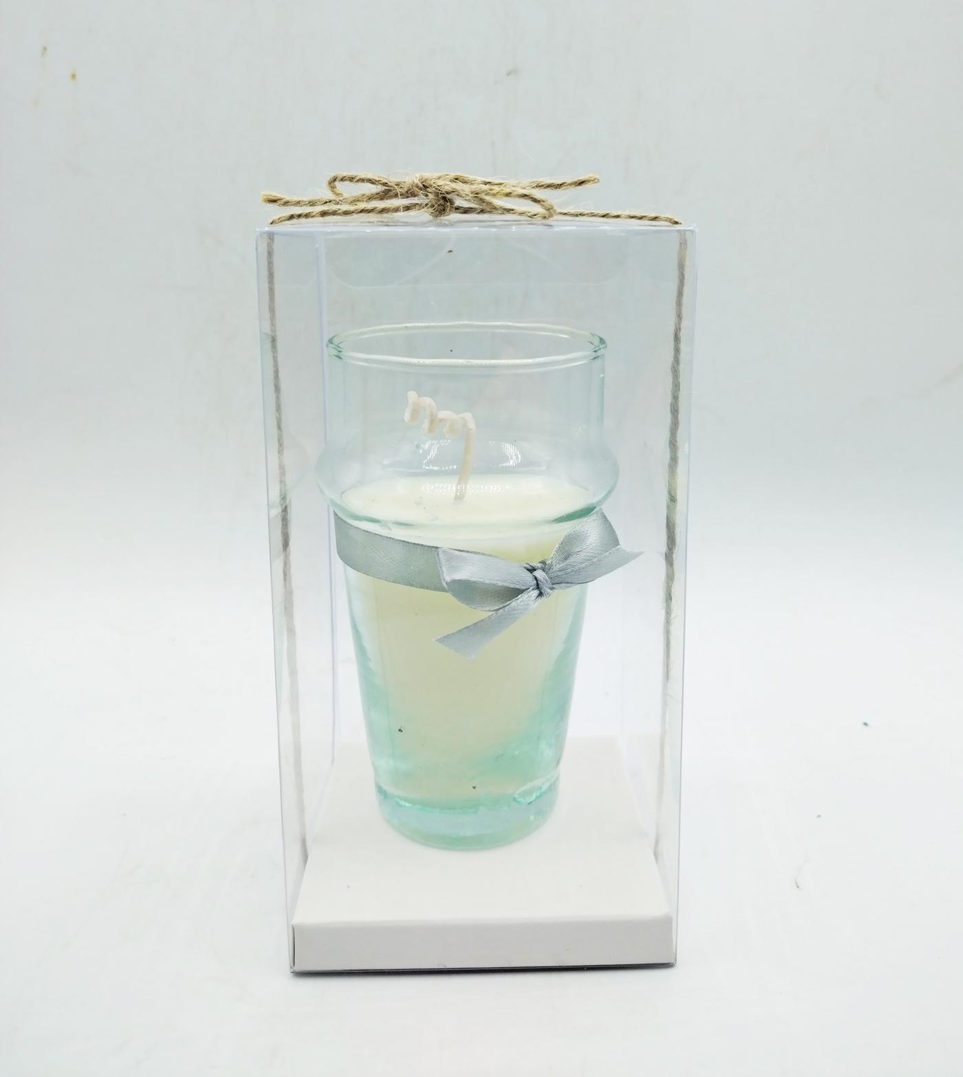 Candela profumata realizzata con bicchiere in vetro trasparente marocchino, rifinito con un nastro in raso
